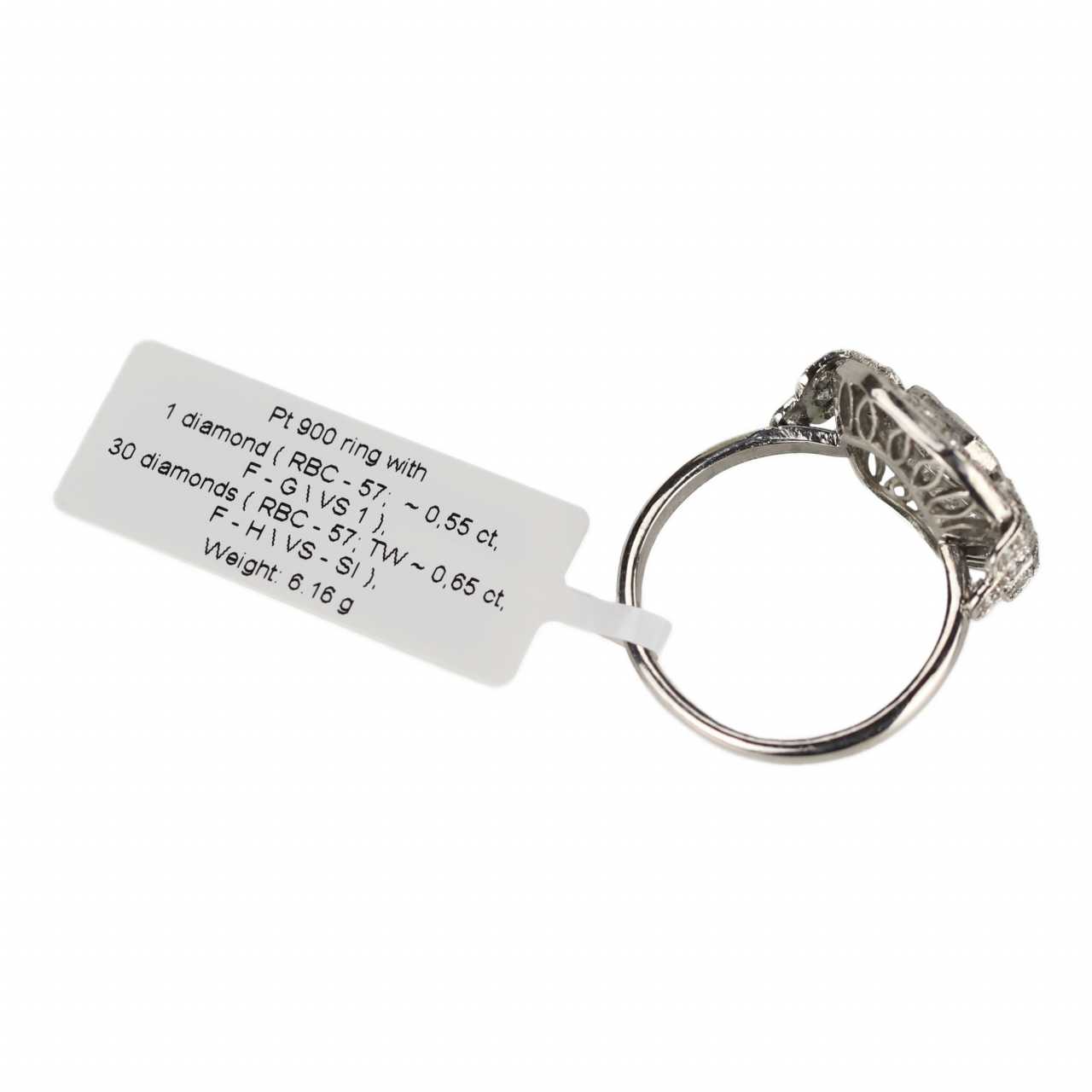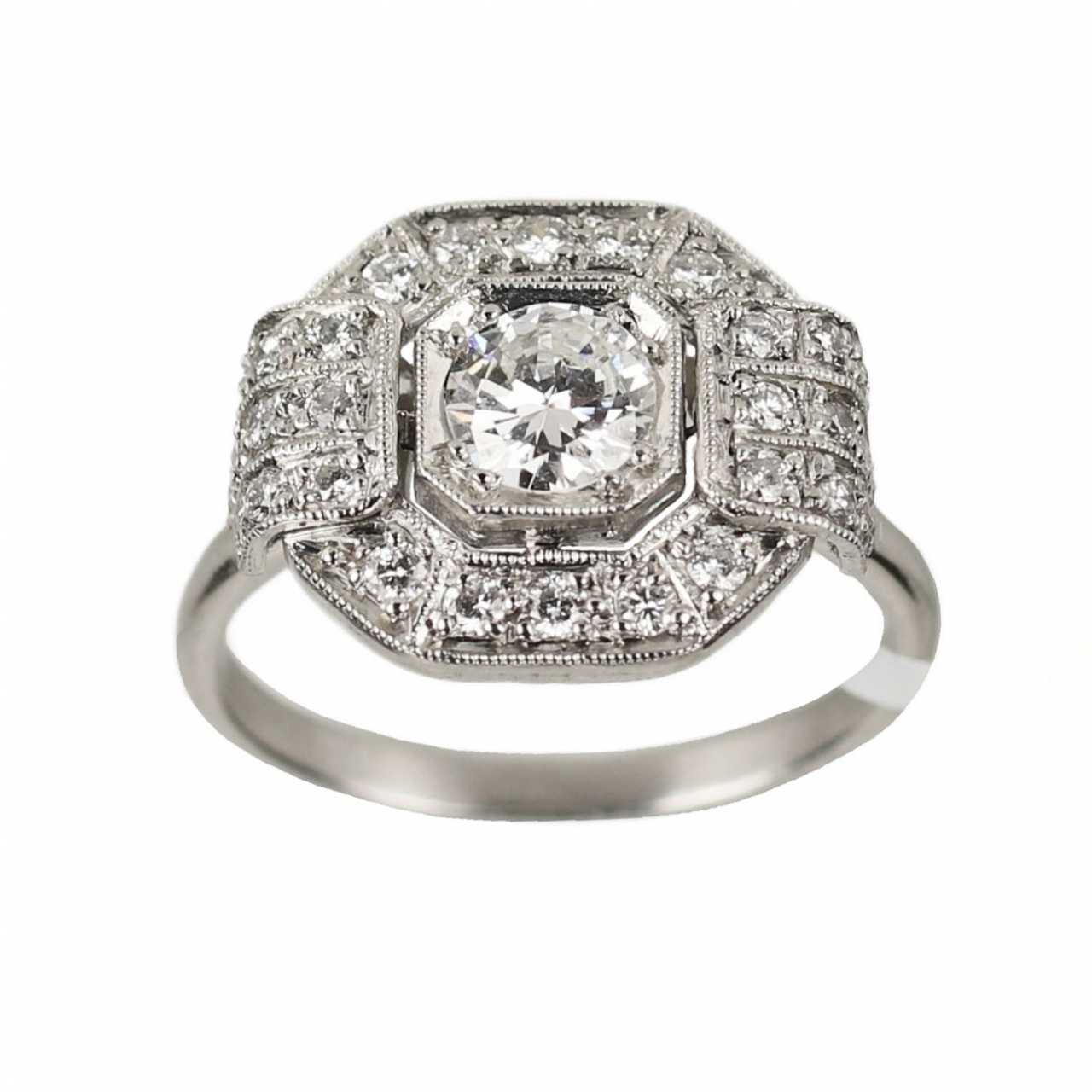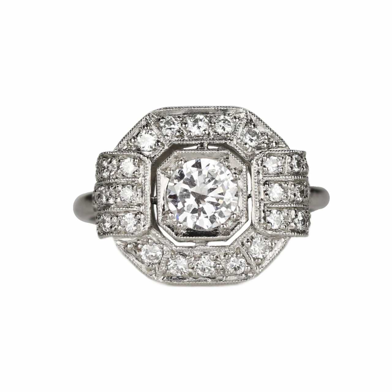 Octagonal platinum ring with a central diamond of 0.55 carats and 30 diamonds totaling 0.65 carats, with side plates in three bands. The pure embodiment of Art Deco of the 1930-150s. Ring size: 17. Weight: 6.16 gr.