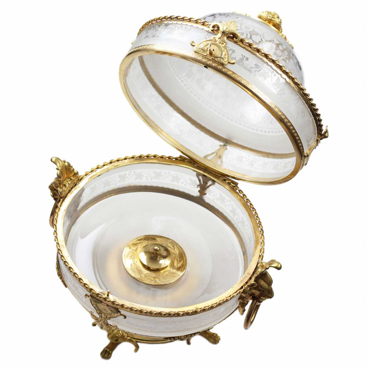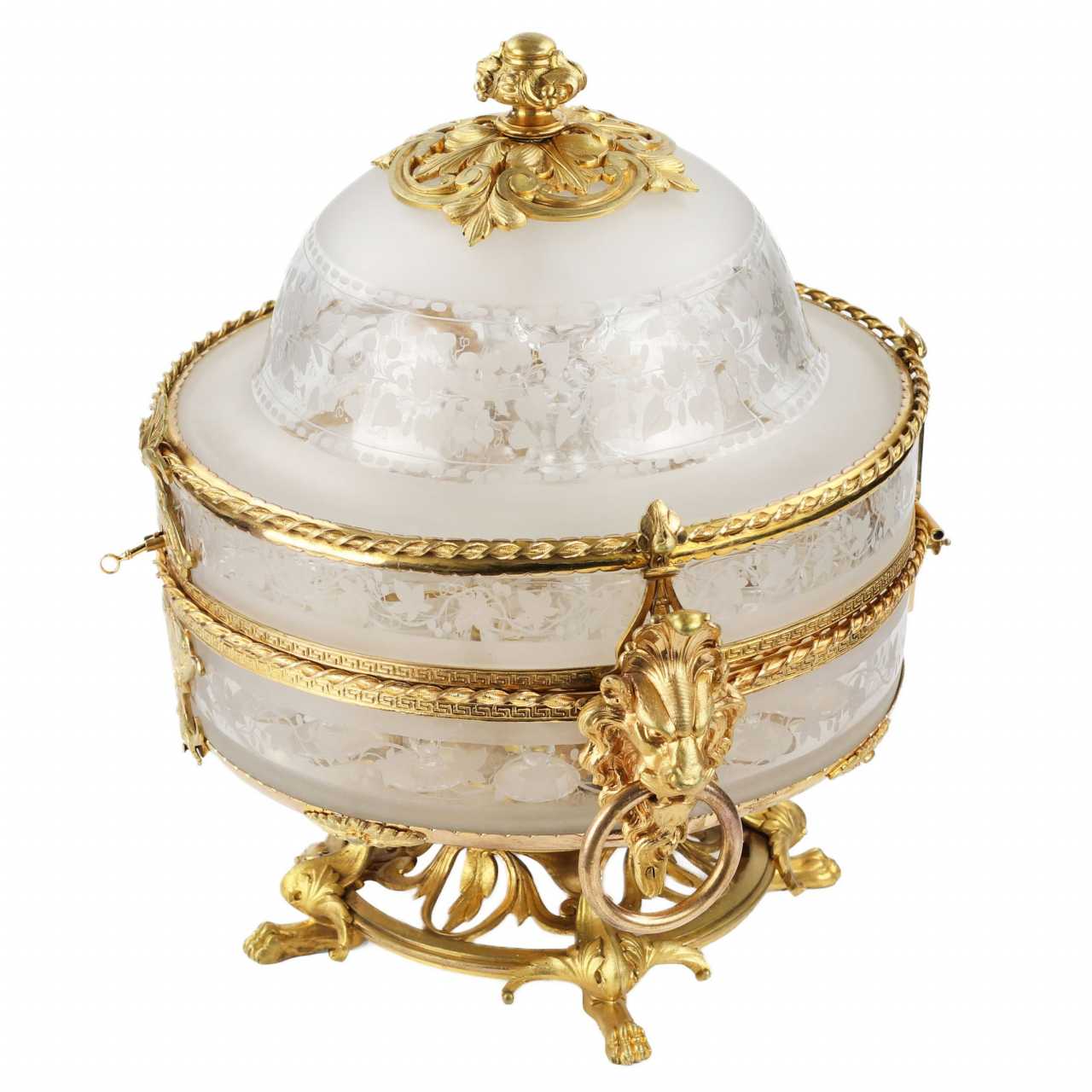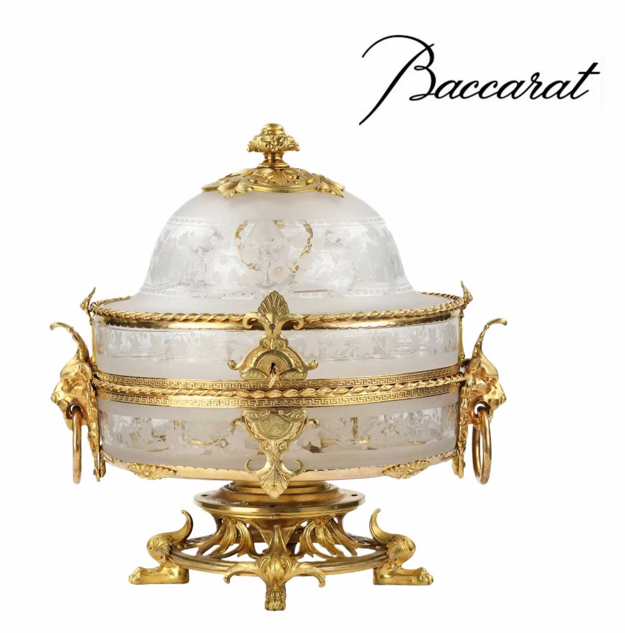 A magnificent, aristocratic liqueur bar, spherical in shape, made of Baccarat glass in a gilded bronze case, Belle Époque period. It is a unique ensemble of 4 decanters and 16 conical glasses of the finest glass with lace vine decoration. Placed on a gilded tray, they form the core of a glass sphere with a bell-shaped lid on a hinged mechanism. The original stopper ensures reliable fixation of the lid at any angle. The through motif of a grapevine, frosted etched glass, is effectively complemented by gilded bronze details, combining the delicate fragility and power of a festive representation. Gilded belts with two lion mascarons holding ring-handles in the mouth rest on a pedestal of four lion paws. A wonderful and irreplaceable attribute of a guest room, leisurely conversation, and an aristocratic lifestyle. Baccarat. Late 19th century. Closed dimensions. Height: 37 cm. Diameter: 30 cm