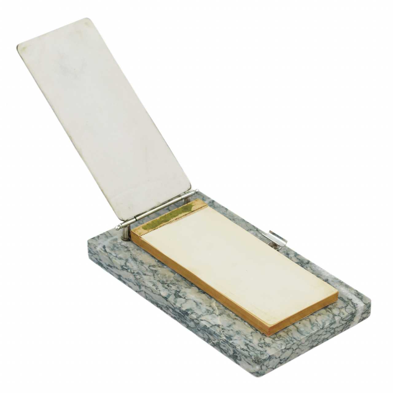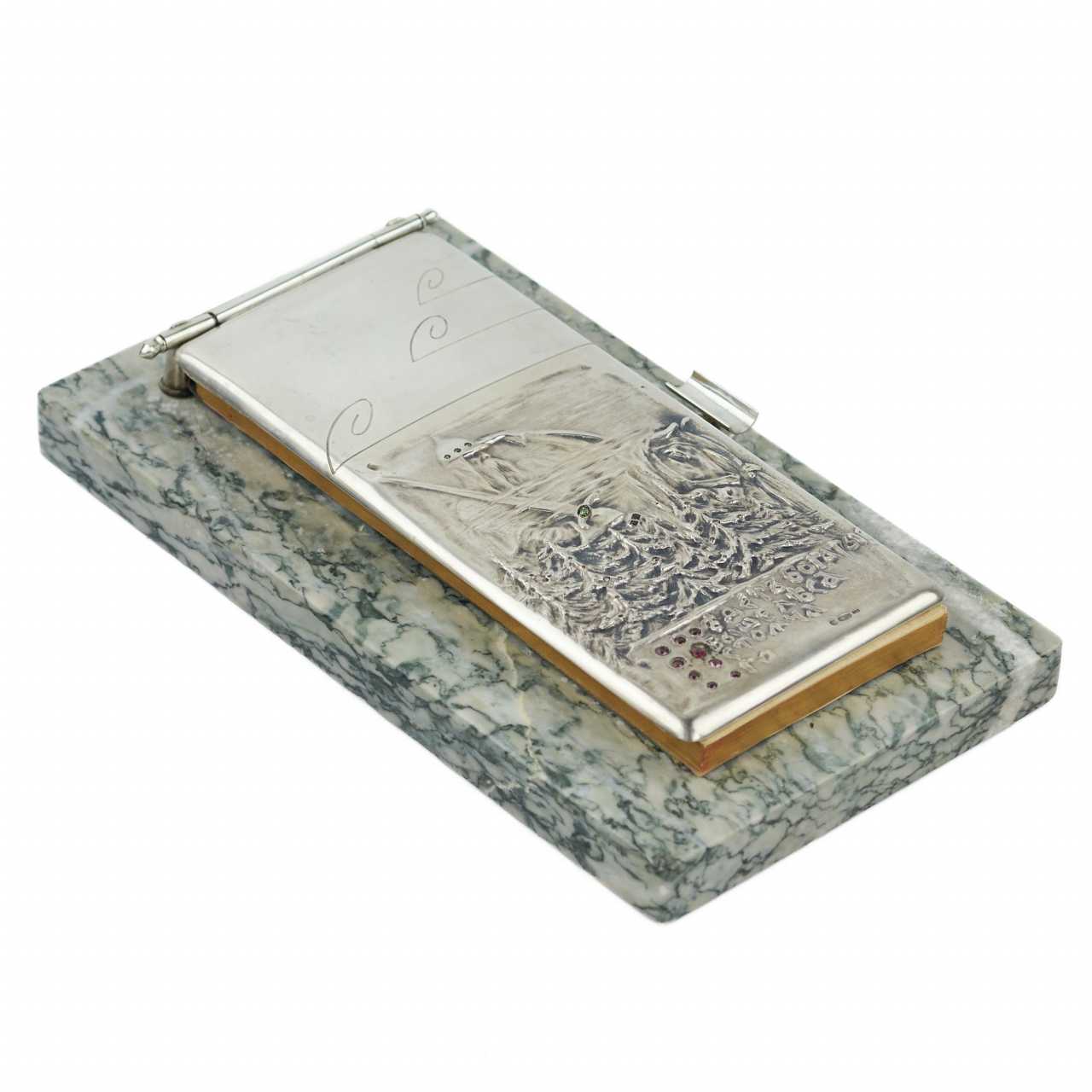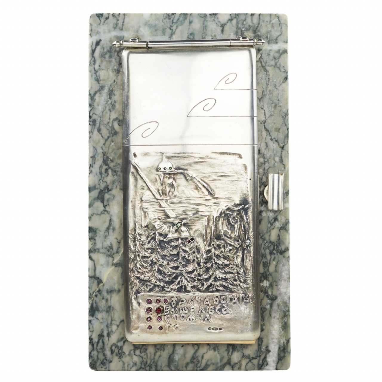 A rare cabinet object — a silver-topped desk notepad mounted on a solid green onyx base, crafted in the Old Russian style by the Moscow workshop of Petr Milyukov. The cover features a detailed repoussé depiction of a majestic bogatyr (epic hero) riding through a dense forest. The composition is enriched with Ural semi-precious stones, inset into the warrior’s helmet, armor, forest foliage and the stylized inscription.The lower part of the relief bears an archaic inscription in Church Slavonic script:“The Bogatyr Rides Higher Than the Standing Forest”,emphasizing the allegorical grandeur of the figure, whose stature dwarfs the very woods he traverses.The interior holds a complete block of antique gilt-edged paper sheets. The notepad is fully functional and serves as an exceptional example of Russian decorative art.Marks:Moscow assay mark with a woman’s head in kokoshnik facing right, within an oval cartouche with silver standard “84”; maker’s mark “ПМ” (PM) — Petr Milyukov, Moscow silversmith and workshop owner.Dimensions:Notepad: Length 19 cm, Width 9 cm.Onyx base: 24.5 × 13.5 cmWeight: 2185 gCondition:Good condition consistent with age. Minor signs of use. All decorative elements, stones and inner paper block present. Hinges and clasp mechanism function properly.Provenance:Private collection.