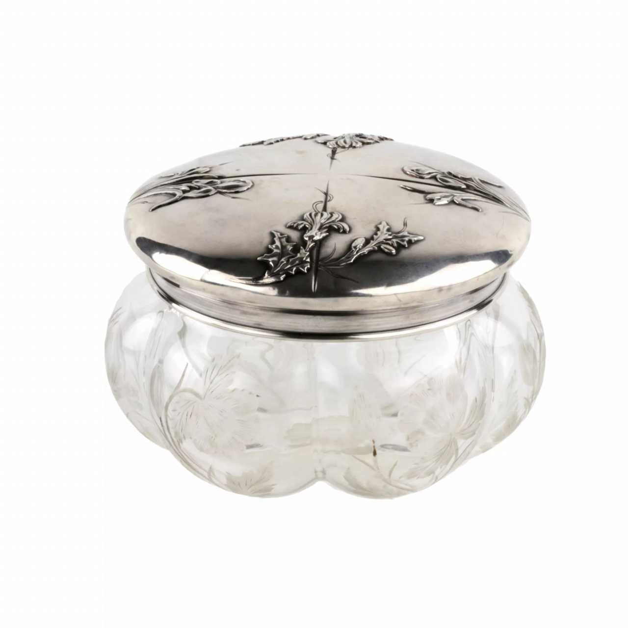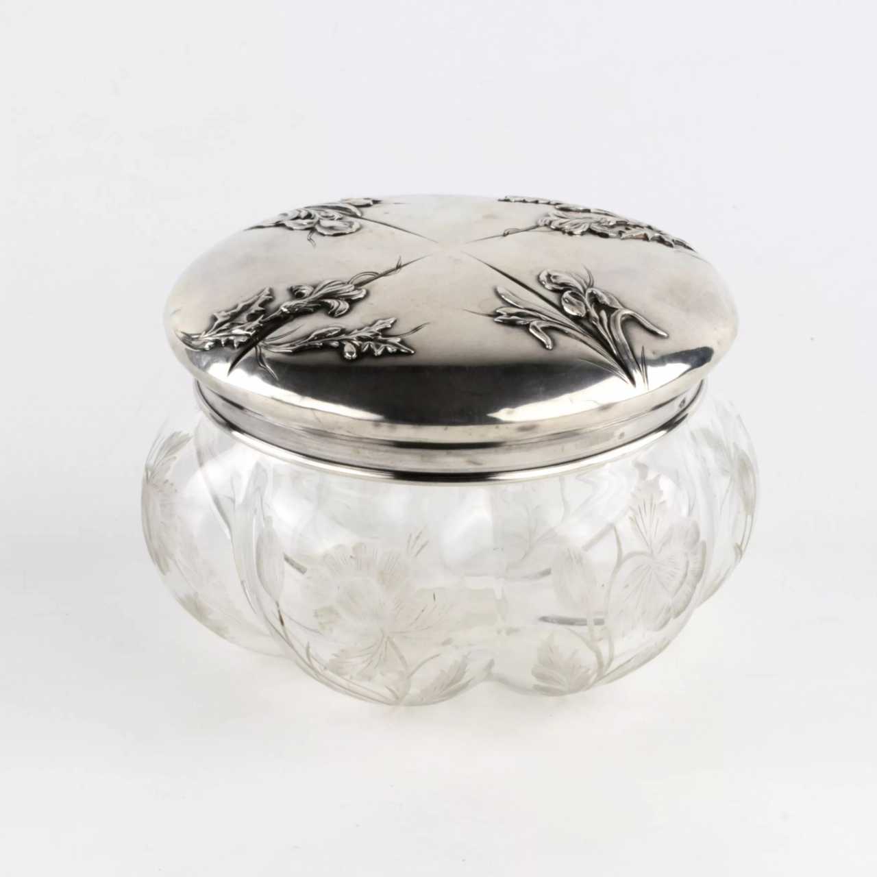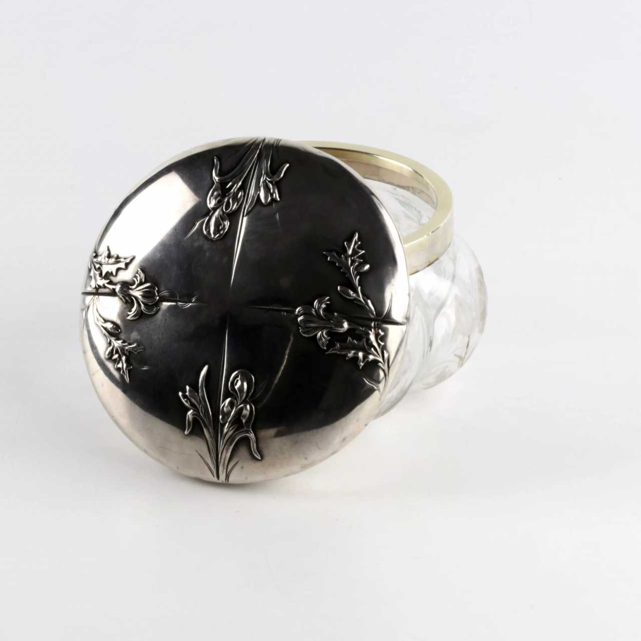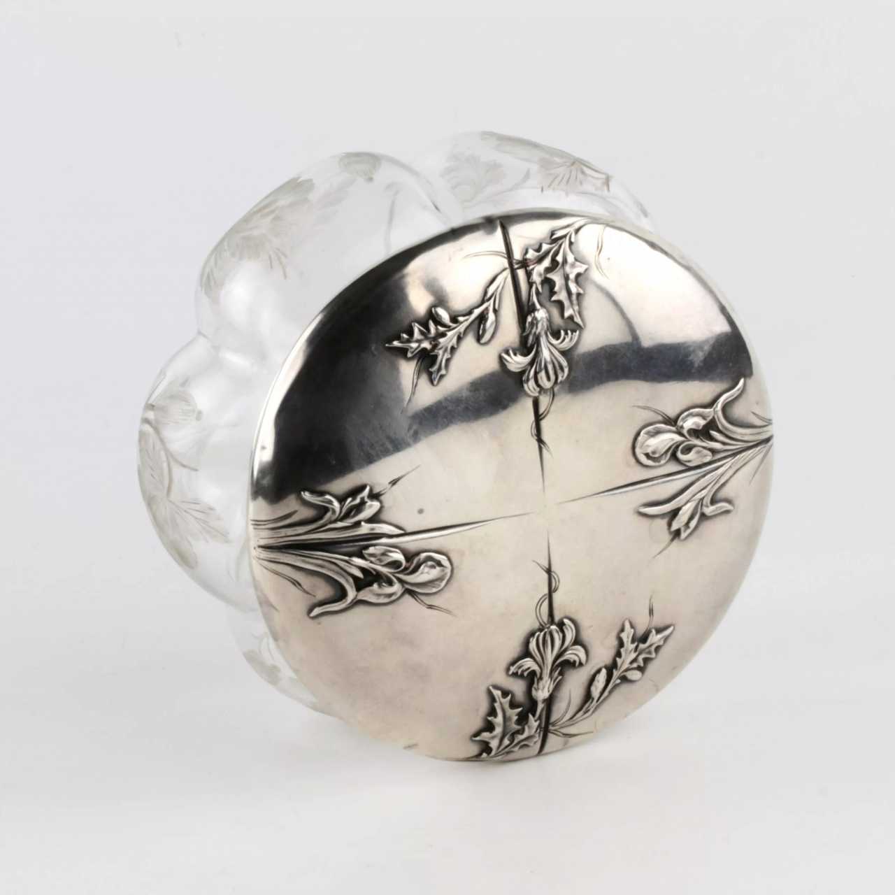 French glass bonbonniere with a silver lid. Late 19th century. Decorated with delicately engraved flowers on the glass and embossed irises on the lid. Sterling silver 925 (Minerva`s head in the octagon). And the brand of the LC master in a diamond. Louis Coignet. Known from 1889 to 1893.