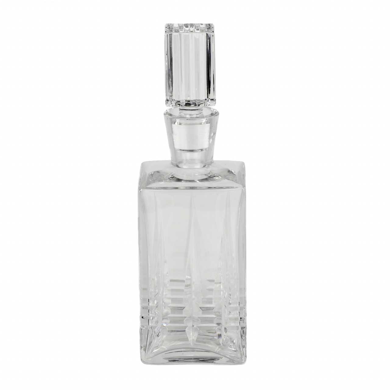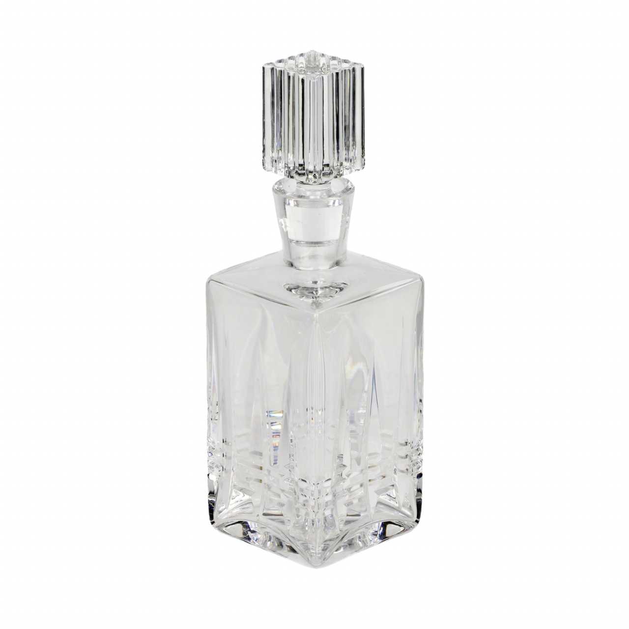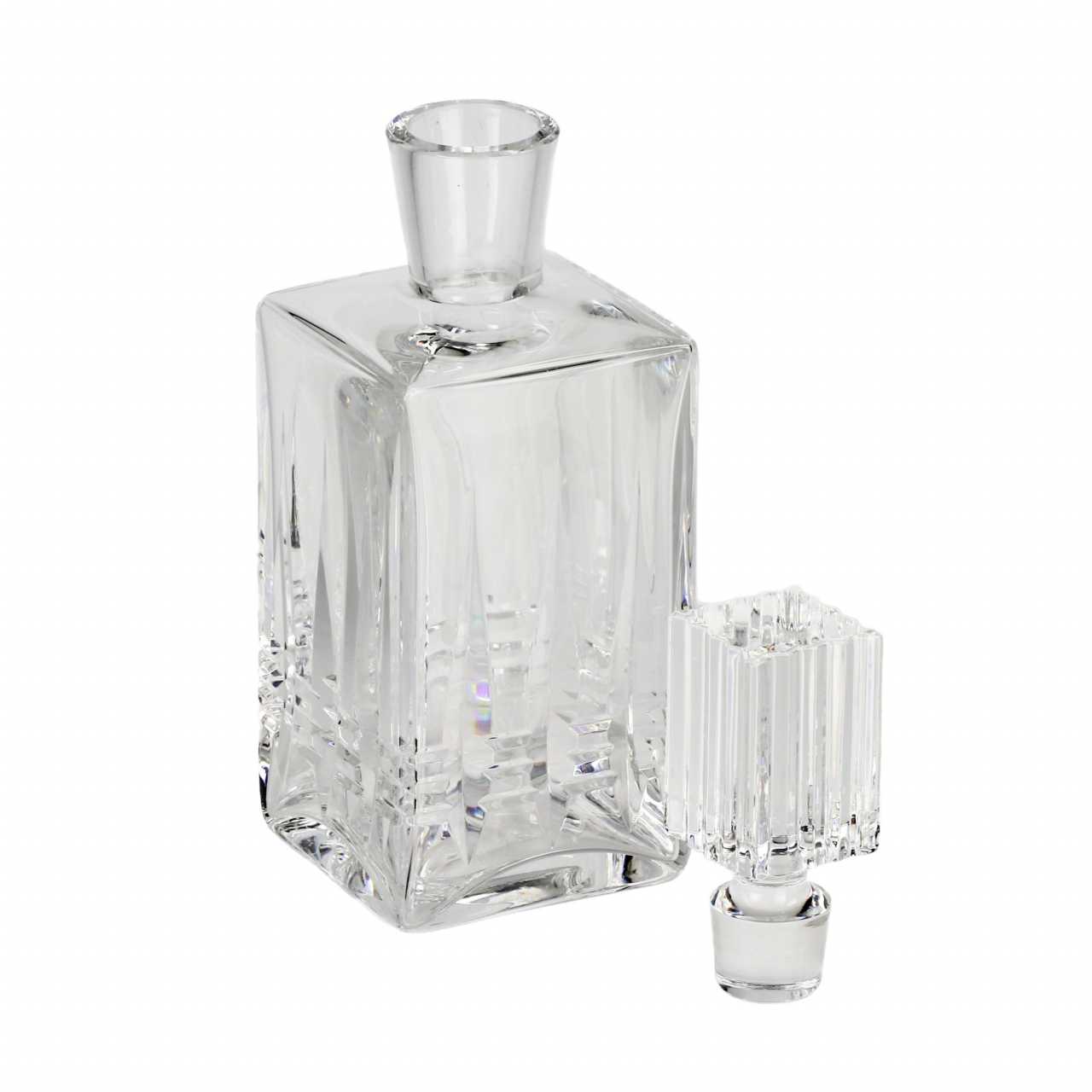 Heavy, crystal Art Deco decanter. Clear, rectangular lines, with vertical and horizontal decorative elements. 20th century. Height with stopper: 29 cm.