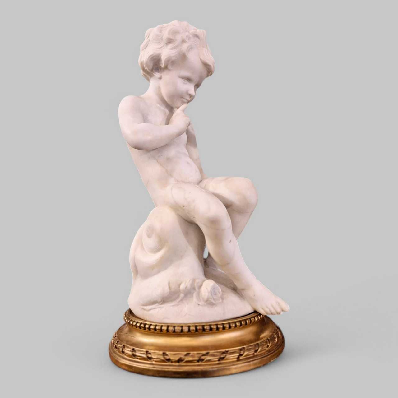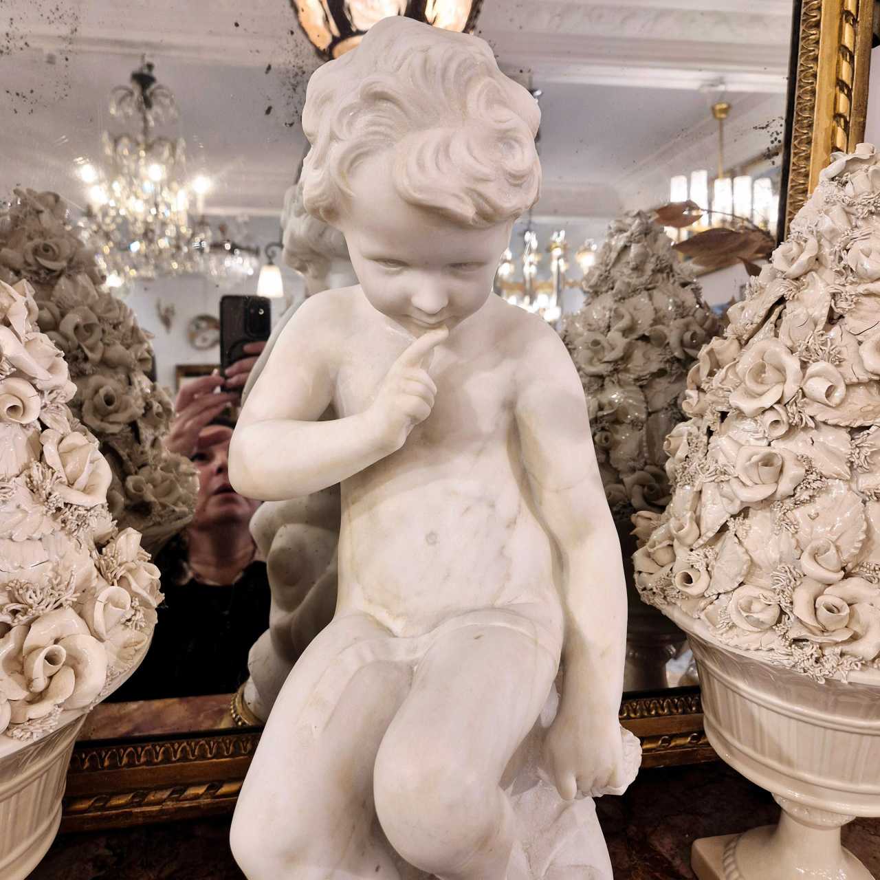White marble sculpture of Cupid based on a work by Étienne Maurice Falconet (1716-1791), the original of which is in the Louvre Museum in Paris. It is presented on a gilded wooden base with a pearl stripe.Very fine craftsmanship and high quality for this 19th-century white veined Carrara marble statue of Cupid.Height with base: 59 cm.Weight: 30 kg.The original work, also known as “LAmour menaçant”, was commissioned by Mme de Pompadour, whose plaster model was exhibited at the Salon of 1755. The marble statue, presented at the Salon two years later, adorns the gardens of the Hôtel dÉvreux, the future Palais de lÉlysée, the Marquises Parisian residence. The iconography is that of Silent Love: seated on clouds, the mischievous Cupid asks for silence as he draws an arrow from his quiver.Born into a modest family in Paris, Étienne Maurice Falconet started out as a carpenters apprentice. However, his talent for wood and clay sculpture soon attracted the attention of Jean-Baptiste Lemoyne, who took him under his wing. For almost ten years, Falconet perfected his art in his masters workshop. Thanks to François Boucher, he became close to the Marquise de Pompadour, an influential patron of the arts and favorite of Louis XV, who commissioned several works from him, including La Jardinière, intended for the dairy of her Château de Crécy.His talent was recognized in 1754 with his sculpture Milon de Crotone, which earned him membership of the Académie royale de peinture et de sculpture. The works he exhibited at the Salons of 1755 and 1757, notably LAmour menaçant - commissioned by Madame de Pompadour - placed him among the most renowned sculptors of his time. This recognition opened the doors to the royal porcelain factory at Sèvres, where he directed the sculpture workshops between 1757 and 1766. He played a major role in the success of the “cookie de Sèvres”, porcelain sculptures left unglazed and undecorated, and created over 70 figure models, featuring both feminine and childlike forms.In 1766, recommended by Frédéric Melchior Grimm and Diderot, Falconet was invited to St. Petersburg by Catherine II of Russia. After Madame de Pompadours death, he accepted the offer and left his Parisian studio in the rue dAnjou - nicknamed “la chaumière” by Diderot. In Russia, he spent twelve years creating the Monument à Pierre le Grand, an imposing equestrian statue. However, tensions with the imperial court led him to leave the country for the United Provinces, before returning to France.Back in Paris, he was appointed rector of the Académie royale de peinture et de sculpture. Here, he produced several masterpieces, including Moïse et David pour léglise Saint-Roch, Les Mangeurs de raisins, La Leçon de flûte, Pygmalion, Alexandre, LHiver and La Mélancolie. In 1780, he was replaced by Charles-Antoine Bridan as professor of sculpture.Falconet was also a theorist of his art. He translated and annotated passages on painting and sculpture from Pliny the Elders Natural History, and wrote several works on the history of art in Antiquity and in his own time. Diderot entrusted him with writing the “Sculpture” article for LEncyclopédie. In 1761, he published his Réflexions sur la sculpture, followed by other writings in six volumes from 1781.