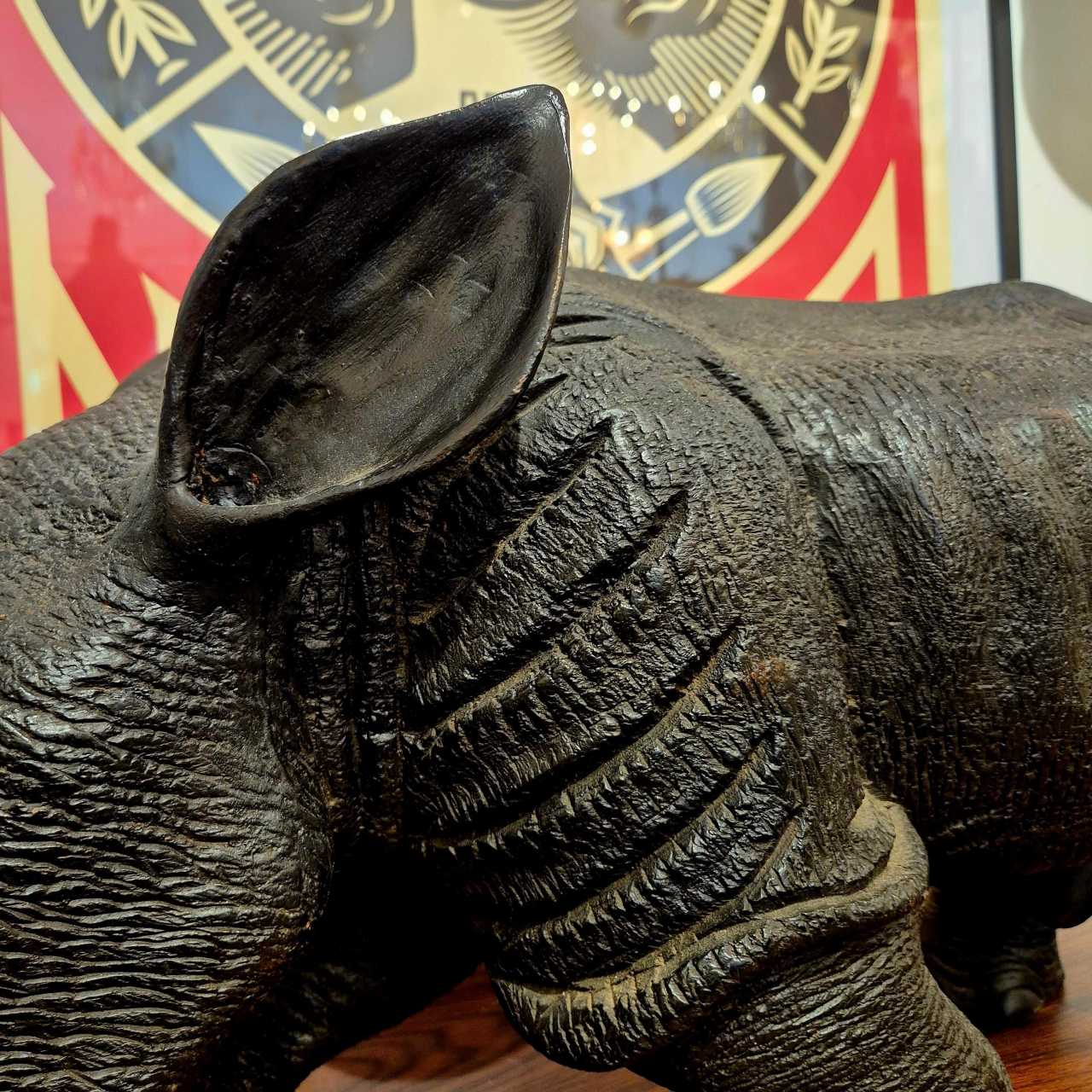 Superbe rhinocéros en bois massif sculpté : le travail de sculpture est en effet admirable par sa finesse et l’attention portée aux détails ; il présente également une magnifique patine brillante et douce à certains endroits.Une pièce de caractère étonnante et originale qui convient pour un intérieur classique comme contemporain.