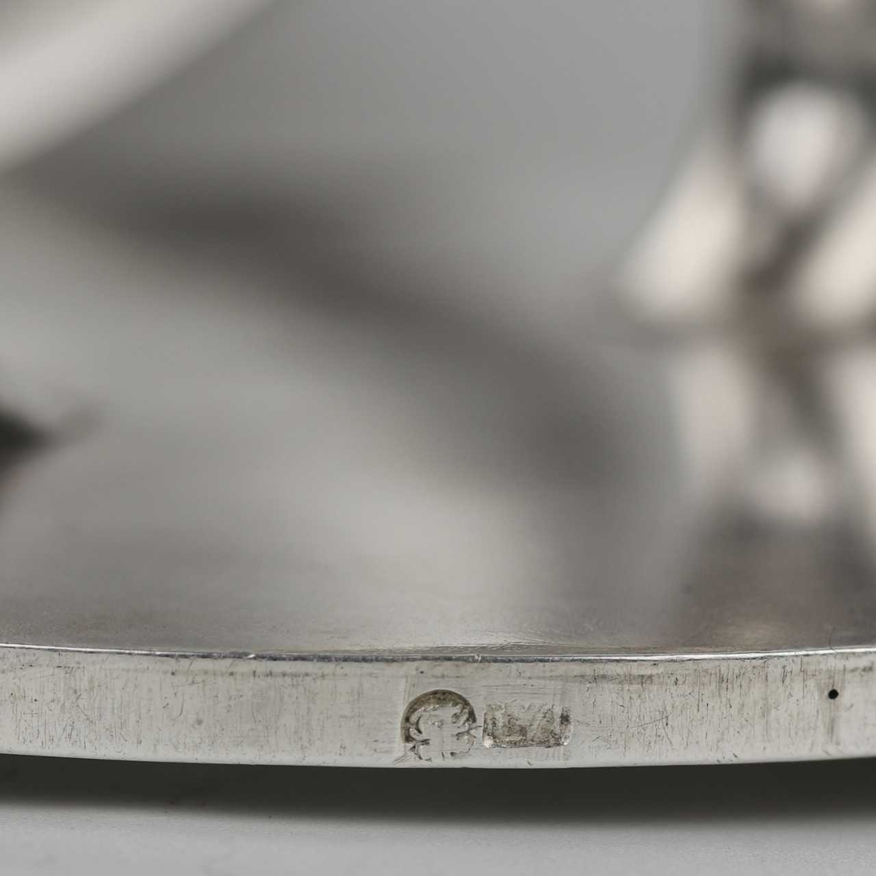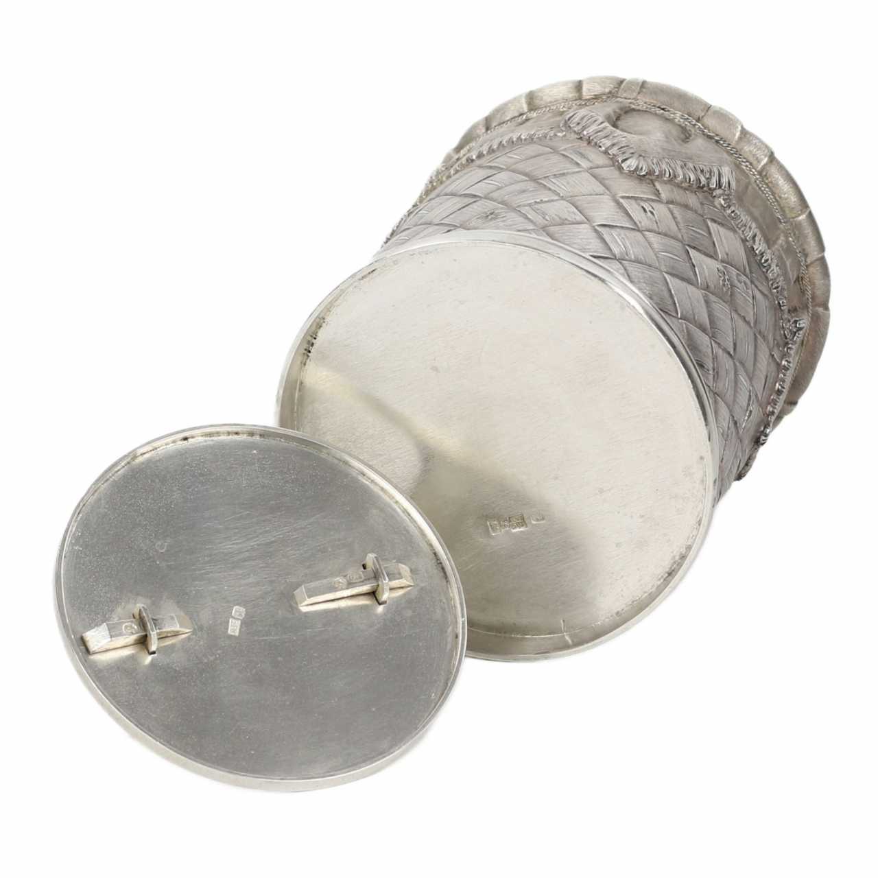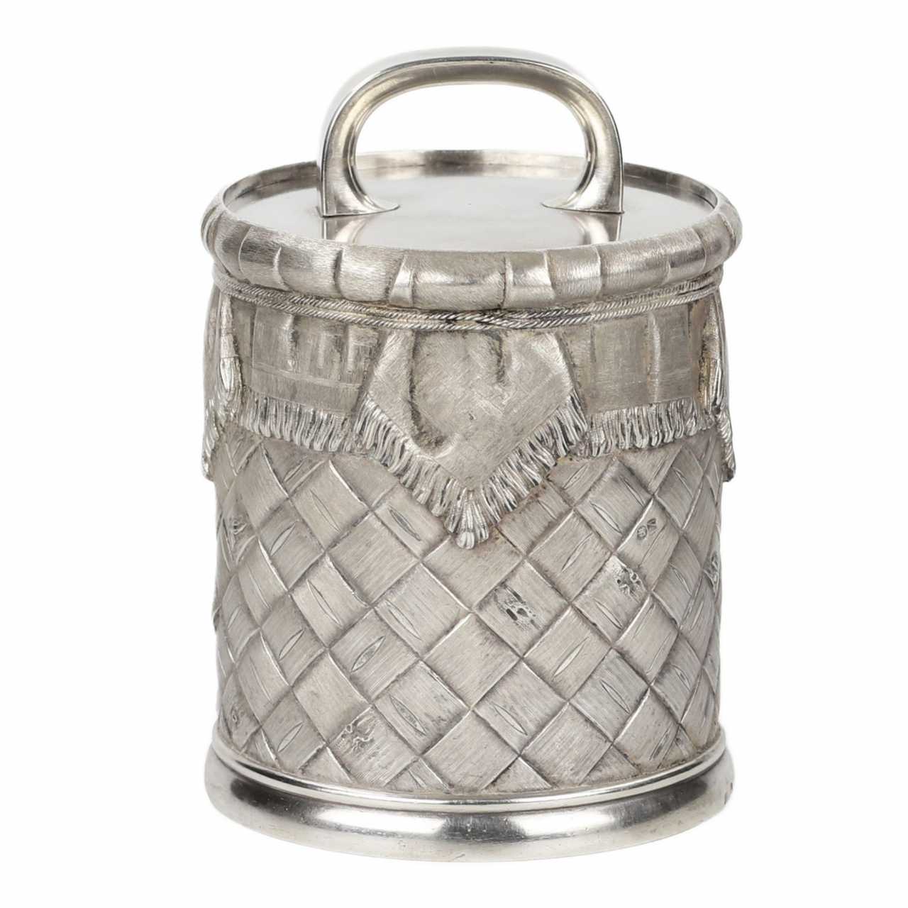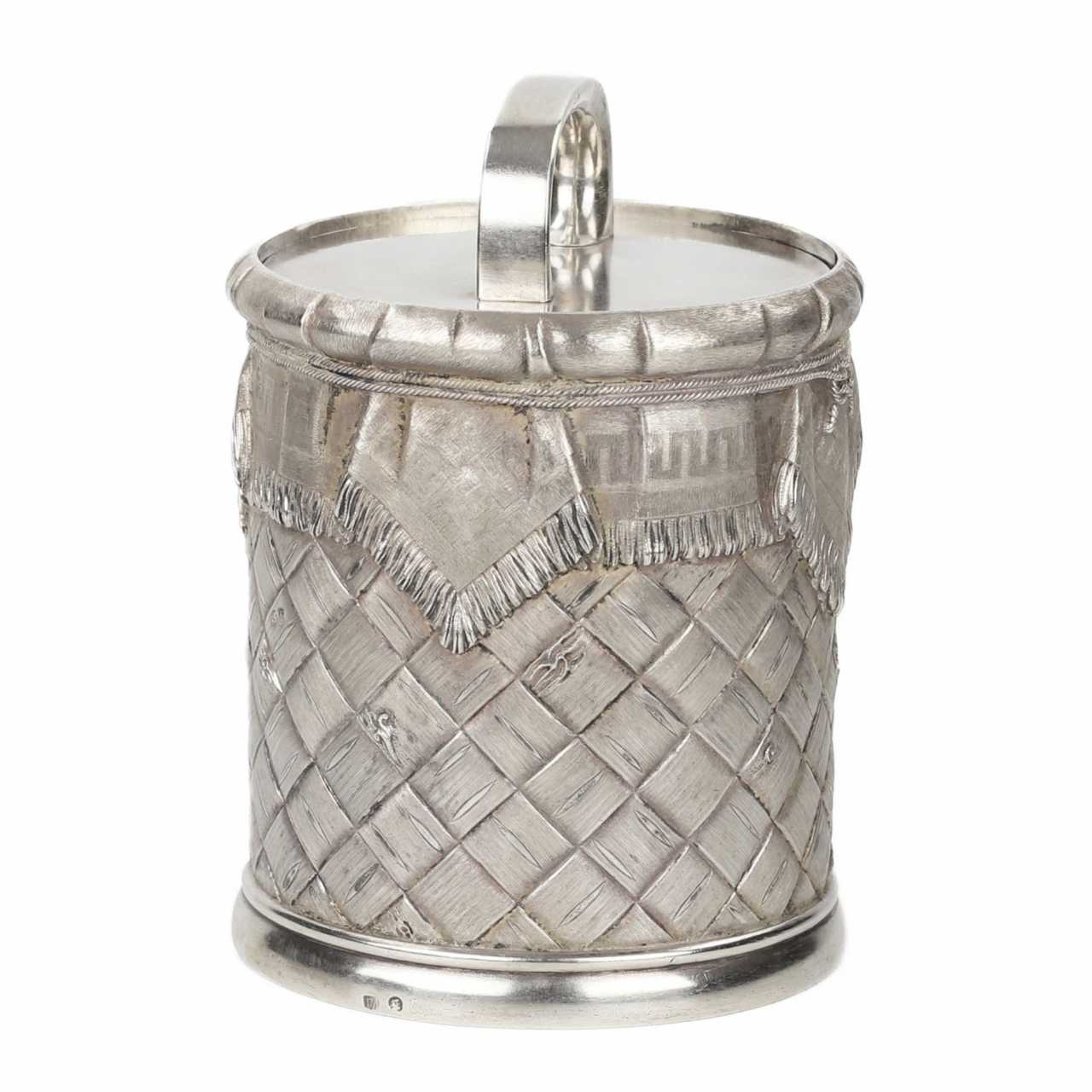 Silver caviar jar made in the form of a rustic basket with a lid, imitating relief weaving of bast. The jar is decorated with a trompe l`oeil, made in the form of a woven napkin tied with a woven rope. The napkin is decorated with a relief geometric pattern imitating Russian-style embroidery on fabric. The edges of the napkin are decorated with fringe. Silver, stamping, embossing, chasing, engraving. Russian Empire, Moscow. 1892. Hallmarks: master`s mark in the form of the letters GL in a square shield. - Lizerin Girshi Gaselevich, assay mark in the form of a fraction, in the numerator of which are the letters A.S, and in the denominator the year of assaying - 1892; silver sample - 84 in a square shield; Moscow Assay Office sign in the form of an image of St. George the Victorious on horseback (oriented to the left) in a figured shield. Assay master - Smirnov Alexander Alekseevich. Dimensions: height - 14.5 cm, weight 403 g.