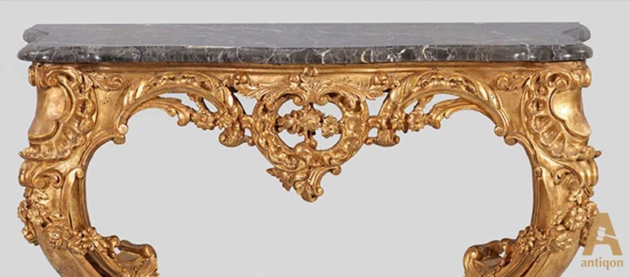 Rococo console in gilded wood with marble top, late 19th century. H-83 cm. Organized and decorated according to the law of the genre. Asymmetrical, mobile, fractional, with a rich effect of elaborate gilding. Decorated with rocaille, flowers and shells. Their chordal, symphonic sound can blow up the interior.