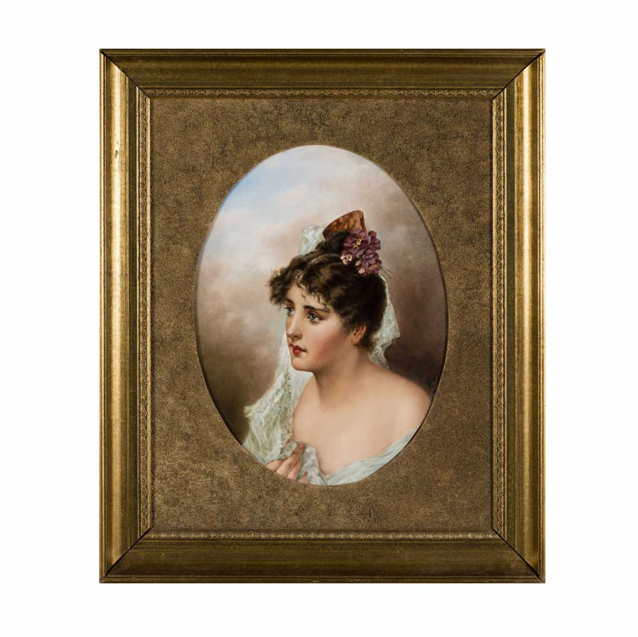 Porcelain plaque depicting a Russian girl. In the lower right corner there is a poorly readable signature in Cyrillic and the numbers 95.