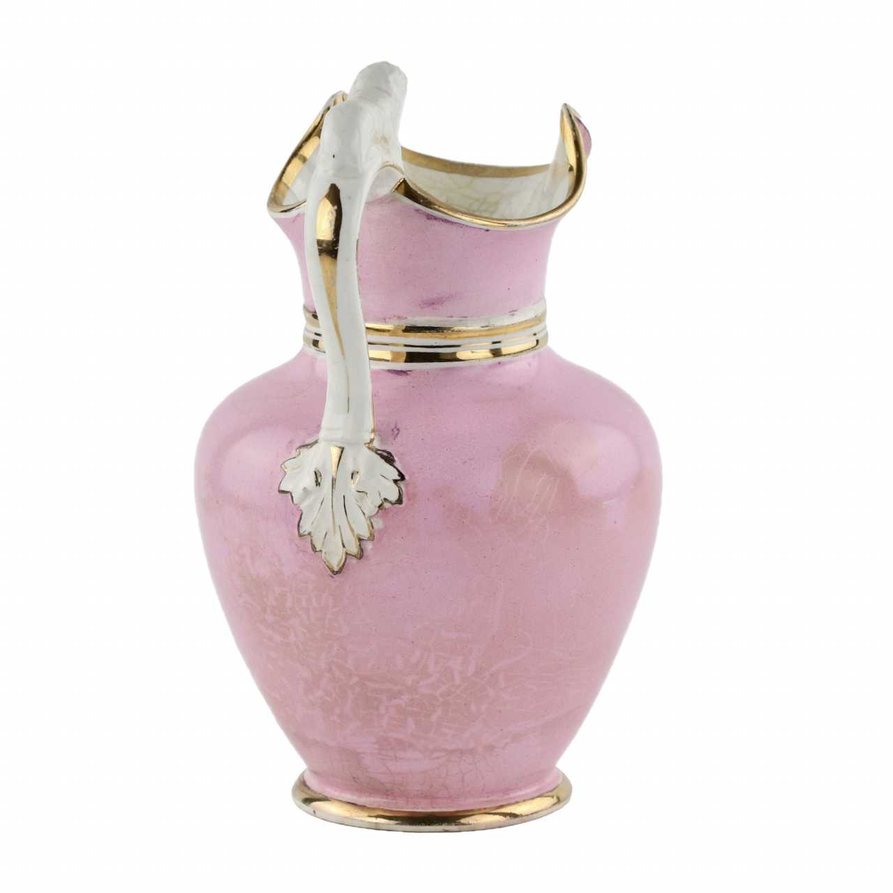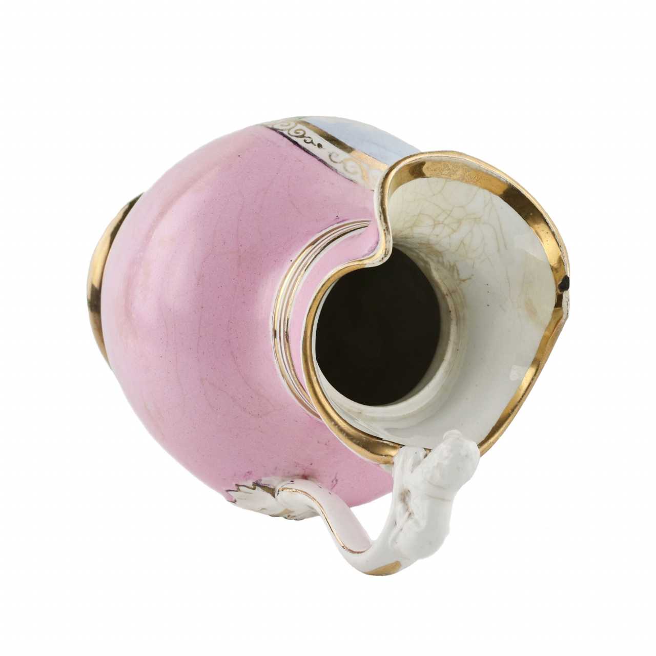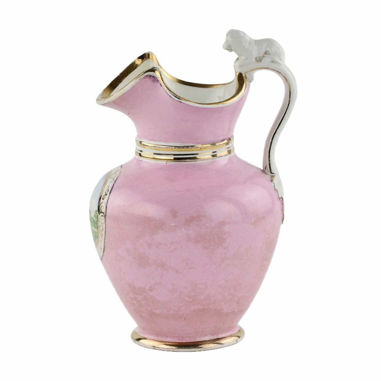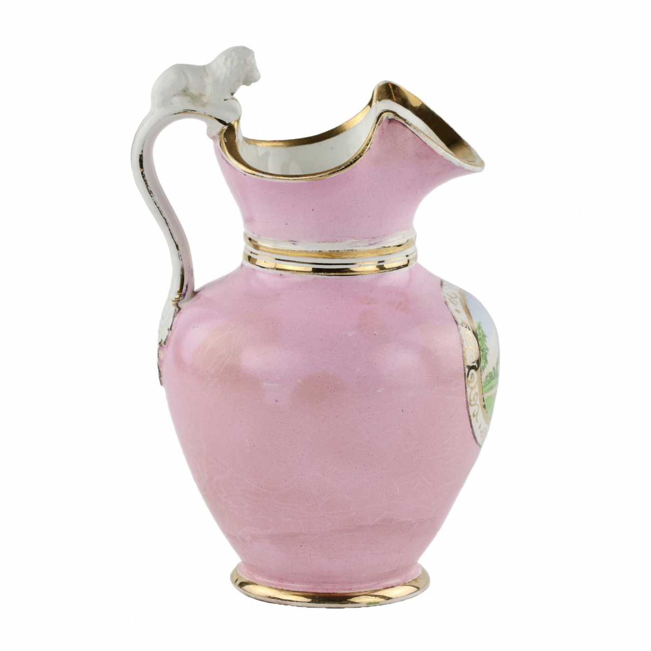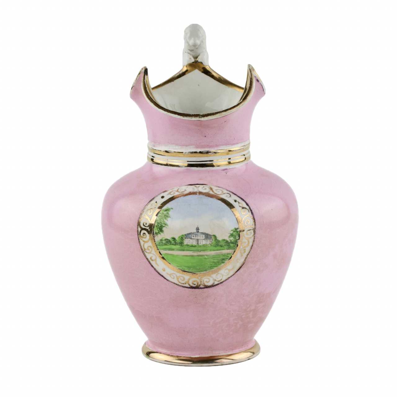 Porcelain jug with a wide undulating bell, a vignette depicting a manor and a handle with a lion. H-26 cm.