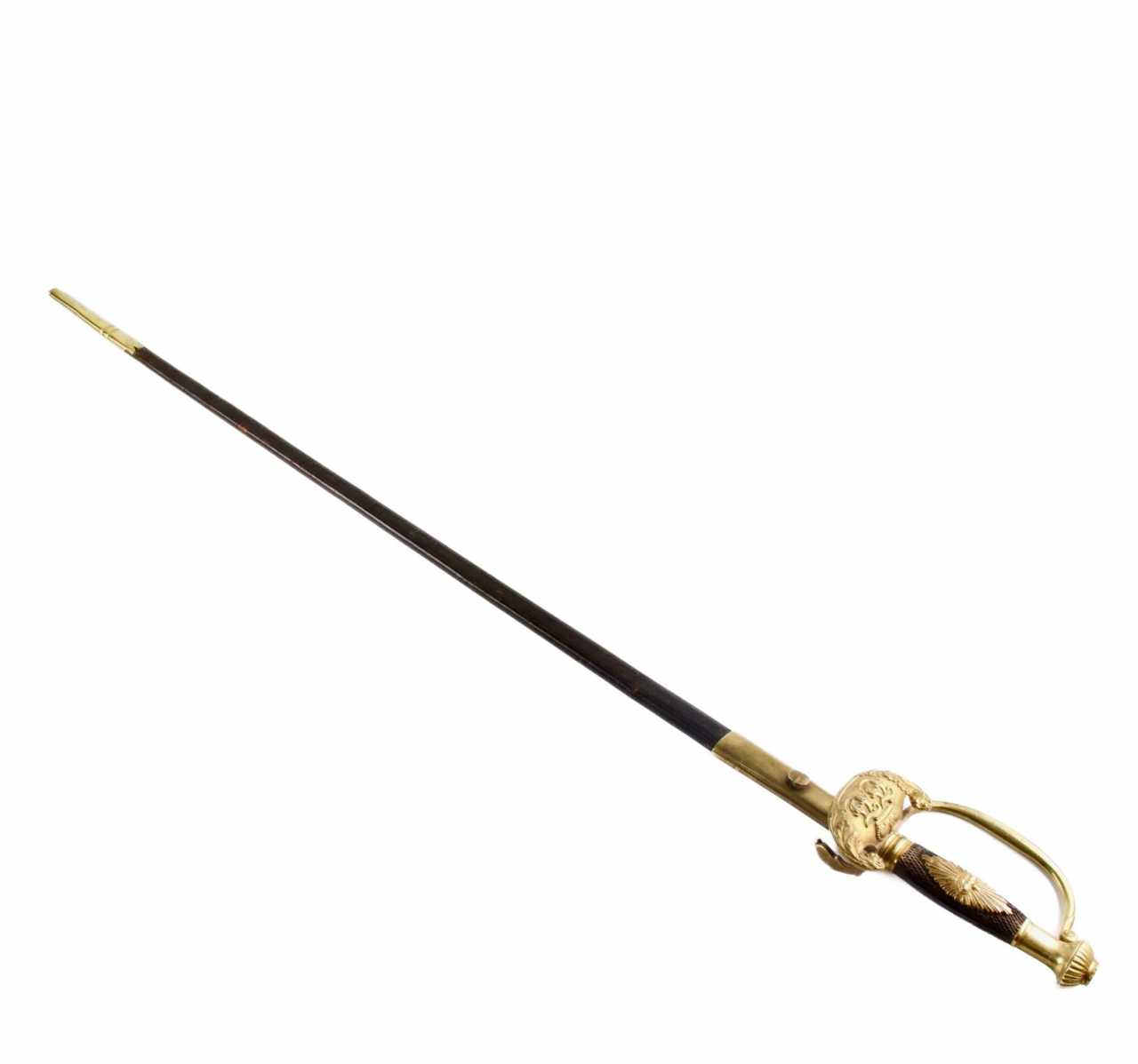 Ceremonial officer&39;s sword with a gilded hilt, with a blued and engraved blade, in a scabbard. Presumably France 19th century. Length 73 cm.