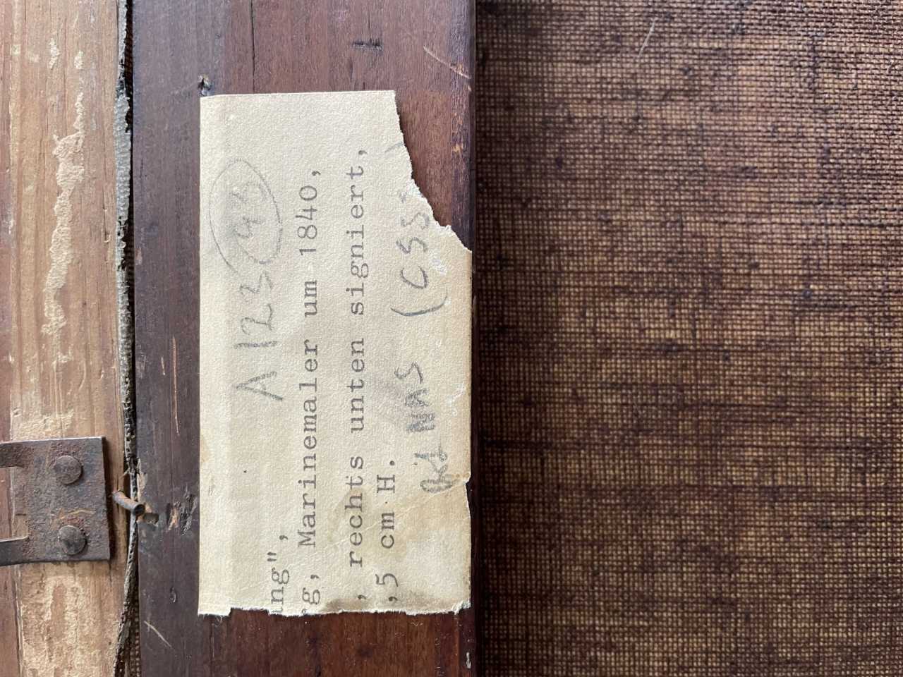 German School, Oil on Canvas. Scene of a Shipwreck. Undeciphered signature, dated 1840 on the reverse. Subject dimensions: 53.5 x 34 cm. Overall dimensions: 65 x 45.5 cm.Canvas somewhat cracked, with signs of age on the frame.