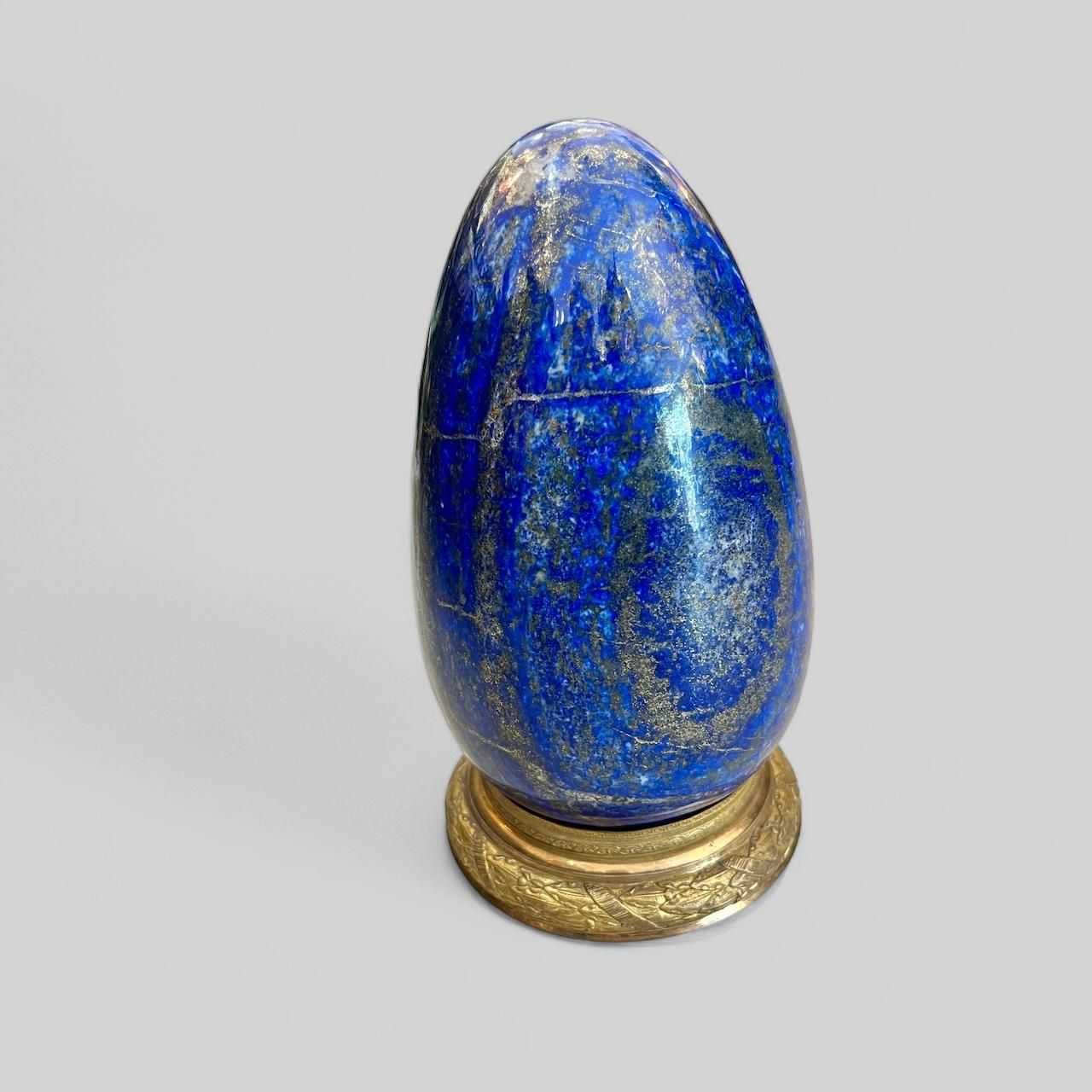 We are delighted to present you with this incredible polished egg shape of Lapis Lazuli, a deep blue metamorphic rock often used in jewelry and decoration.The sphere displays a vibrant mix of predominantly deep blue hues, interspersed with veins of white calcite and specks of golden pyrite, which are characteristic of high-quality Lapis Lazuli.The stone is mounted on a decorative gilded bronze base from 19 th century.The natural beauty and unique patterning of this stone makes it a striking decorative piece that would enhance any living space.