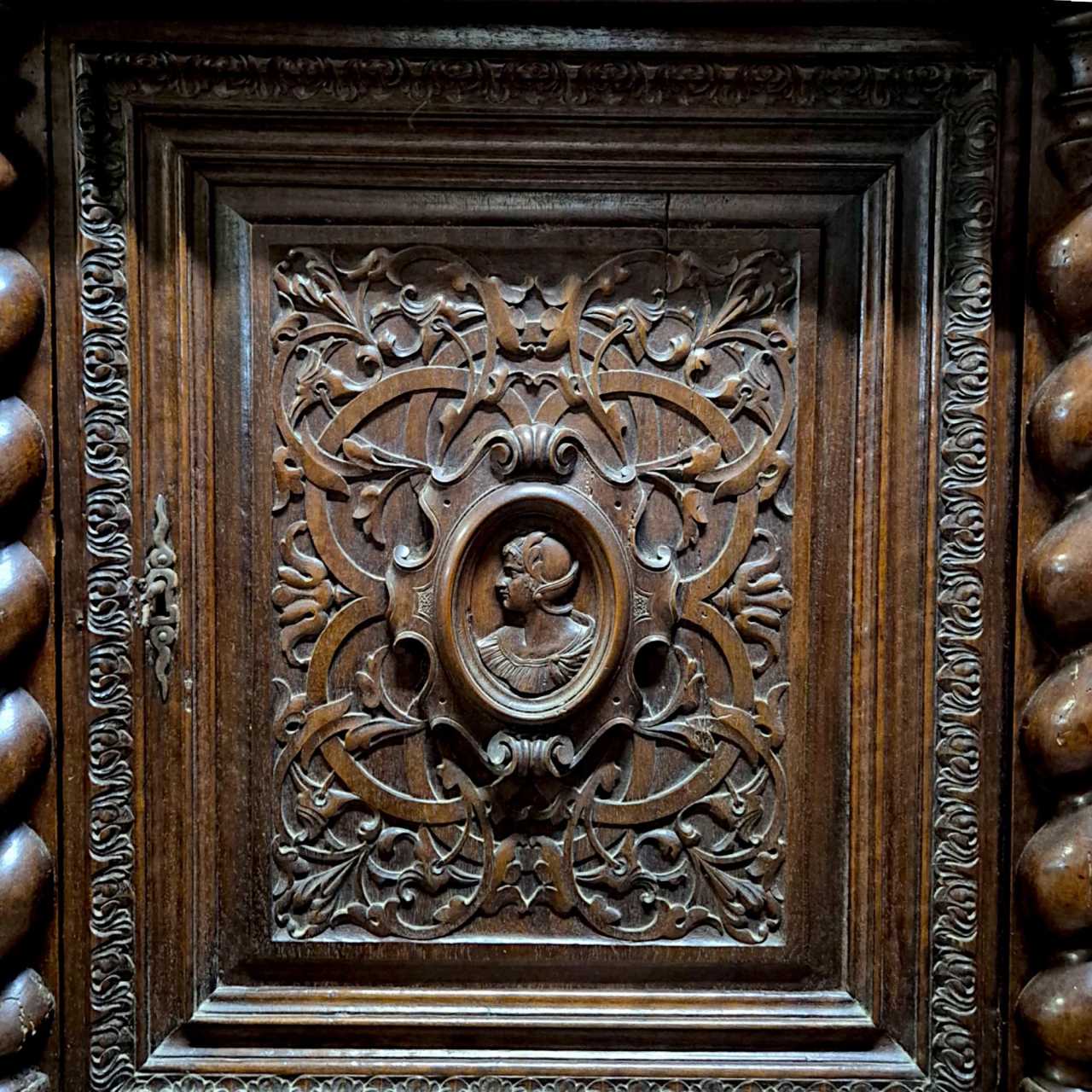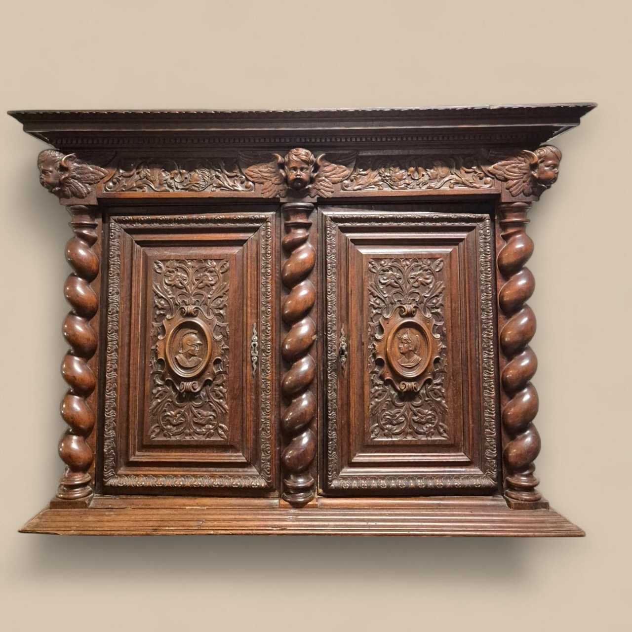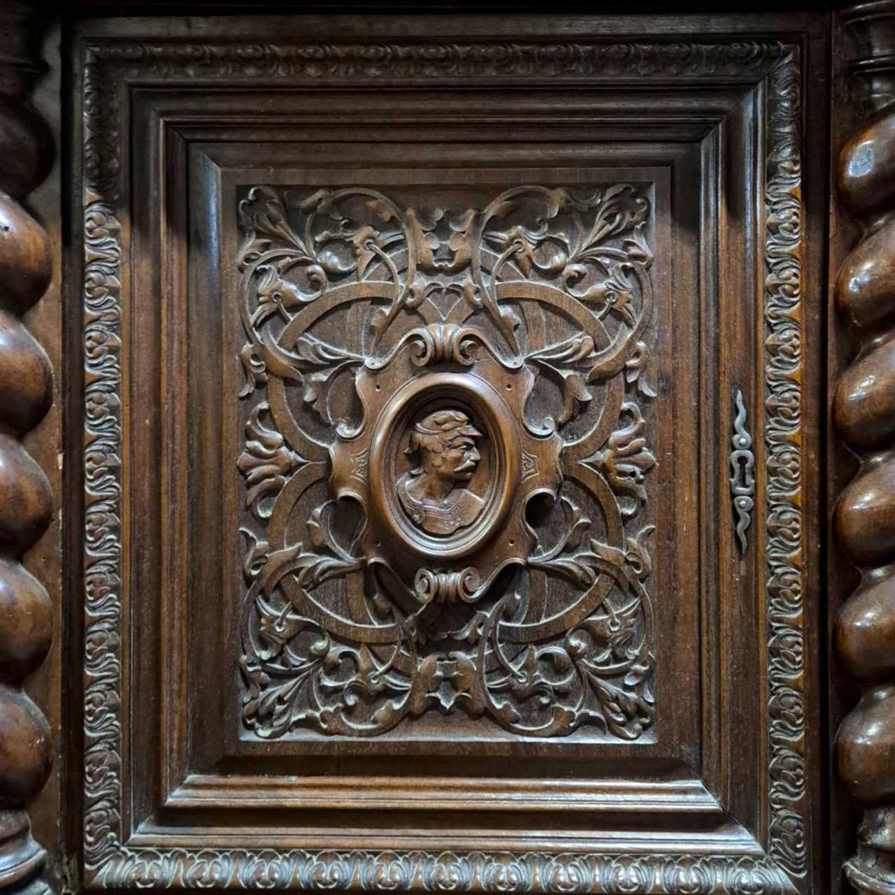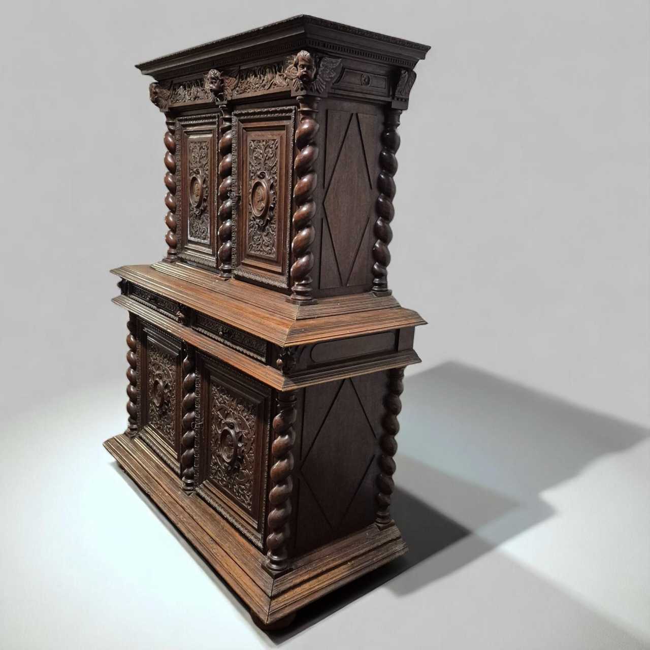 An imposing and richly detailed French Renaissance Revival buffet à deux corps, crafted in the 19th century from solid oak. This exceptional piece embodies the opulence and artistry of the era, with deeply carved decoration and architectural form that commands attention.The upper and lower cabinets each feature paneled doors with elaborate relief carvings, including stylized foliage, carved busts of distinguished personages in medallions, and ornamental scrollwork. Bold barely twist columns frame each section, lending a sculptural rhythm and vertical emphasis to the design.Above, the upper cornice is heavily carved with a frieze of Renaissance grotesques and two expressive carved mascarons anchoring the corners—distinct nods to the mythological and theatrical themes popular in 19th-century French decorative arts.Finished in a warm, aged patina, this buffet not only offers generous storage but also serves as a powerful decorative statement in any refined interior—from a château-inspired dining room to a stately study.