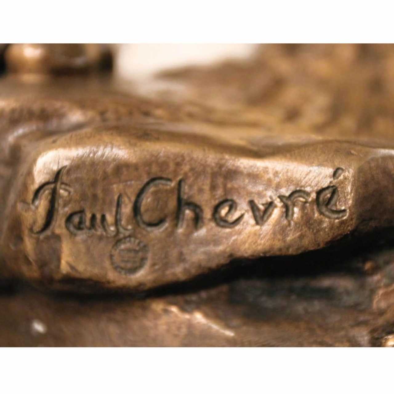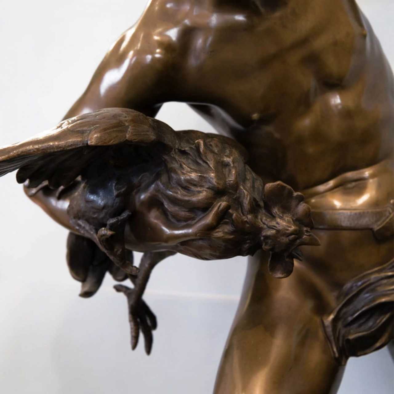 Authors bronze statue Boy with Roosters Paul CHEVRE. H - 75 cm. Represents the work of the famous Franco-Canadian master of the second half of the 19th - beginning of the 20th century. It depicts a Boy taking apart fighting cocks. This gambling and fighting event was conveyed in an anti-censoring manner; a naked young man and in the pathos of gestures represent it. A slightly deviated figure of a young man gives way to angry roosters and their line of aggression crosses the line of the boy and loincloth. Their expressive nature creates energy and strength and also sets off the noble patina of the young man’s smooth body.