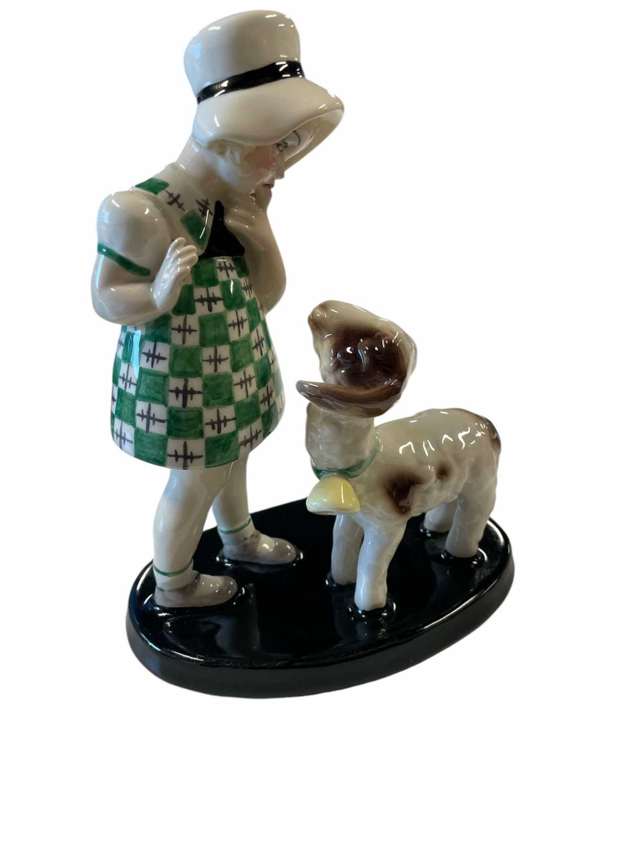 Goldscheider Vienna - Standing Girl with Hat and LambDesigned by Claire Weiss (also known as Klára Herczeg), model no. 6747. This particular version features a sheep.Marked with a black stamp: Goldscheider Wien, and inscribed Made in Austria. It also retains its original adhesive label.Made of earthenware, hand-painted in color, and glazed with a colorless finish. Some age-related craquelure is present, but the overall condition remains good.Height: 17.5 cm.Reference: Robert E. DechantFilipp Goldscheider, Catalog Raisonné, p. 439, no. 6747 (without illustration).