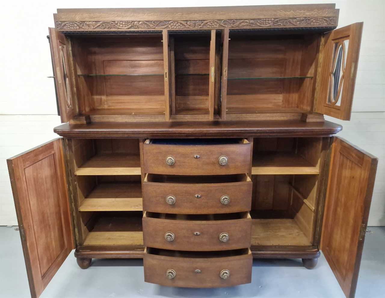 Large and elegant buffet.Oak, cut glass.Germany.1930s.Dimensions: height 195cm; length 201cm; depth 70cm
