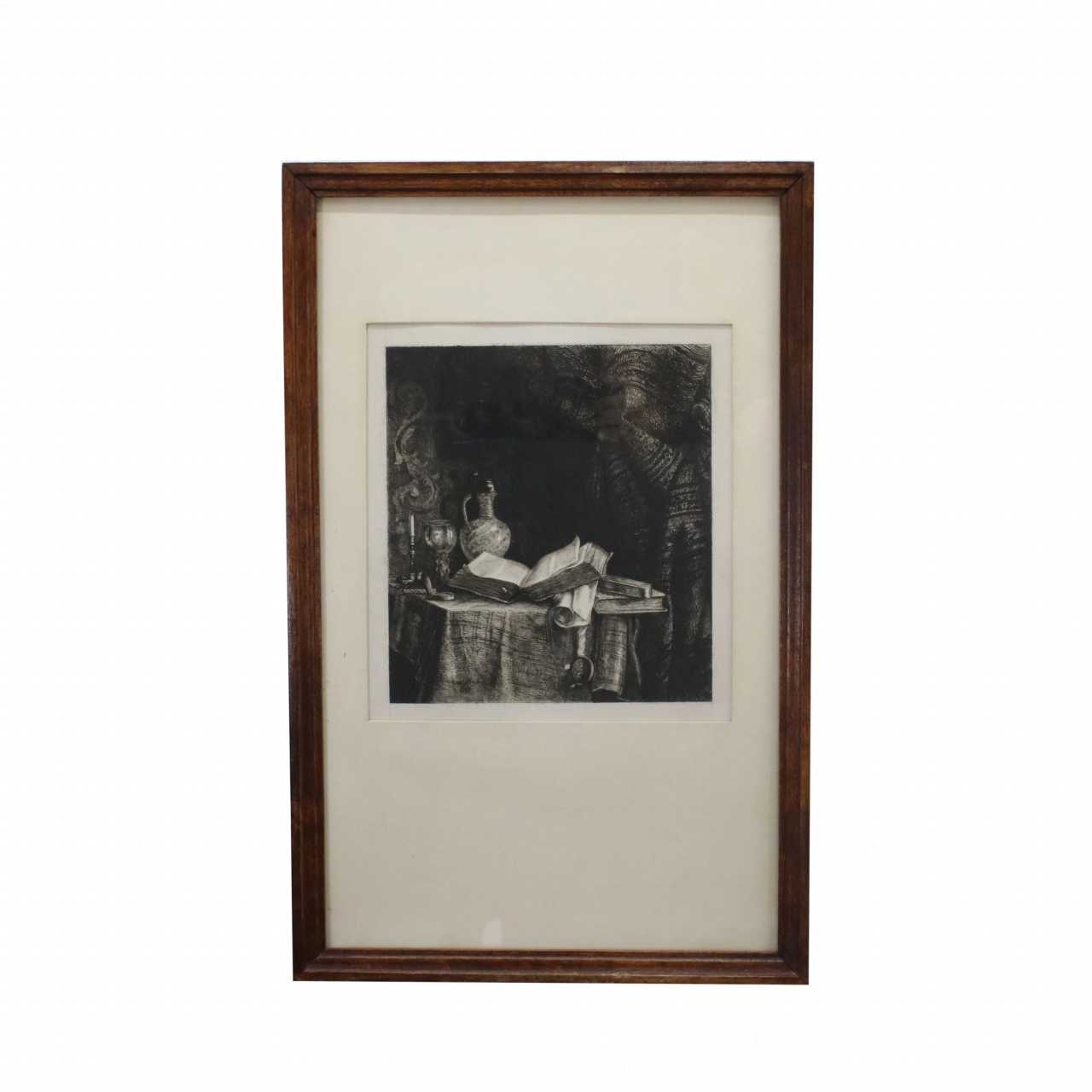 Engraving Still life with a book mounted in a wooden frame. Author`s signature.Internal size 2628 cm