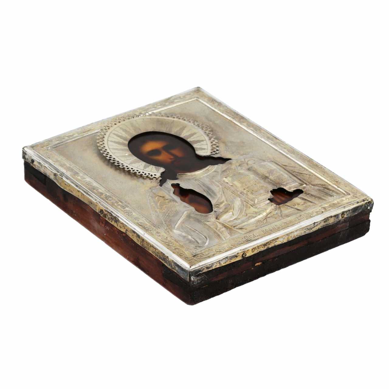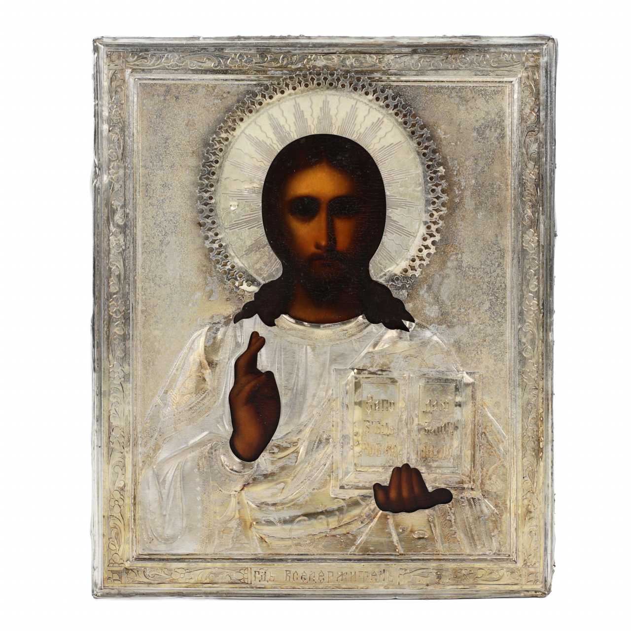 Chamber icon of the Almighty in a gilded silver frame, 1908-1917. Demonstrates the canonical half-length image of Christ blessing. The fields of the icon are decorated with floral patterns. Hallmarks on the frame and crown of the Moscow Assay Office of 1908-1917. 84 standard silver. Master IG in a square shield. Dimensions: 18x14.5 cm.