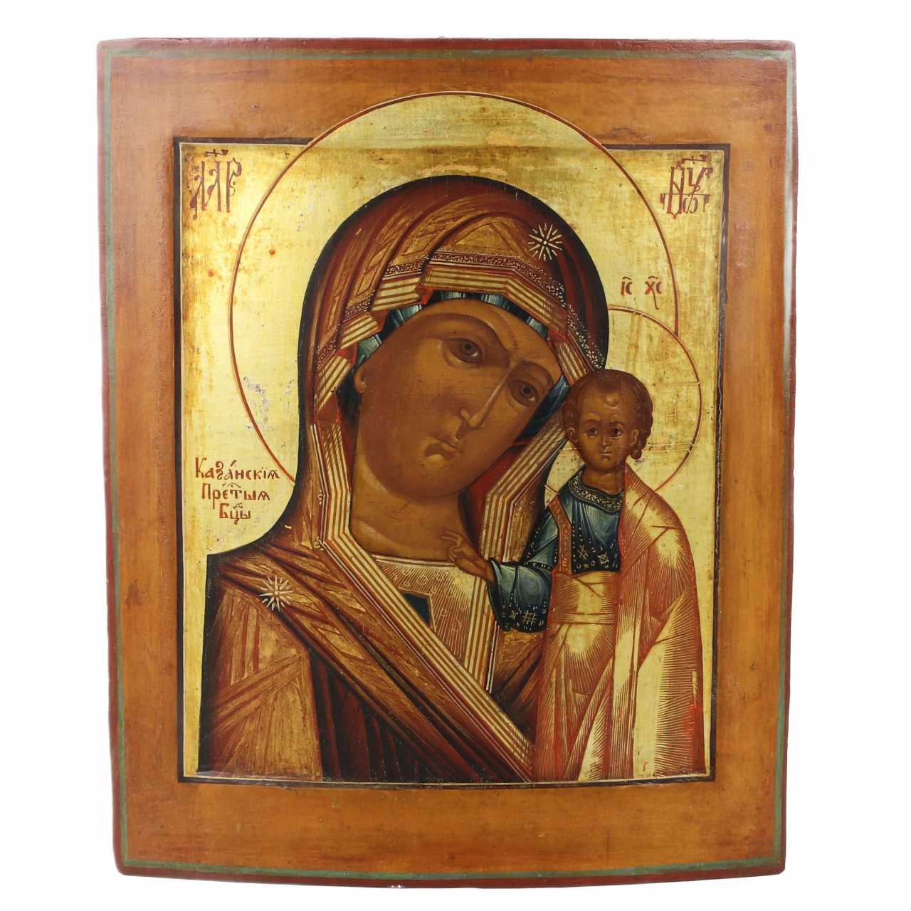 Icon of Our Lady of Kazan, created in the mid-19th century. The image is made in the traditions of the Russian icon painting school, using gesso, tempera paints and gilding. The faces of the Mother of God and the Christ Child are painted with special spirituality, emphasizing their divine origin and grace. The background is covered with gold leaf, creating a shining effect characteristic of canonical Russian icons. The outer icon case is decorated with lacquer polychromy, protecting the icon and emphasizing its artistic value. Dimensions: Height: 33 cm. Width: 28 cm.