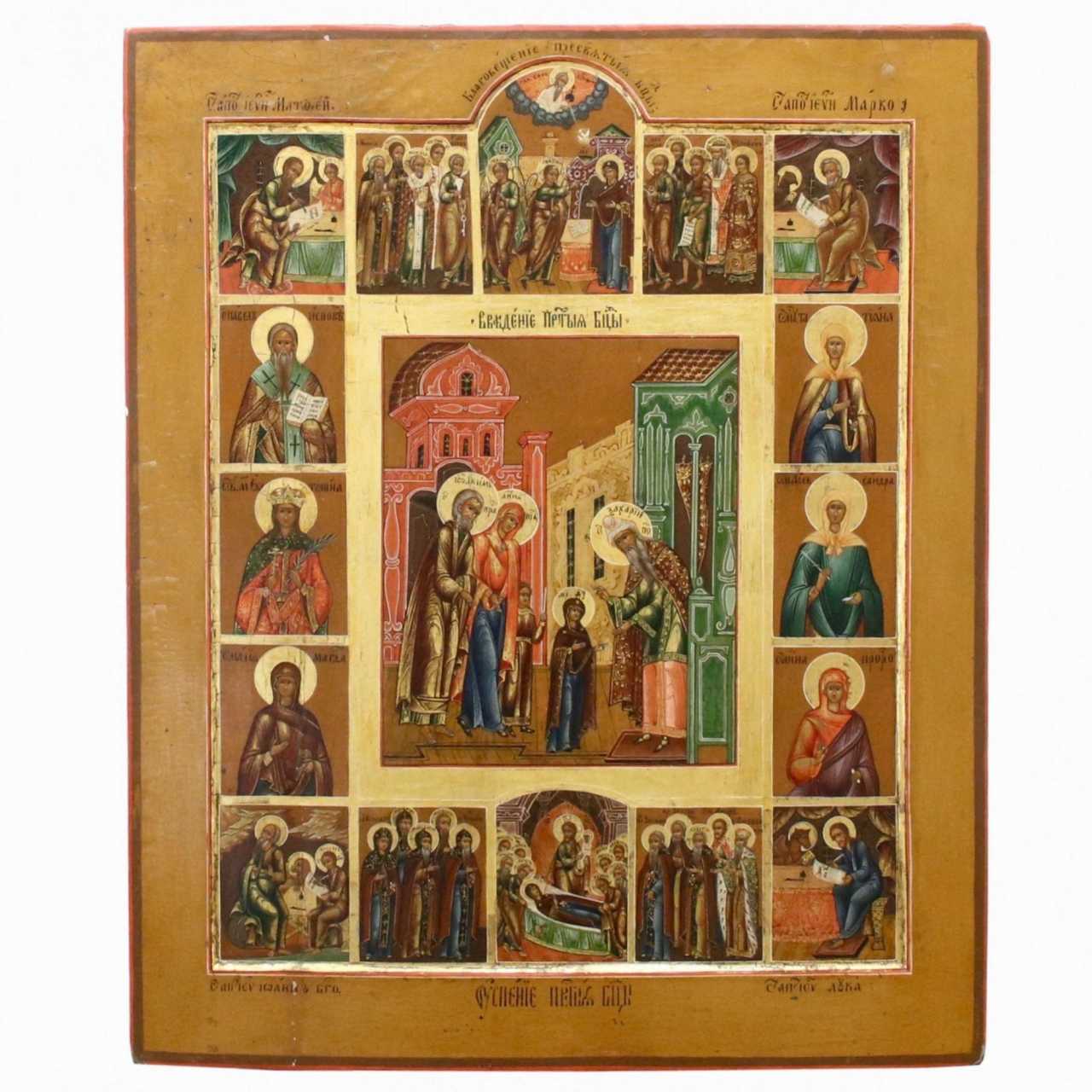 Icon 12 principal Christian feastIn the central part of the icon is the Introduction to the Church of Our Lady of Sorrows and Virgin Mary. In the center of the icon is the three-year-old Virgin Mary, who was brought to the temple by Her parents - Joachim and Anna. For a long time they were childless and took a vow: if the Lord gives them parental happiness, then they will devote the Infant to God. It was a sacrifice - to give their only, long-awaited child. The icon shows the fulfillment of a promise: Joachim and Anna bring little Mary to the temple, where the Jerusalem priest meets the family. According to Church Tradition, he was the righteous Zacharias, the future father of John the Baptist, therefore, on the icon, his head is surrounded by a halo. Behind the priest is the Holy Gates of Saints (a special place in the Jerusalem temple), where the main shrines of the Jewish people were stored in the ark.In the upper part is the icon of the Annunciation of the Blessed Virgin Mary.In the lower part of the Icon Assumption of the Blessed Virgin MaryIn the circle of the central part of the icon of saints: Tatiana, Sandra, Anna, Paul, Catherine, Mary Magdalene.Material: wood, gesso, tempera, Palekh, XIX century