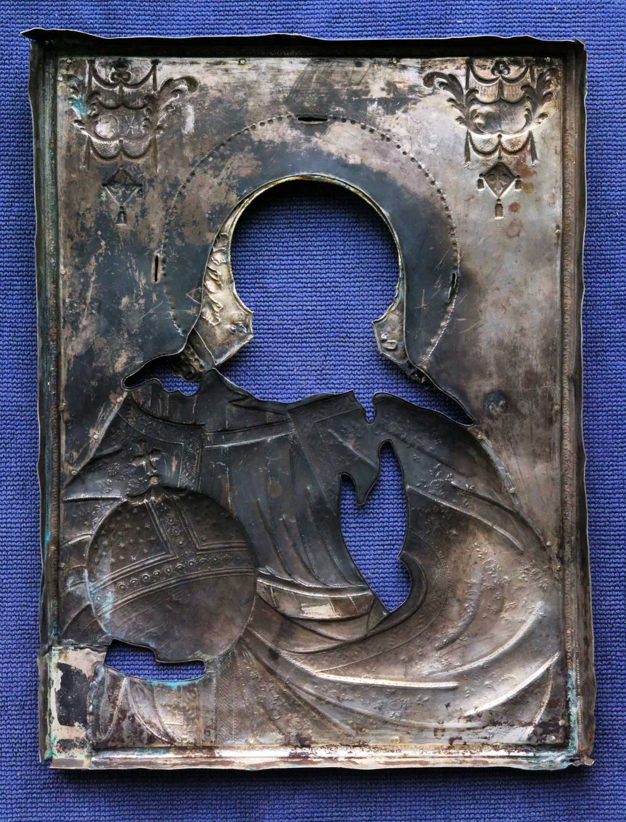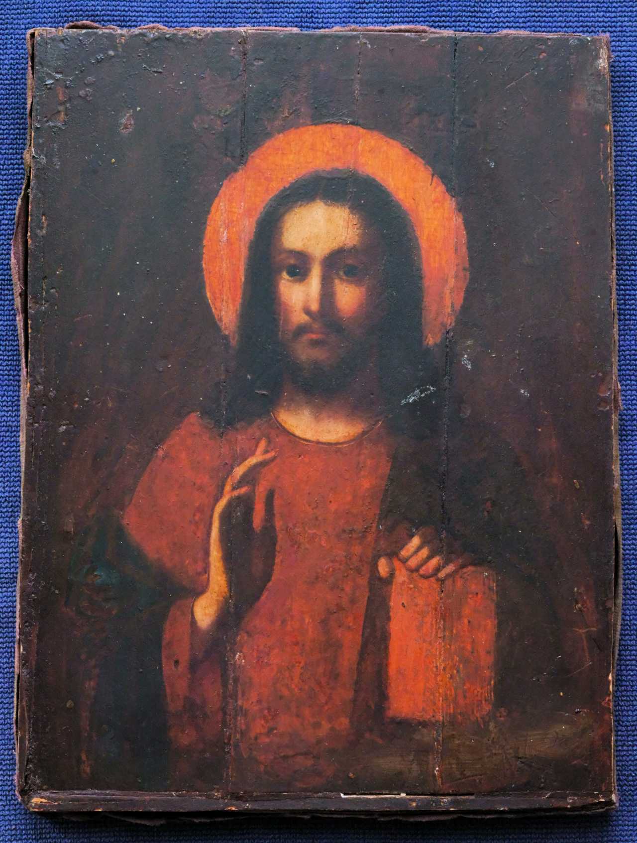 Старинная икона Спасителя в тяжелом кованом окладе из серебра "84". Русское Барокко. Российская Империя, Санкт-Петербург, 1791 год. Материалы: дерево, левкас, яичная темпера. Оклад: серебро "84", литье, прочеканка, ручная гравировка штихелем, золочение, канфарение, доводка, пайка, монтировка. Техническое исполнение: темперная иконопись. Размеры: Высота - 33 см. Ширина - 25 см. Толщина – 2,5 см. Вес оклада - более 600 граммов. Клейма: на окладе: именник мастера-монограммиста "Н.М" в прямоугольнике, мастера "Т.П.Г" в фигурном значке, городское клеймо Санкт-Петербурга над датой "1791". на венце: именник мастера "Ф.Р", пробирного мастера "Г.Л" под датой "1791" в прямоугольнике. Оклад и венец изысканной работы. Интереснейший образец русского ювелирного искусства XVIII века в стиле Русское Барокко. В очень хорошем коллекционном состоянии.