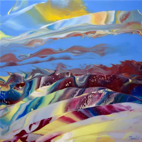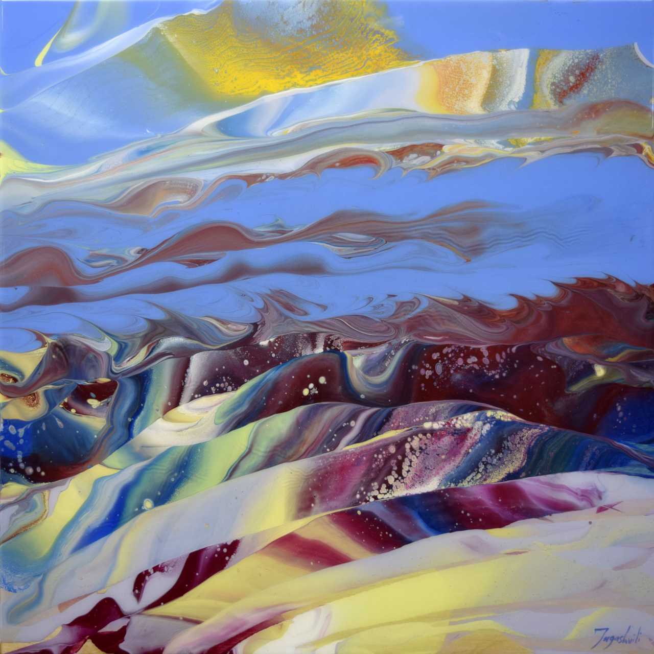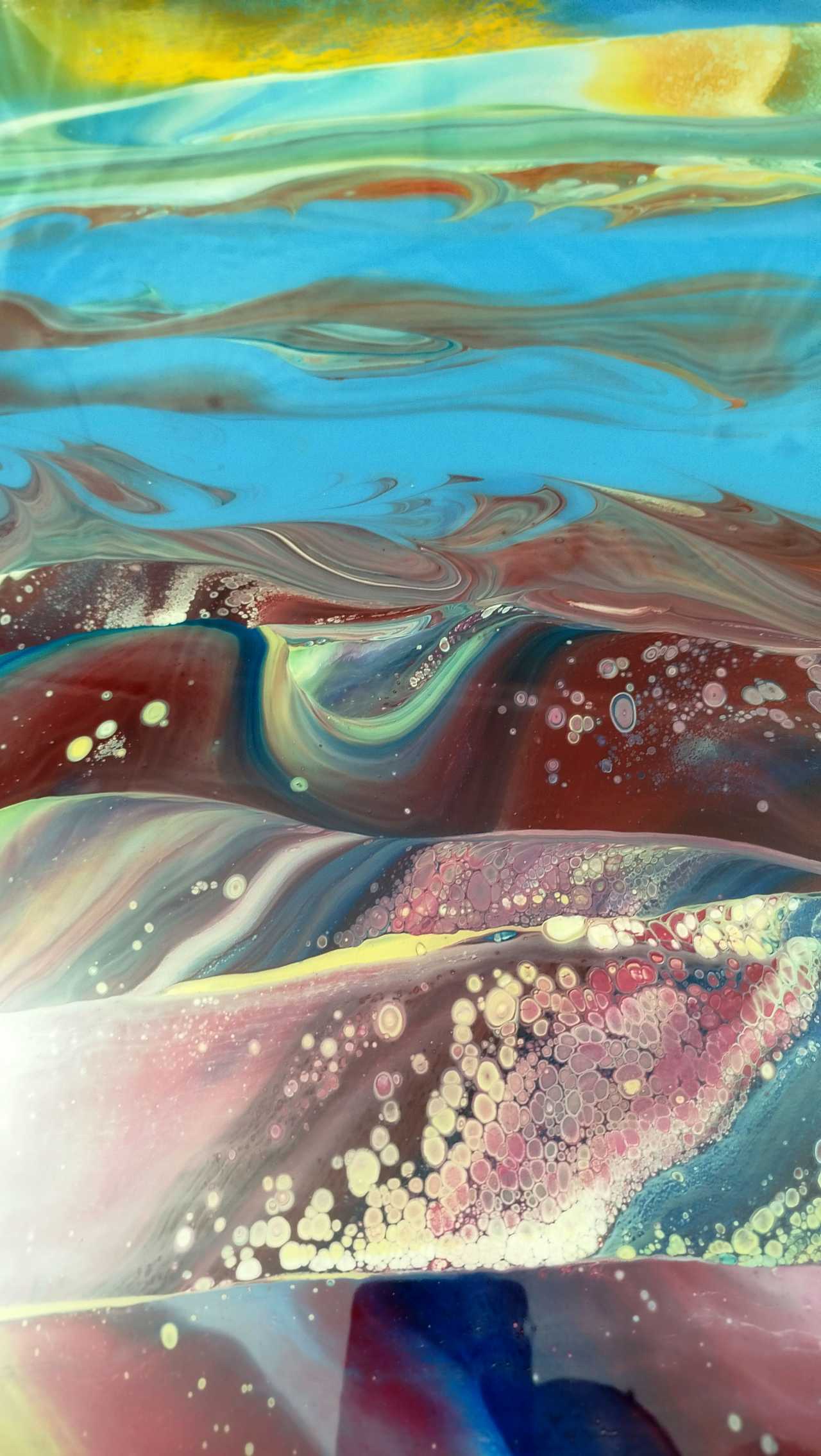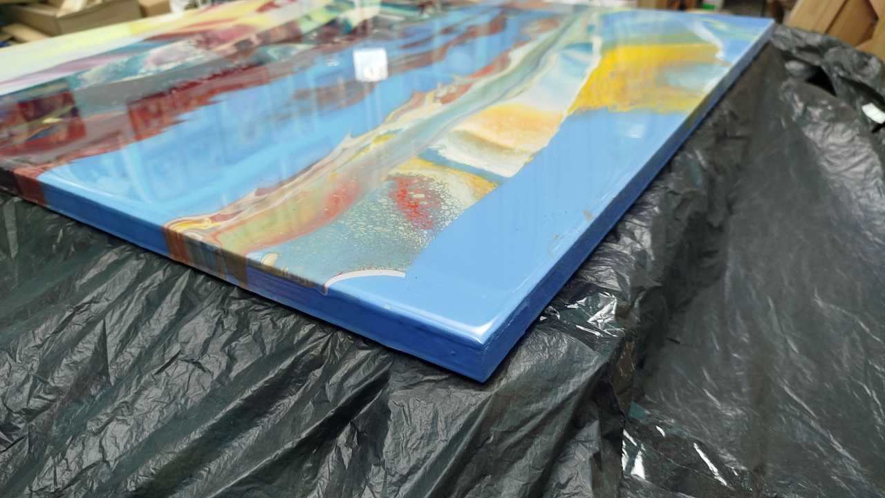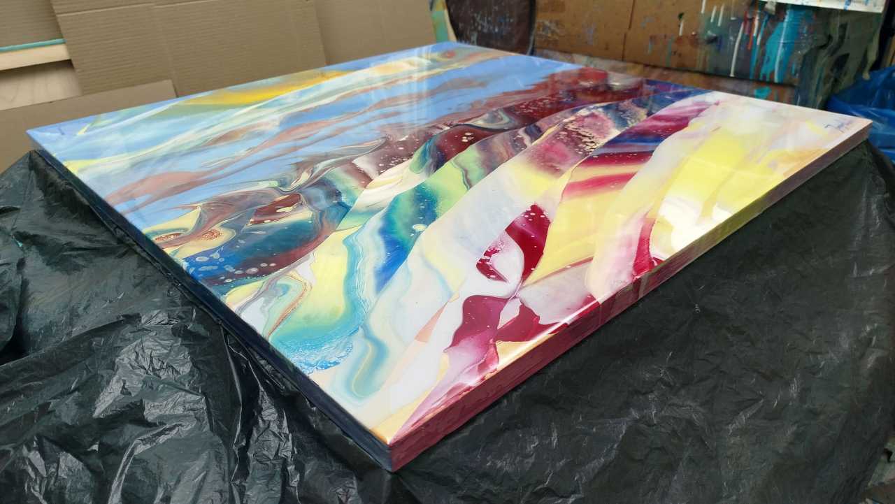 Работа выполнена алкидной эмалью на фанерной панели толщиной 4 мм, прикрепленную к деревянным брускам. Поверхность покрыта эпоксидной смолой, что делает ее гладкой и защищенной. Работа поставляется в деревянном ящике из фанеры или оргалита и упаковка весит 12-14 кг. Сама картина весит 5,5 кг.К картине прилагаются прочные D-образные кольца-вешалки для картин и проволока для подвешивания картин из нержавеющей стали с виниловым покрытием. Информация о картине на Русском языке будет добавлена при продаже. Для меня важны физические свойства материалов, которые я использую. Каждая новая работа - это эксперимент и открытие новых физических свойств. Краска, вылитая на поверхность картины, представляет собой не что иное, как хаос, и моя задача, используя физические свойства материала, превратить этот хаос во что-то, на что хотелось бы смотреть.