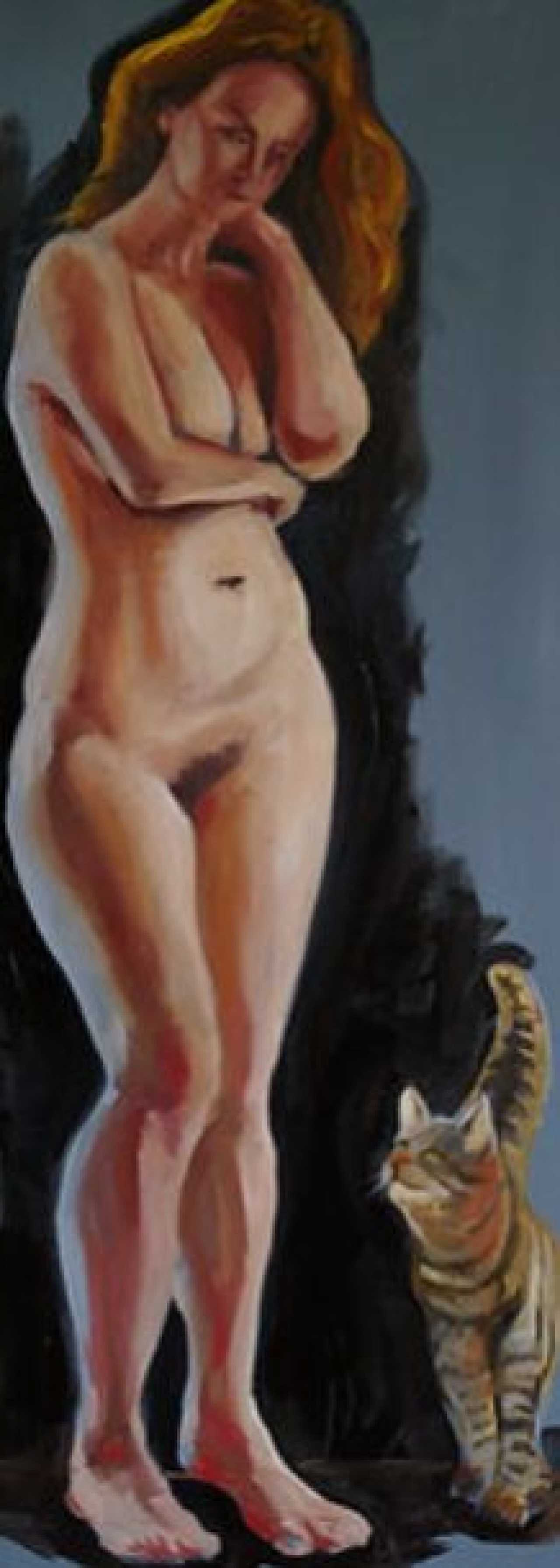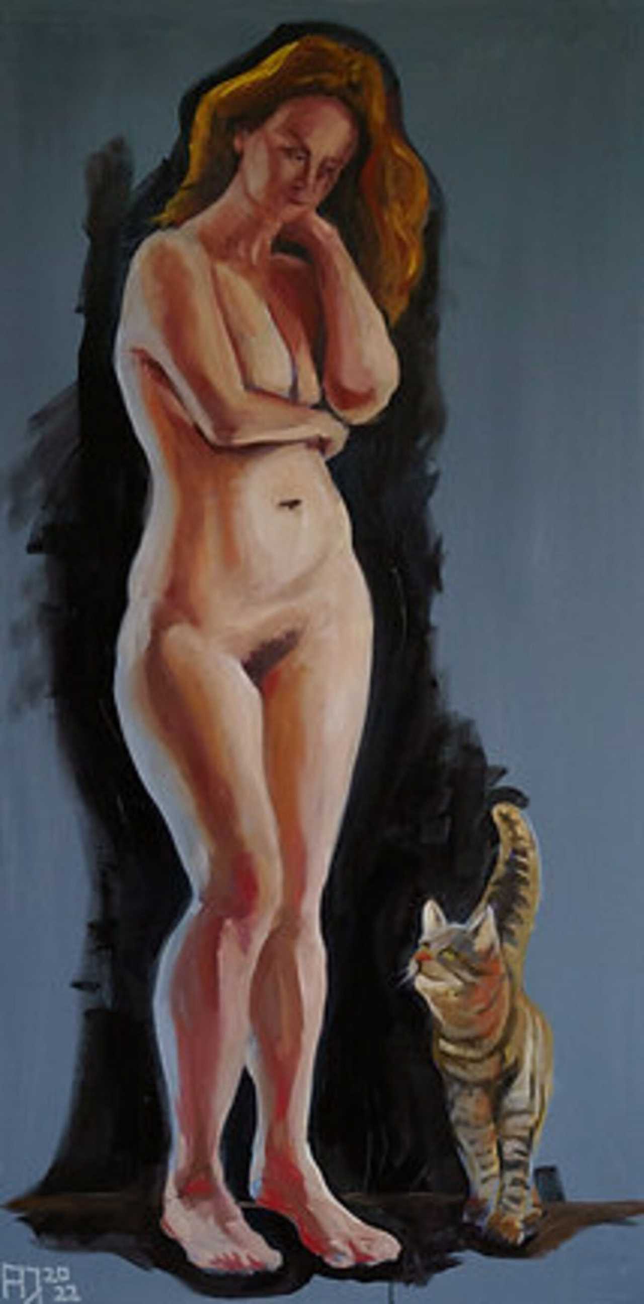 This painting shows a standing red-haired girl with a yellow and black striped cat near her. The woman has a relaxed attitude and the cat is placed next to her, giving a feeling of friendship and playfulness. The artist has skilfully captured the curves and lines of their bodies, creating a sense of movement and intimacy in the work. The use of a neutral background adds to the overall mood of the painting, creating a sense of simplicity and focus on the girl and the cat. The focus is on their bodies, which are depicted with a sense of realism and attention to detail. The painting invites the viewer to engage with the work and interpret its meaning based on their own perceptions and imagination. The artists use of color and texture creates a sense of depth in the composition, highlighting the connection between the girl and the cat.Measurements are 50 x 100 cm. Oil on canvas.
