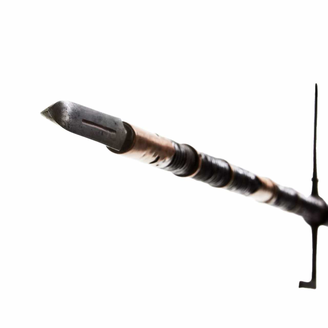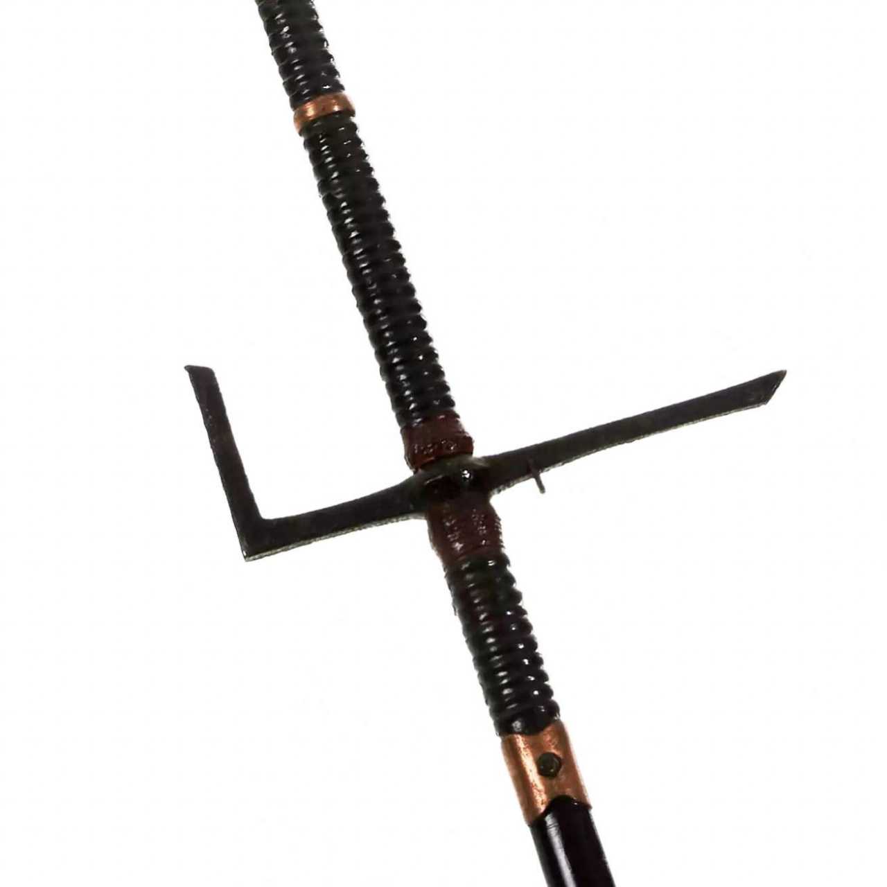 Spear of Kagi-yari. Japan, Shinshinto (Newest Era) period, 1781-1876 (also called the Late Edo period). The classic yari consists of a shaft (ebu or nagae) to which a tip (ho) is attached. The shaft is 1.8-2.5 m long, in cross section, as a rule, round or multifaceted (rather than oval), made of oak or, more rarely, bamboo. The tips were 15-90 cm long and were xiphoid in shape, fastened with a shank (nakago). They allowed to inflict stabbing and chopping blows. Thanks to these tips, yari can be classified as glaives. Sometimes a metal hadome crosspiece was made 30 cm below the tip. Tsuba was common. For more reliable fastening, the end of the shaft was supplied with a fastening sleeve (habaki) and washers (seppa). At the lower end was an undercurrent (ishizuki) that could be used to strike. The upper part of the shaft was varnished and wrapped with a cord (sen-dan-maki). Kagi-yari is a spear with a hook fixed at the base of the tip pointing forward to capture enemy weapons. Length - 205 cm.