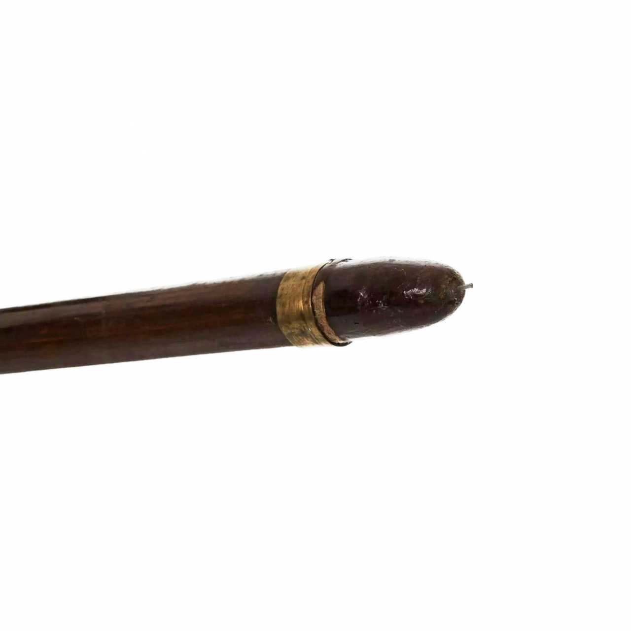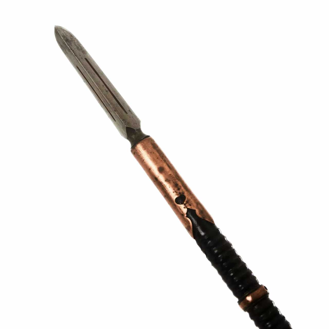 Spear of Kagi-yari. Japan, Shinshinto (Newest Era) period, 1781-1876 (also called the Late Edo period). The classic yari consists of a shaft (ebu or nagae) to which a tip (ho) is attached. The shaft is 1.8-2.5 m long, in cross section, as a rule, round or multifaceted (rather than oval), made of oak or, more rarely, bamboo. The tips were 15-90 cm long and were xiphoid in shape, fastened with a shank (nakago). They allowed to inflict stabbing and chopping blows. Thanks to these tips, yari can be classified as glaives. Sometimes a metal hadome crosspiece was made 30 cm below the tip. Tsuba was common. For more reliable fastening, the end of the shaft was supplied with a fastening sleeve (habaki) and washers (seppa). At the lower end was an undercurrent (ishizuki) that could be used to strike. The upper part of the shaft was varnished and wrapped with a cord (sen-dan-maki). Kagi-yari is a spear with a hook fixed at the base of the tip pointing forward to capture enemy weapons. Length - 205 cm.