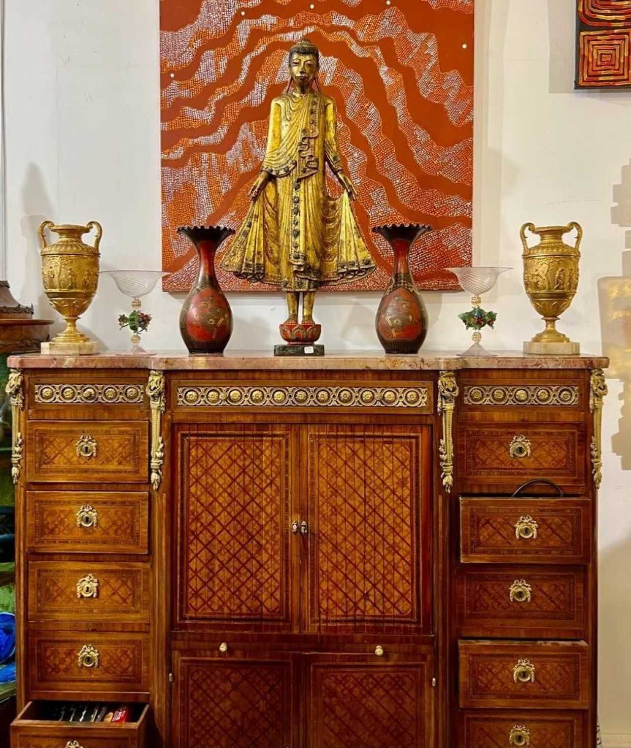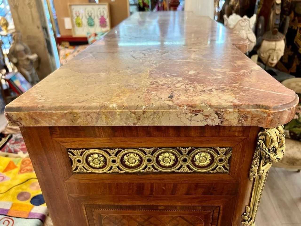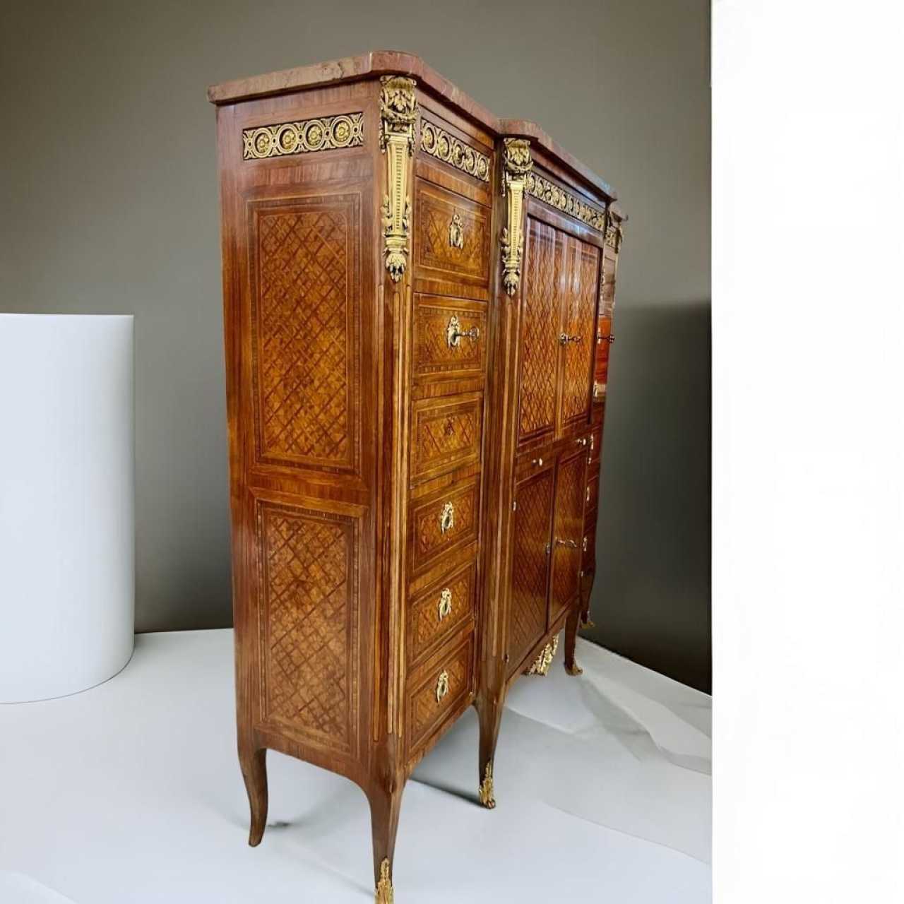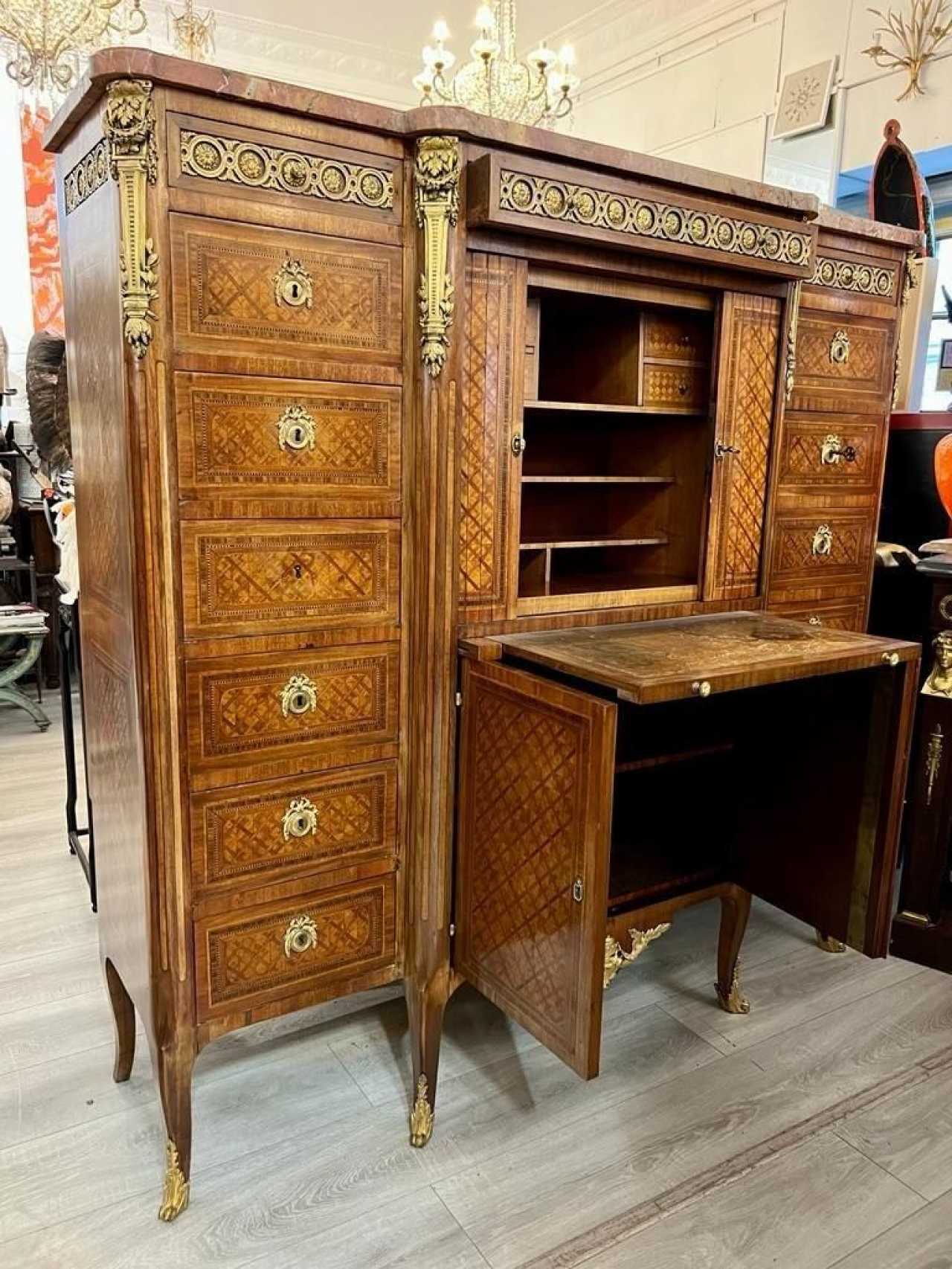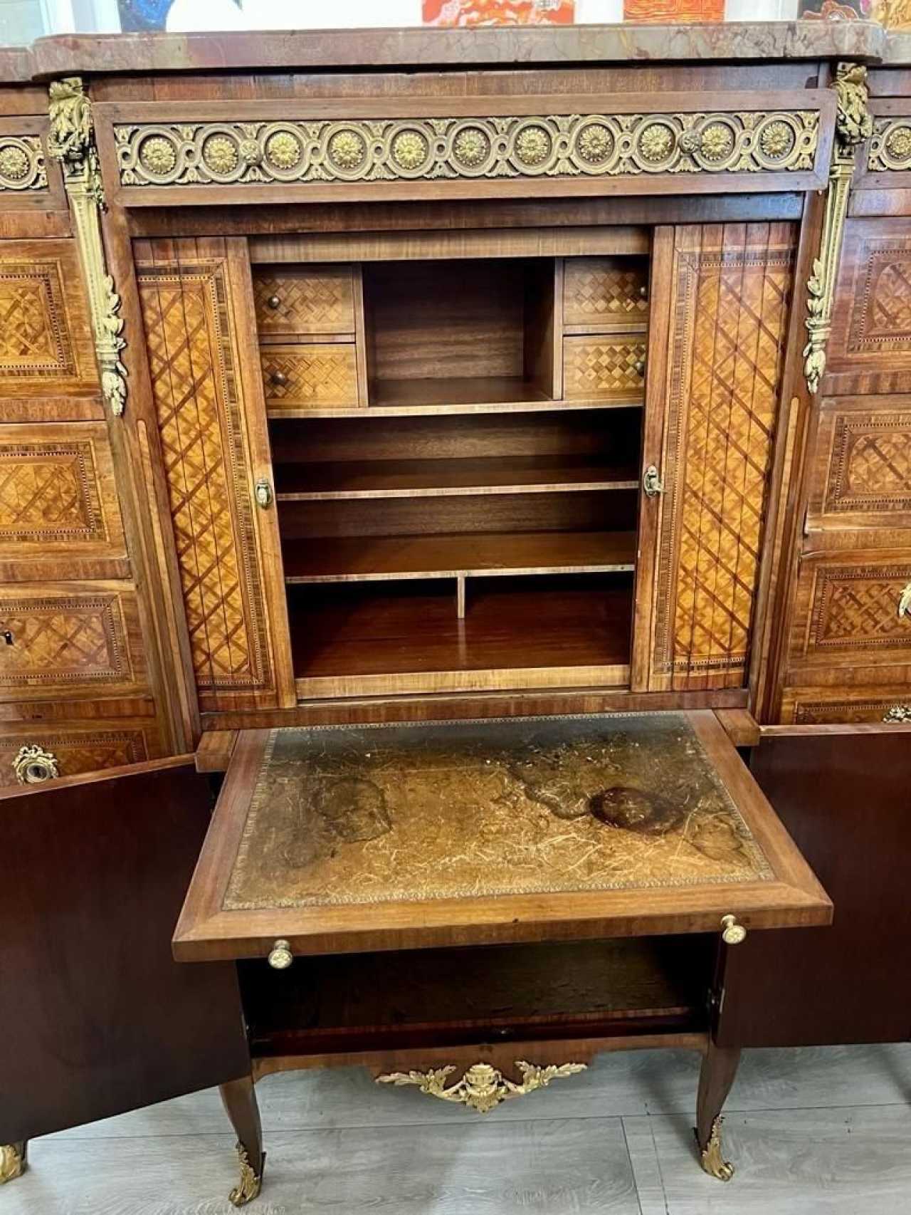 This late 19th-century cabinet in the transition style of Louis XV boasts rosewood marquetry on an oak frame. It has a symmetrical design with 14 drawers on both the left and right sides of the central body. In the central section, youll find a spacious drawer at the top, followed by two curtains that unveil a secretary with shelves and two more small drawers. There is also a convenient pull-out writing surface covered in gilt leather. The upper section of the cabinet is elegantly adorned with finely crafted gilded bronze details, including a frieze with interlaced ovular motifs. Intricately designed bronze drops with garlands and acanthus leaves embellish the four front pillars, while the lamp bronze displays decorations of a covered vase, garlands, and more acanthus leaves. The four feet are completely covered in bronze, providing both support and ornamental flair. This piece has a slight frontal projection and is crowned with a beautiful Sarrancolin marble top. Please note that the leather covering on the writing surface is stained and should be replaced; we can facilitate this and offer a wide selection of colours. Crafted in late 19th-century Paris, this cabinet is a splendid addition for enhancing the décor of an entryway, living room, or office.