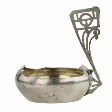 Russian silver ladle in Art Nouveau style, created in the workshop of Vasily Ivanovich Andreyev, is an outstanding example of Russian decorative and applied art in Art Nouveau style. The shape of the ladle, stylized as a boat, is characterized by smooth lines and curves that embody the aesthetics of this artistic movement. The ladle has an expressive silhouette: the uneven upper edge creates the effect of movement, and the handle, made in the form of a stylized ship element, is decorated with a geometric pattern with a wave element. The body of the ladle is decorated with an openwork pattern on the front and back, giving the product complexity and sophistication. The inside of the ladle is covered with gilding, which adds nobility to the product and emphasizes its status character, harmoniously completing the overall composition. Hallmarks: Moscow Assay Office with sample 84 (silver), corresponding to the period 1899-1908; name of V.A. workshop of Vasily Ivanovich Andreev. Dimensions: height 15 cm; length with handle 14.5 cm; depth 12.5 cm. Weight: 268 g. Historical background: Vasily Ivanovich Andreyev was the owner of a silversmith`s workshop. He mainly produced silverware and cutlery (1908-1917). The collection of the State Historical Museum in Moscow contains items made in Andreyev`s workshop.