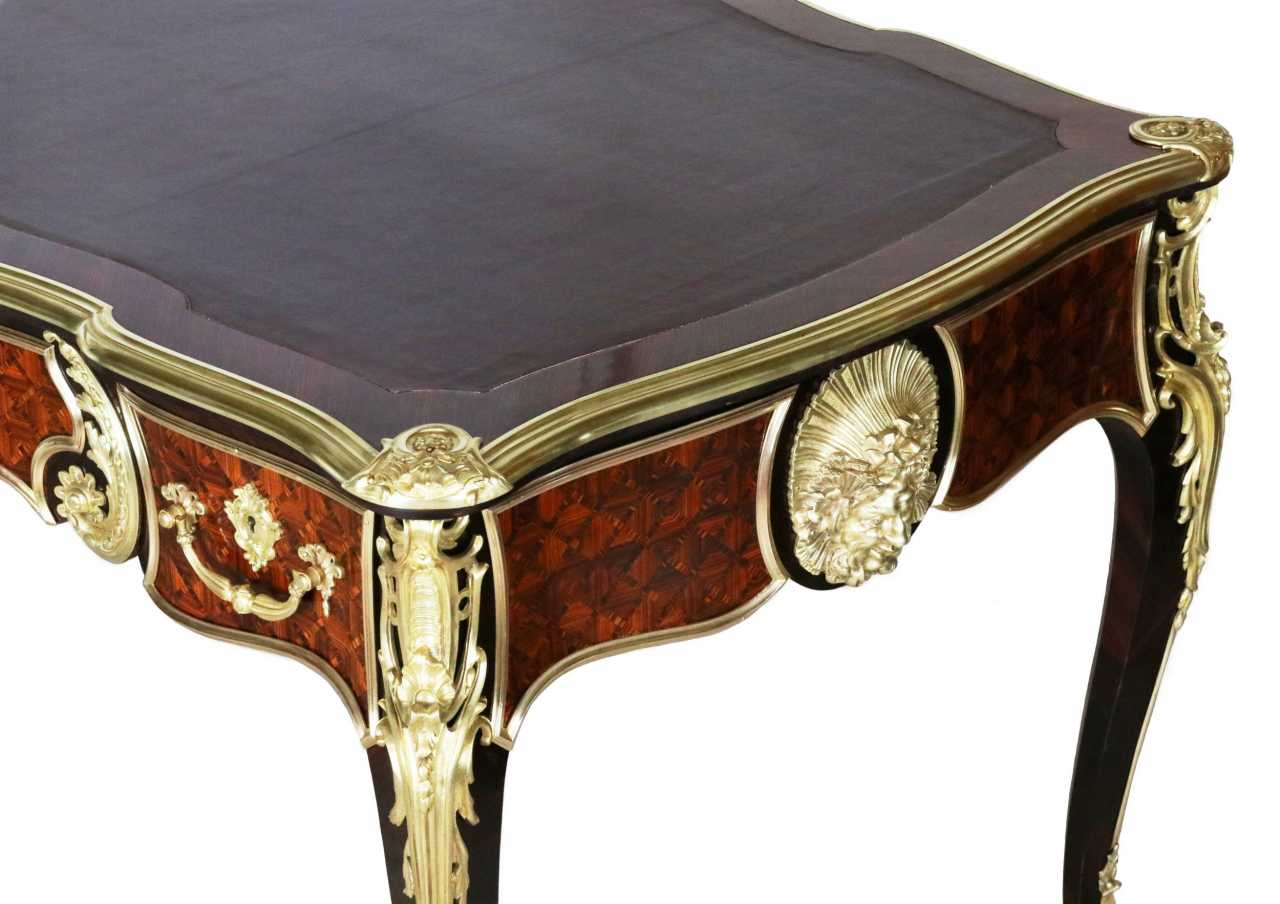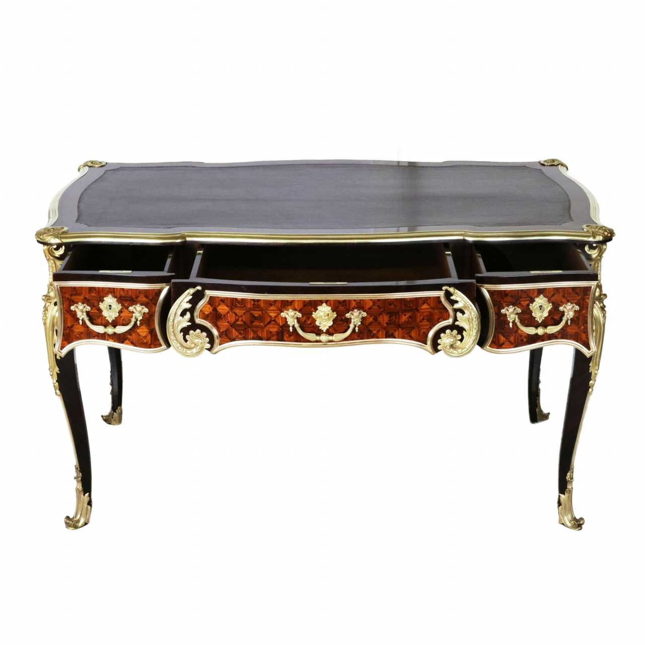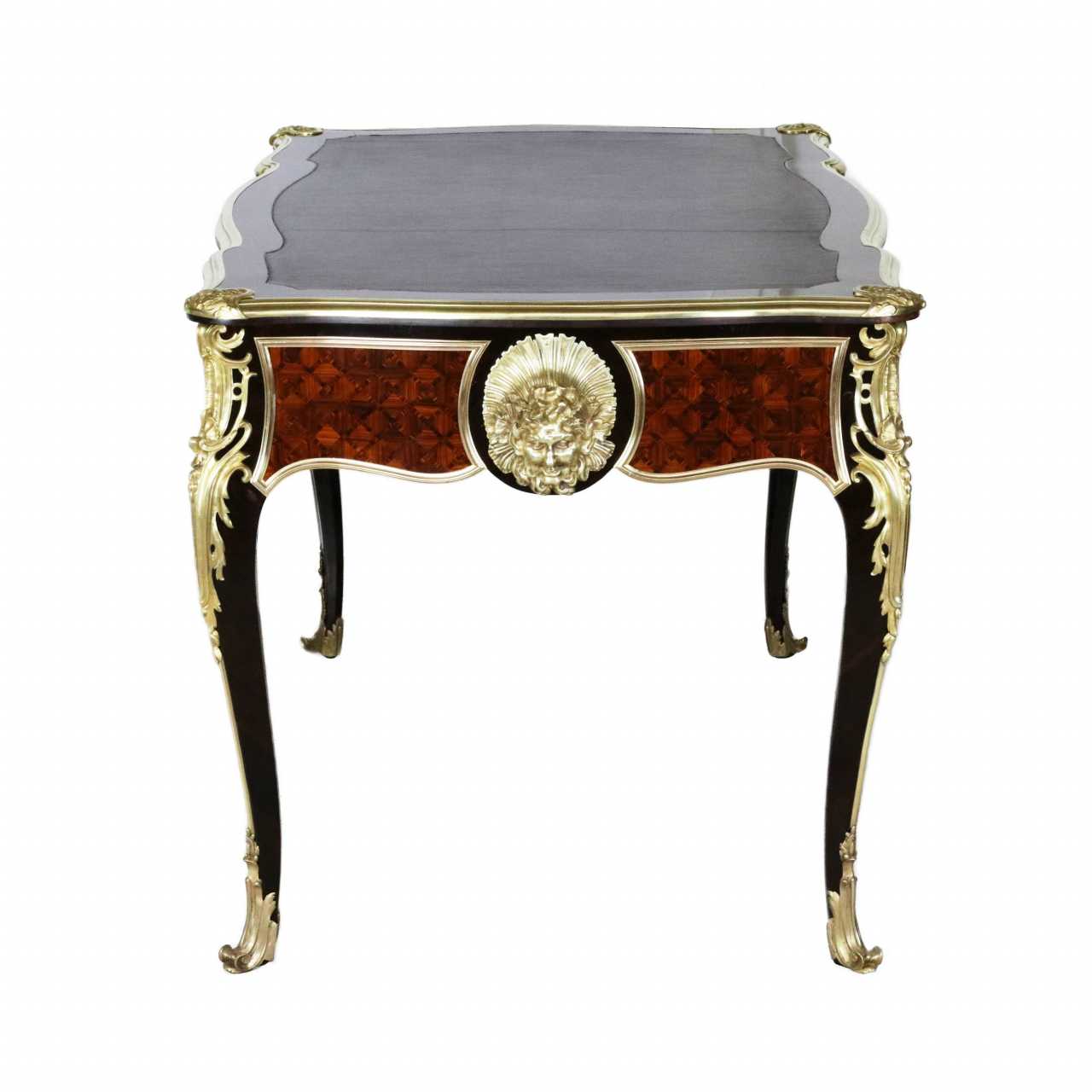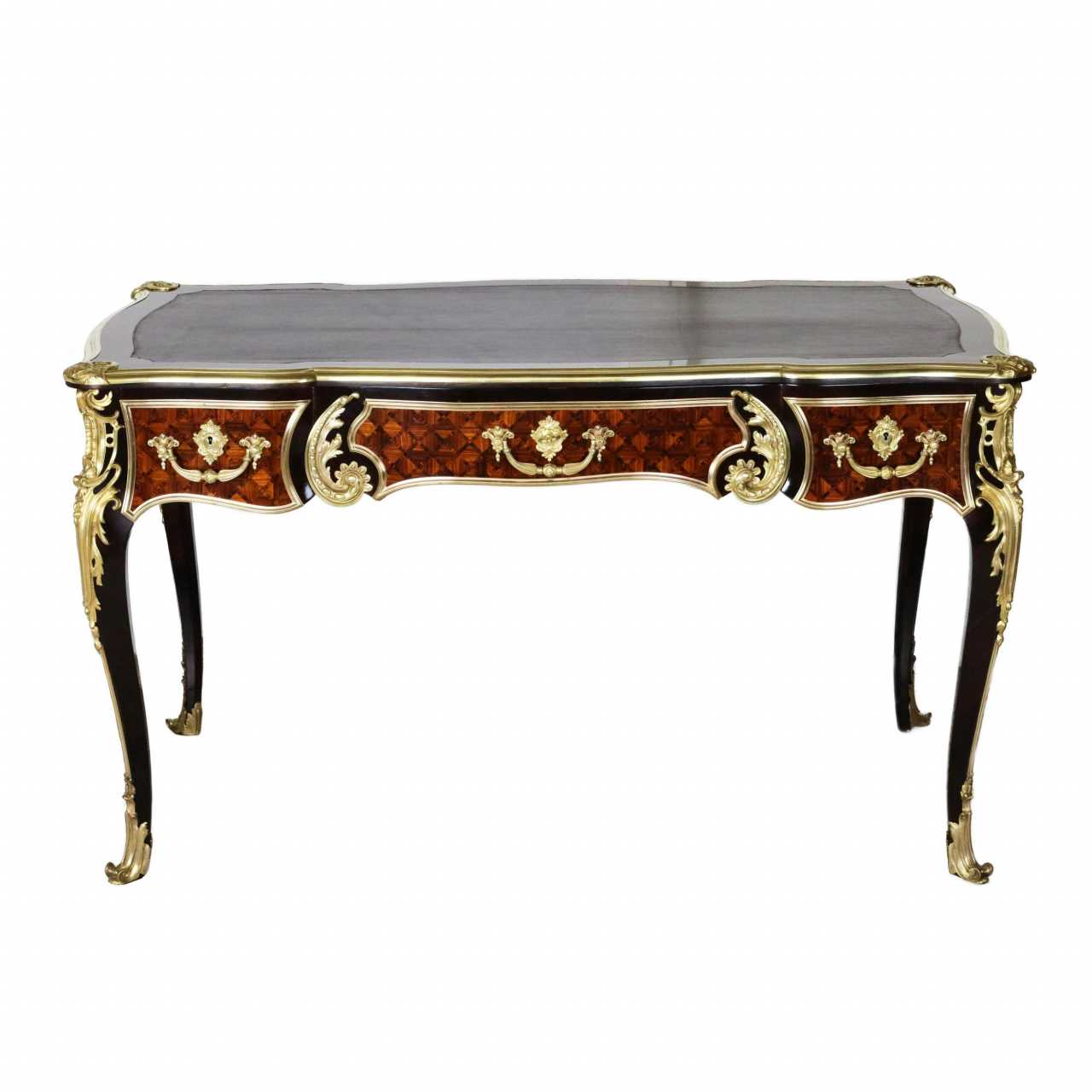 Magnificent writing desk in wood and gilt bronze, Louis XV style. Combining a fine line of measure and elegance. Decorative sufficiency and functionality. Representative elevation and chamber comfort. The melodious structure of germinating waves and shells, the chords of mascarons on the diamond-shaped efficiency of marquetry - plunges into the atmosphere of the courtly age, where the objective world disembodied the richness of human internal movements. Double sided decor. France 19th century. 77x133x78 cm.