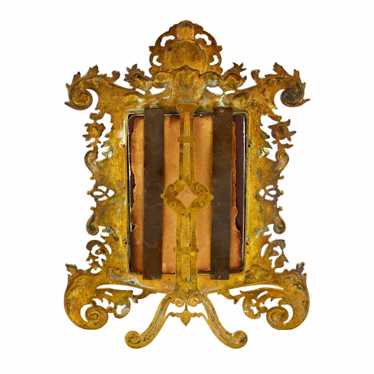 Bronze, rococo style table mirror, with scrollwork corner currencies, rose garlands and a lady`s mascaron with a shell at the head. H-38 cm. Europe. 19th century.