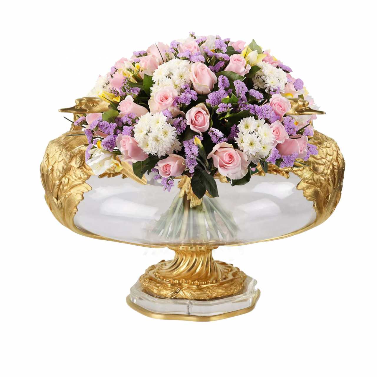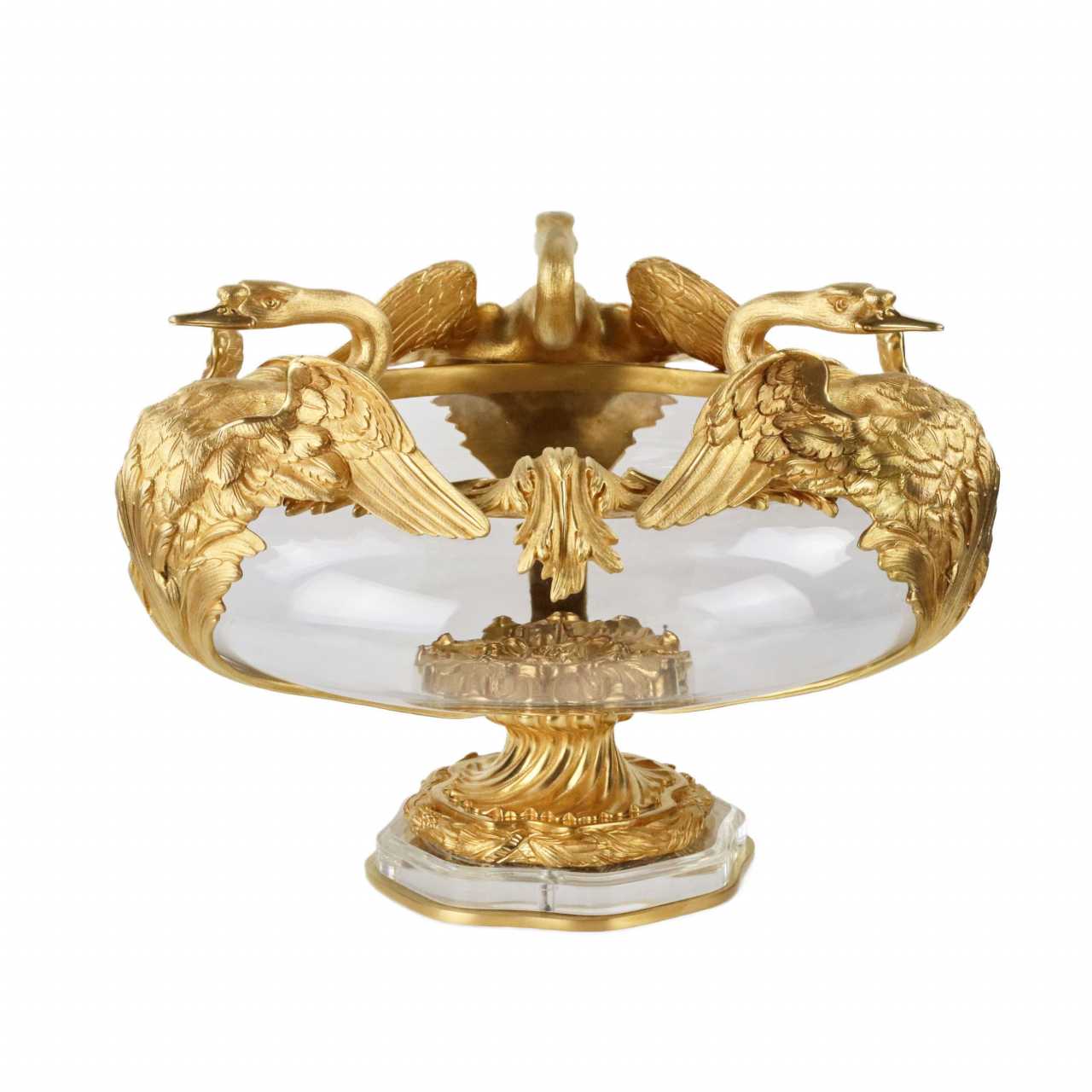 A pair of round and weighty vases in cast glass and gilded bronze with a swan motif. They represent a solid and dynamic ensemble on a stem combined with glass and bronze. The powerful composition of which, in the frame, uses a pseudo-Empire motif - a majestic swan spreading its wings. Height: 36 cm. Diameter: 46 cm. France, 20th century.