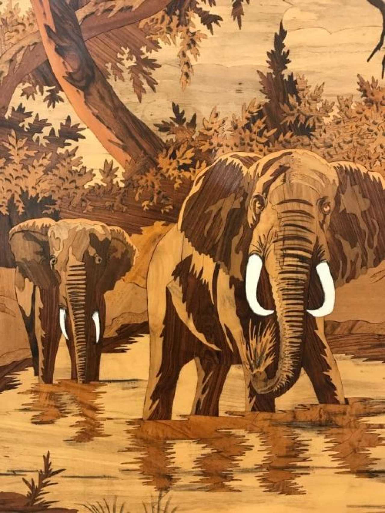 Wooden panel Africa made in the technique of typesetting wood using precious wood and bone in the art deco style. Depicts bathing elephants. The size of the panel without a frame: 80 X 57 cm.