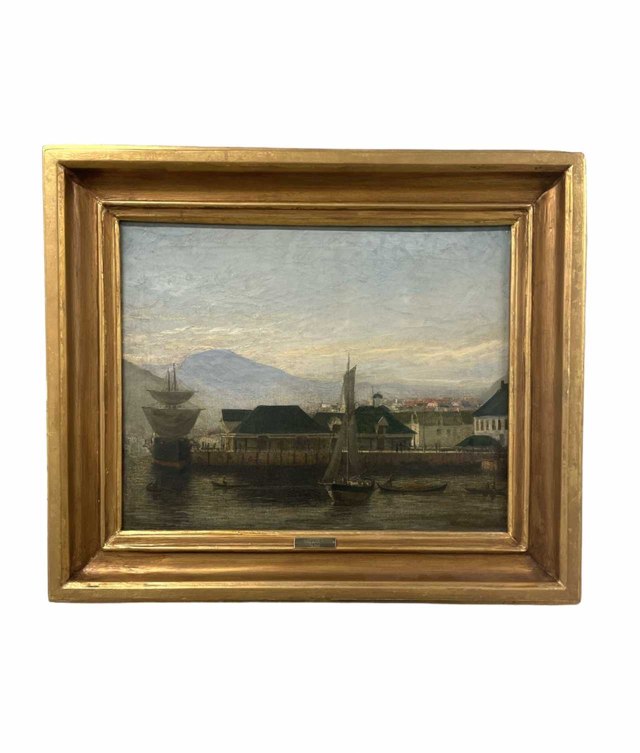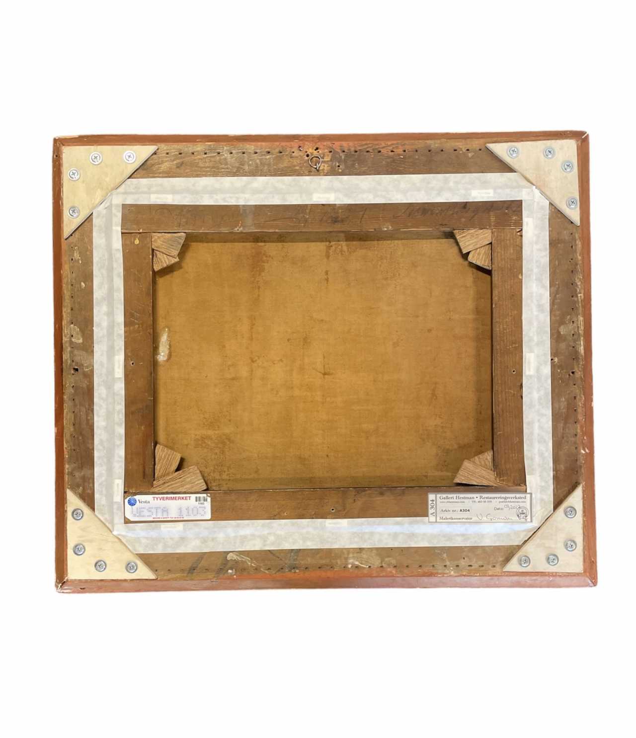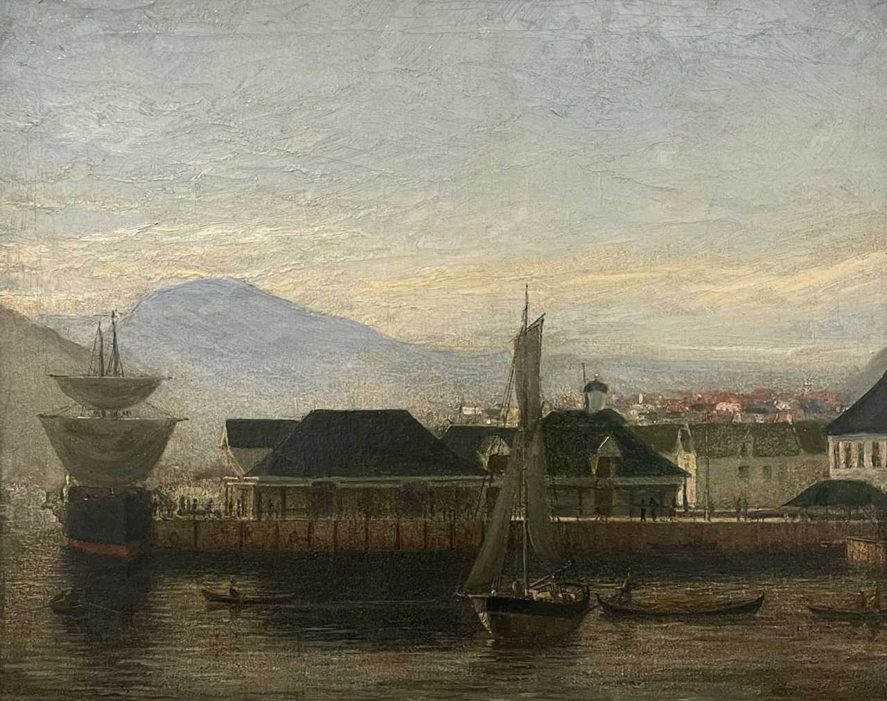 Attributed to Frederik Martin Sørvig (born January 1, 1823, in Bergen, died December 29, 1892, in the same place) created this nice and charming painting of the old city harbor of Bergen, Norway. He was one of the most famous Norwegian marine painters. The painting comes in its original gilded frame, which was regilded in 2022, and the painting itself has been cleaned.Measurements without frame: 40x32cm. With frame: 52x44.5cm.The signature on the back of the frame reads Frederick Sørvig 1878.