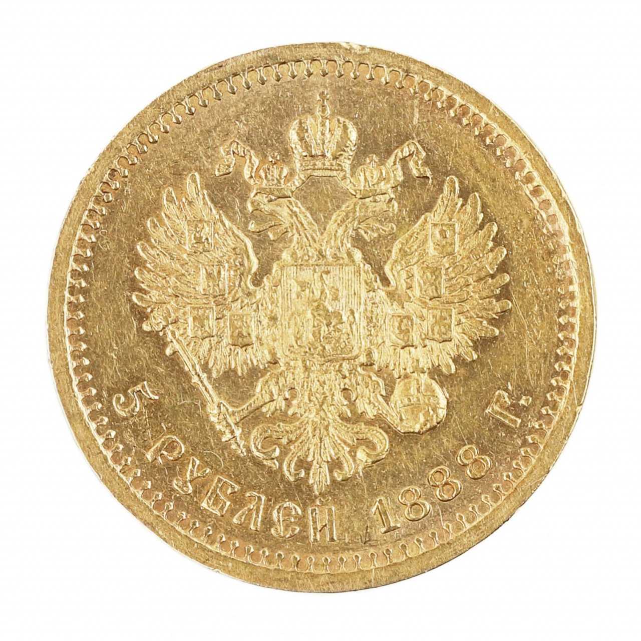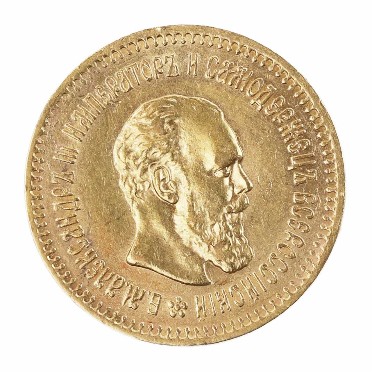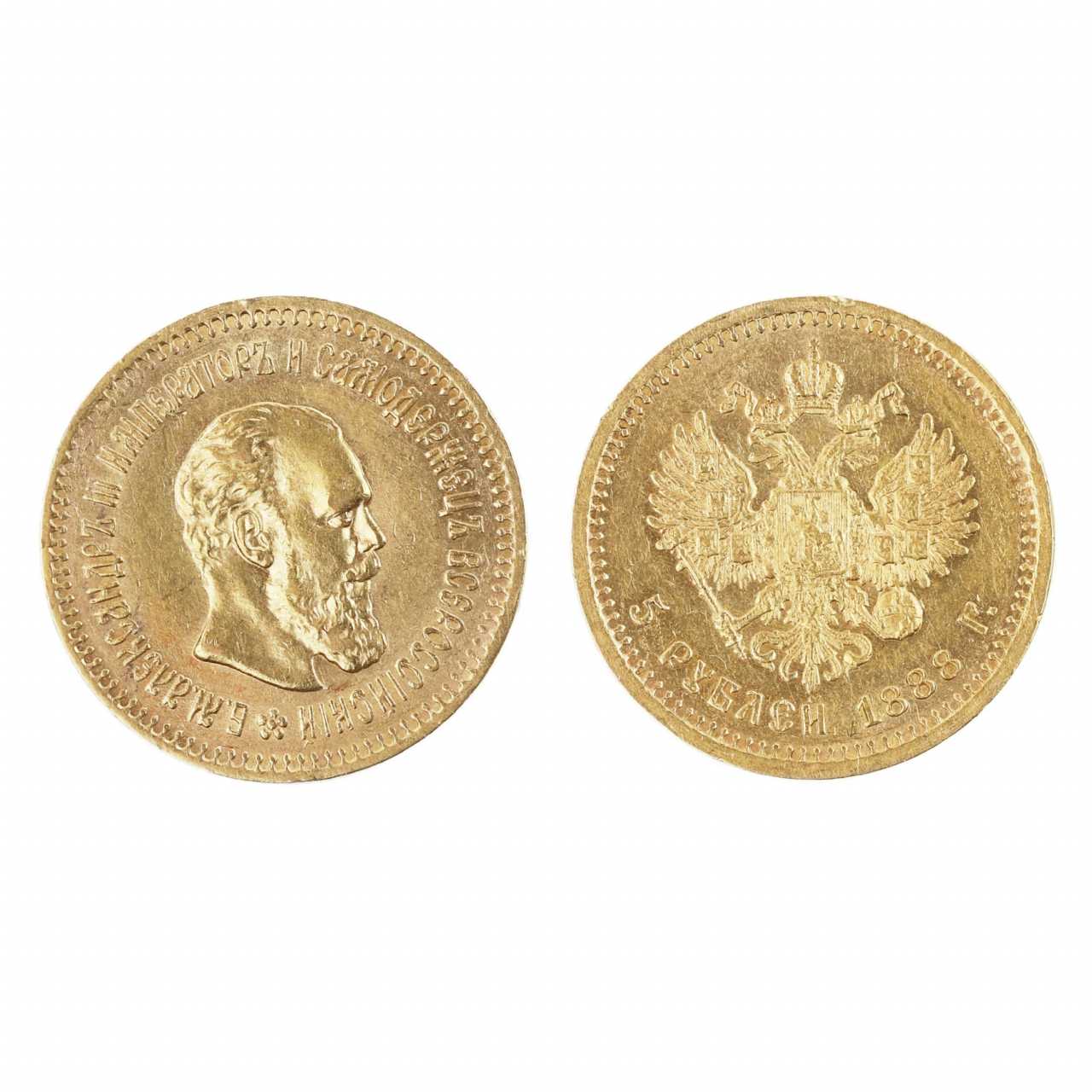 Gold coin 5 rubles of Alexander III, 1889. On the obverse: profile of Alexander III with the text B.M. Alexander III Emperor and Autocrat of All Russia. On the reverse: Double-headed eagle under a crown, denomination with date. Diameter: 21 mm. Weight: 6.47 grams.