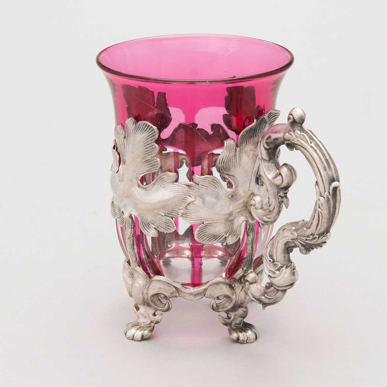 Openwork silver cup holder of the second Rococo with a glass, Carl Gustav Ekqvist, 1851. From the base of the cup holder, ivy grows an ornate shoot-handle. Its playful mood is transmitted to the glass inserted in the cupholder. The pink color of the glass suggests a more fun pastime than a tea ceremony.Hallmarks: 84, letters CGE corresponding to silver cases to the master Carl Gustav Ekqvist, assay mark 1851 poorly readable initials of the assay master. Total weight: 190 gr. N-10.5cm.
