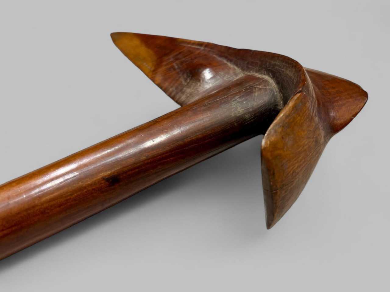 Rare Kanak war club of the Kagu type (Birds beak) in hardwood, from New Caledonia, Melanesia, 19th century.This is an exceptional Kanak art collectors item due to its imposing size and its rare balance on this type of object.This ancient combat tool, carved in a beautiful solid hardwood decorated with a magnificent dark brown and shiny patina, is distinguished by its long cylindrical handle which ends in a stylized birds head, with an elongated beak, two raised eyes and a crest falling at the back of the neck.The handle reflects the traditional style of Kanak clubs. Clubs are an integral part of the Kanak arsenal. Although several forms exist, the most widespread are divided mainly into two categories: phallic brain teasers and those in the shape of a birds beak or turtle.Their use for war and dances is omnipresent throughout New Caledonia. According to Maurice Leenhardt, these objects are used to express virility during war speeches, an essential aspect of the oral tradition. The different forms do not correspond to a specific use, but reflect regional styles, each socio-political group imprinting its identity on the objects it uses.These clubs were brandished during the pilous, in particular for the declamation of genealogical speeches, symbolizing masculine virility and power. A drawing in Indian ink on tracing paper, made around 1954, attests to the objects collected before 1900 by the curator Bernier for the New Caledonian Museum. This model of Kanak puzzle, called “phallic”, represents a formidable weapon used in close combat in New Caledonia.