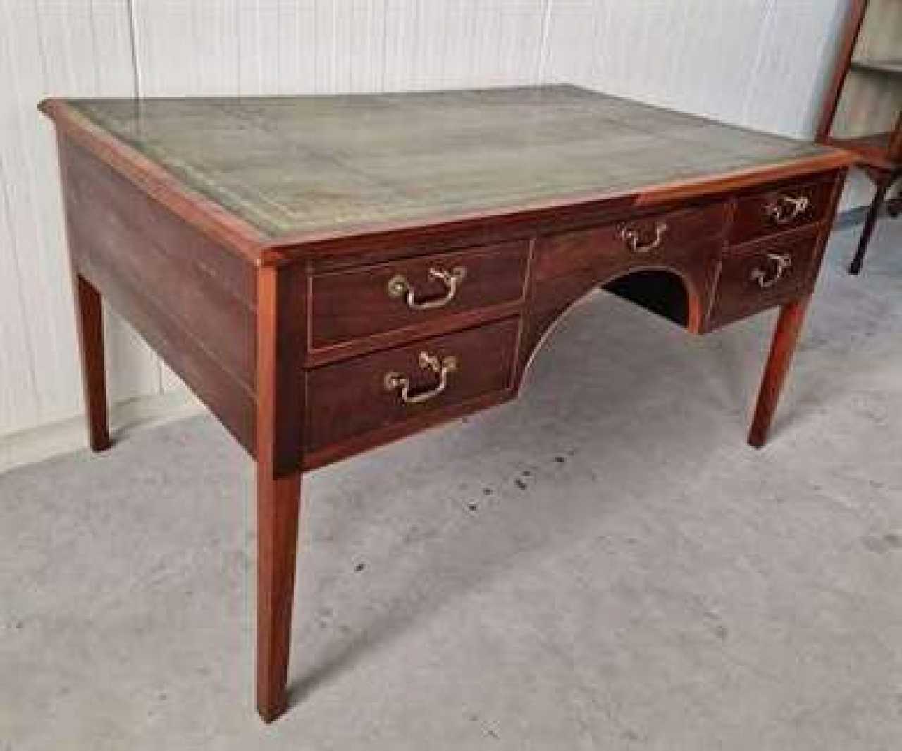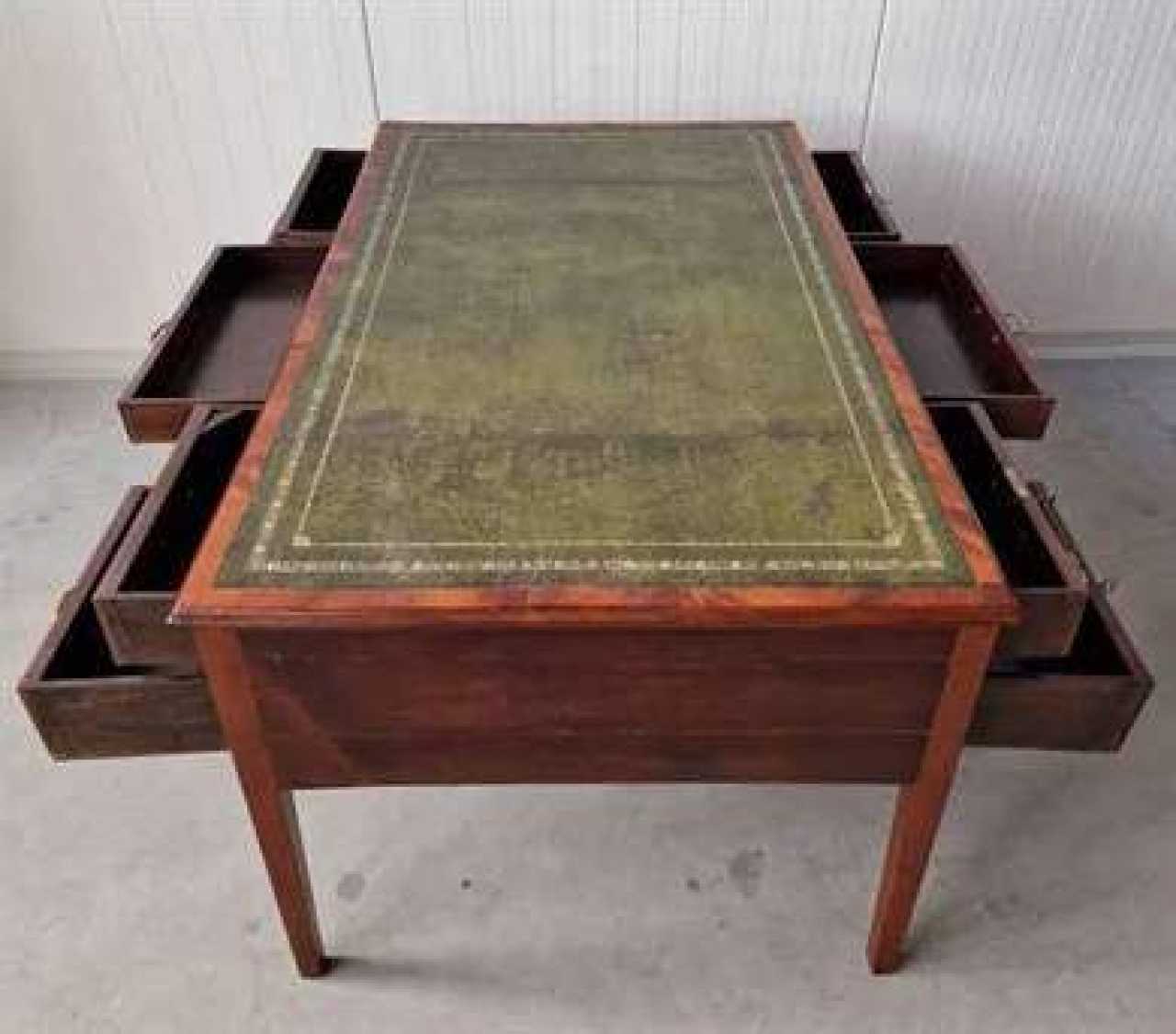 Restored antique two-sided desk.Restored.Mahogany, leather, brass. England.1860s.Dimensions: height 77cm; length 143cm; width 90 cm.