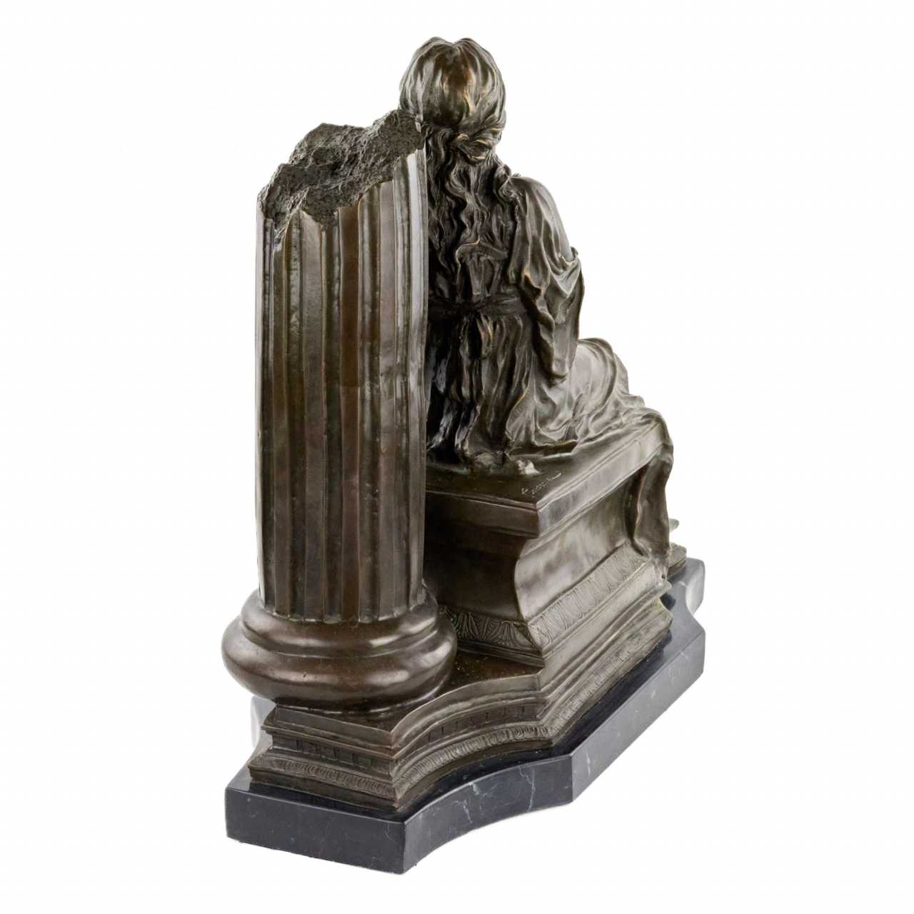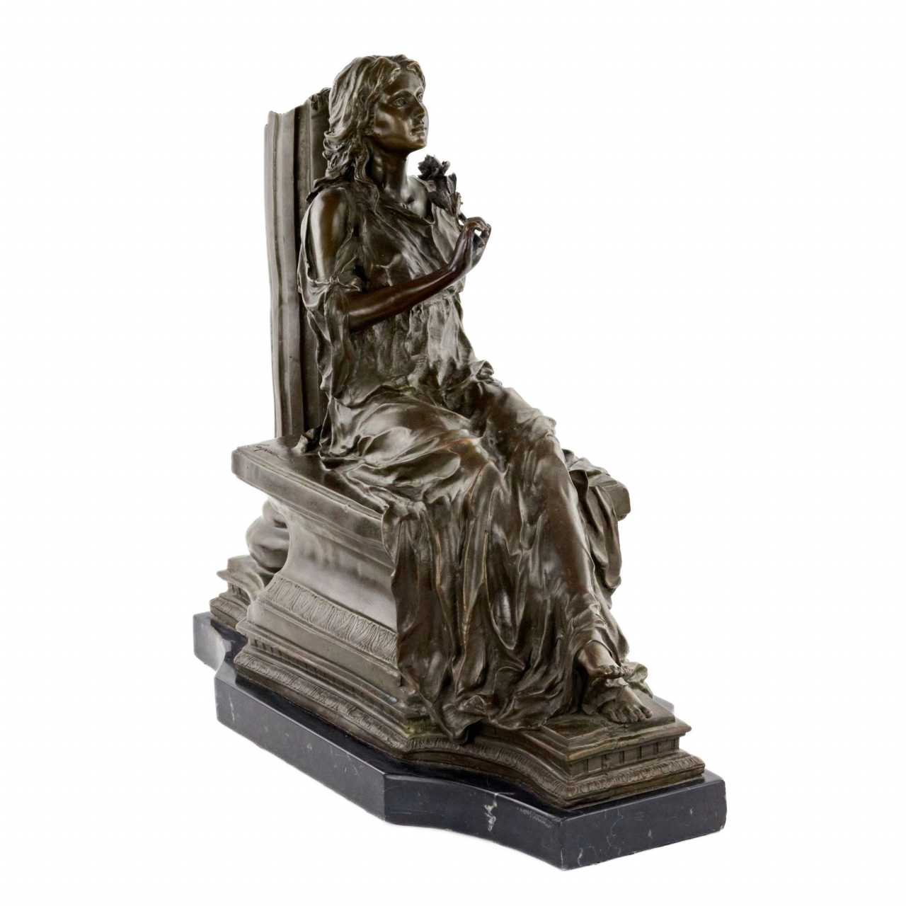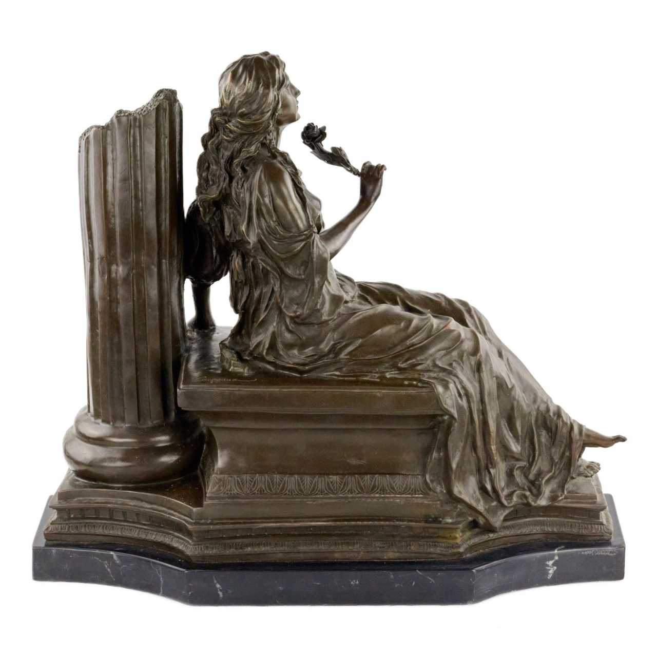 Bronze memorial complex Girl with a Rose. Demonstrates a girl in romantic memories at the wreckage of a column, sitting on a sarcophagus. She breathes in the vibes of collapsed and buried love. All sensual expression of living memories is expressed in the folds of clothes and hair. The sculpture is set on a stone pedestal. Signature: Carpeaus. From Jean-Baptiste Carpeaux (1827-1875). H-45 cm.