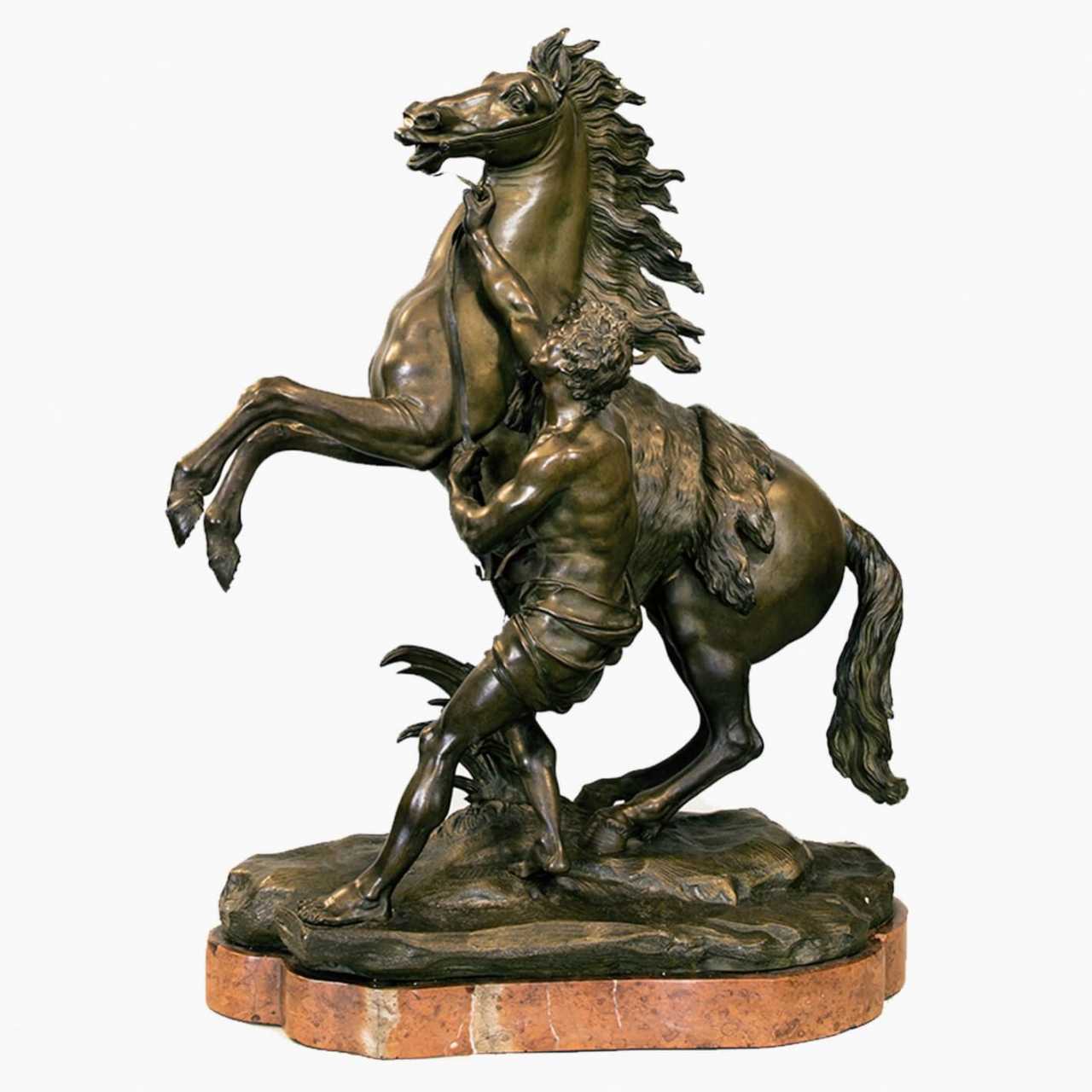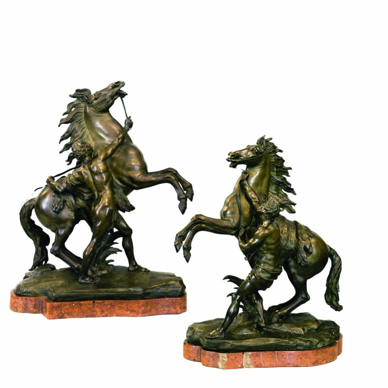 Paired sculptures Horse Tamers or Marley Horses. Marble sculptural group Horse Tamers was created in 1740-1745. Guillaume Coustou the Elder (Guillaume Coustou I, 1677-1746) - a famous French sculptor of the first half of the 18th century, who worked on the decoration of the palaces and parks of Versailles, Marly, Tuileries and Trianon. The sculptures were commissioned by Louis XV from Carrara marble to decorate the terrace of the castle of Marly in the suburbs of Paris. Fed up with tense official images, the royal administration commissioned the sculptor to depict figures of naked youths restraining rearing horses. Provenance: Photo archive of a private collection. The sculptures were part of a private collection located in the Liechtenstein Palace. Stadtpalais Wien, Schloss Vaduz, Liechtenstein, 1945.