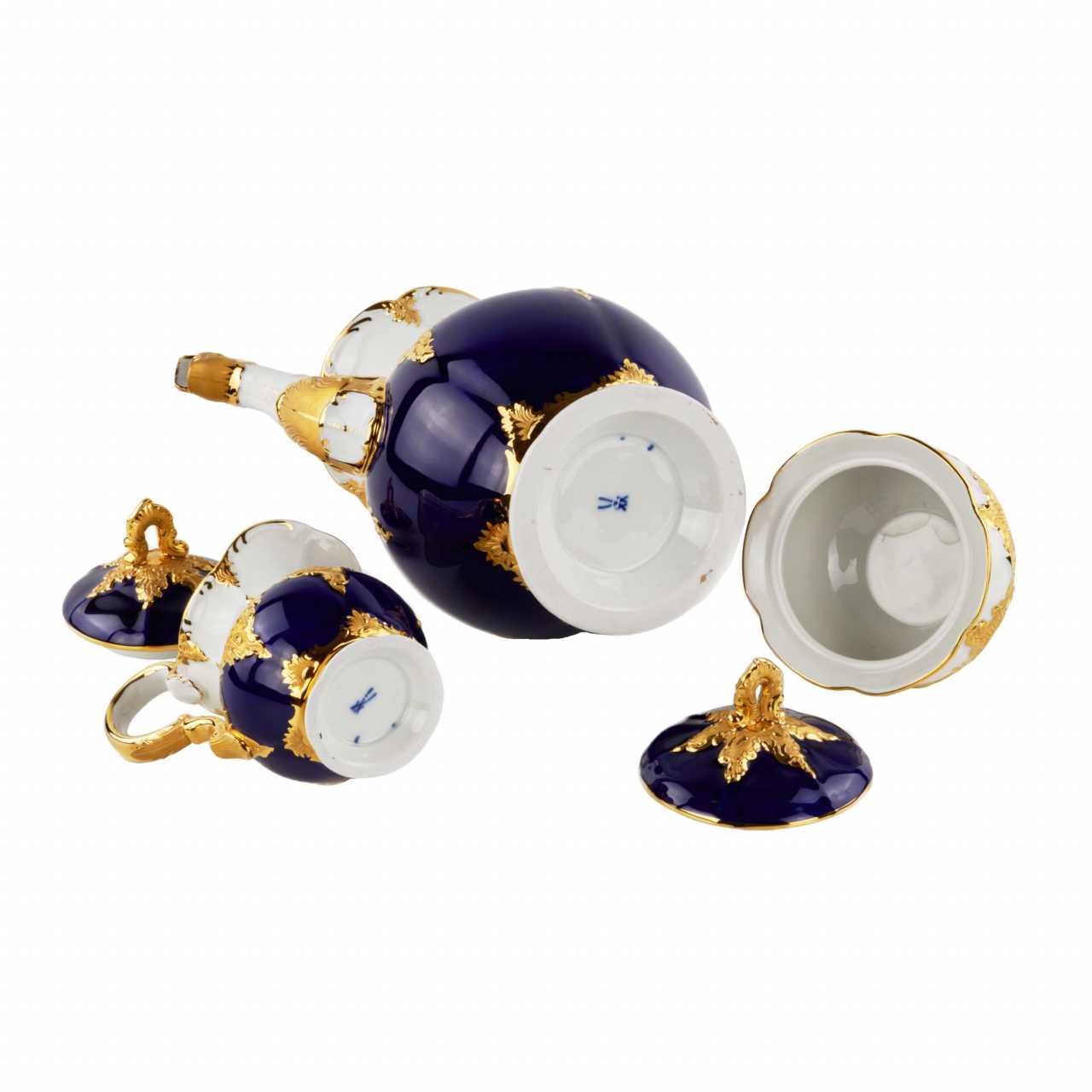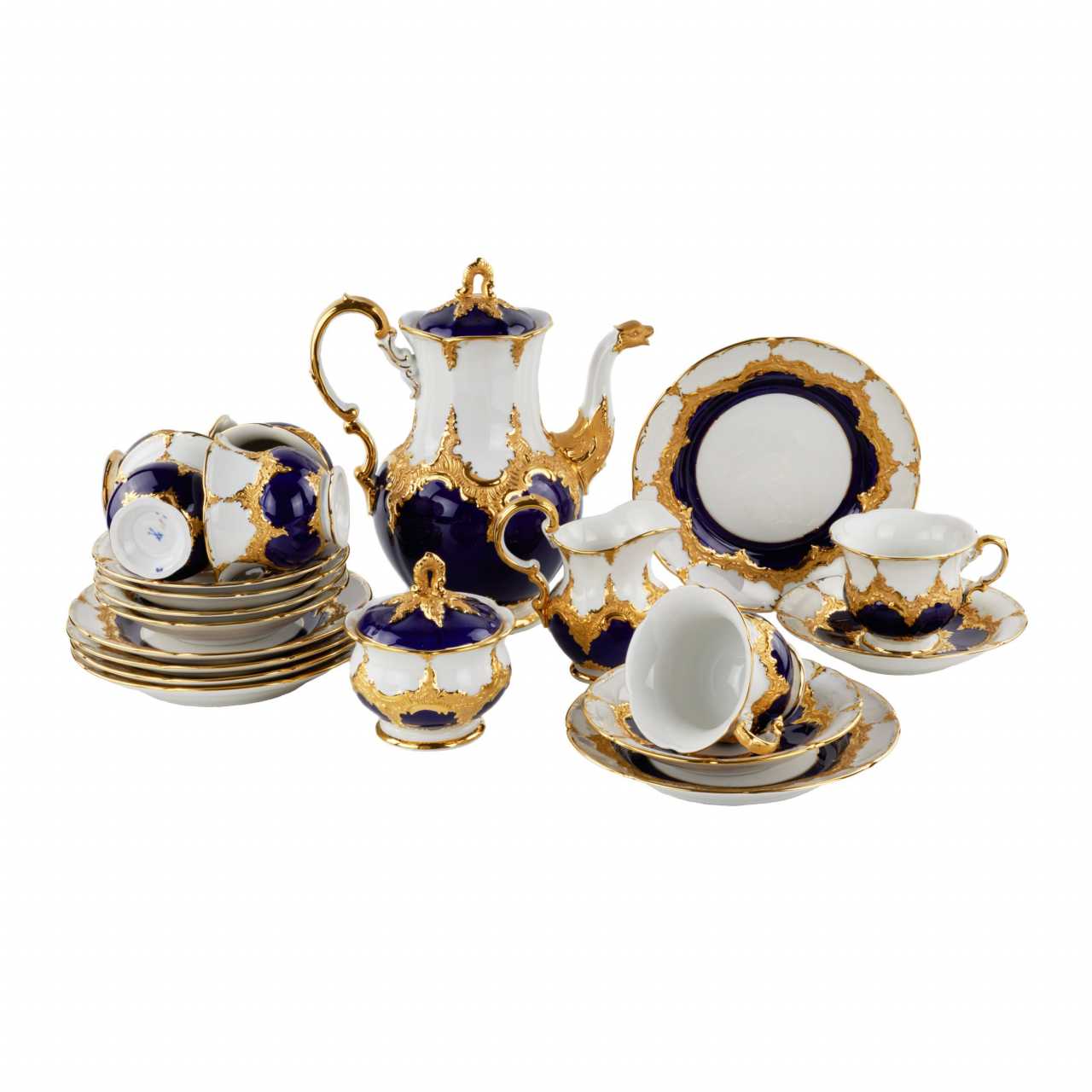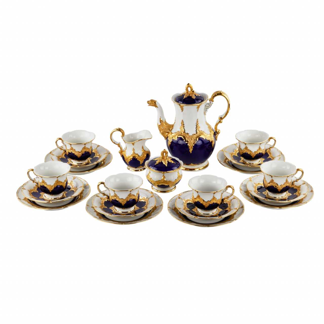 MEISSEN coffee service for six persons, after 1933. Includes: six cups with saucers and dessert plates, coffee pot, sugar bowl and creamer. Effectively decorated with blue cobalt and gold. Coffee pot height: 27cm. Cup height: 8 cm. Saucer diameter: 16 cm. Plate diameter: 20 cm.
