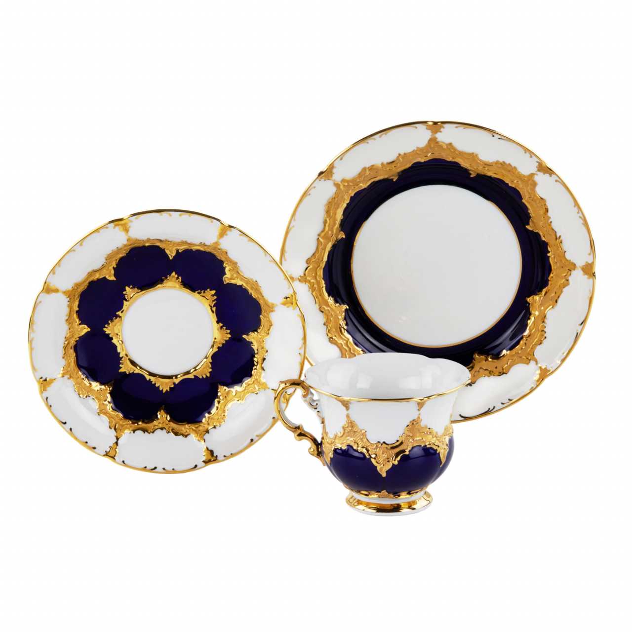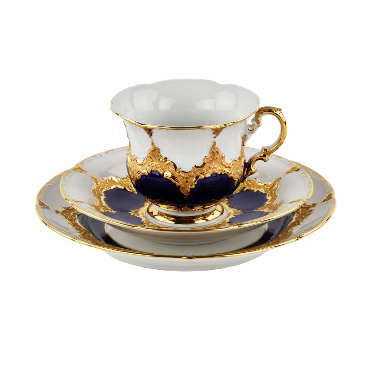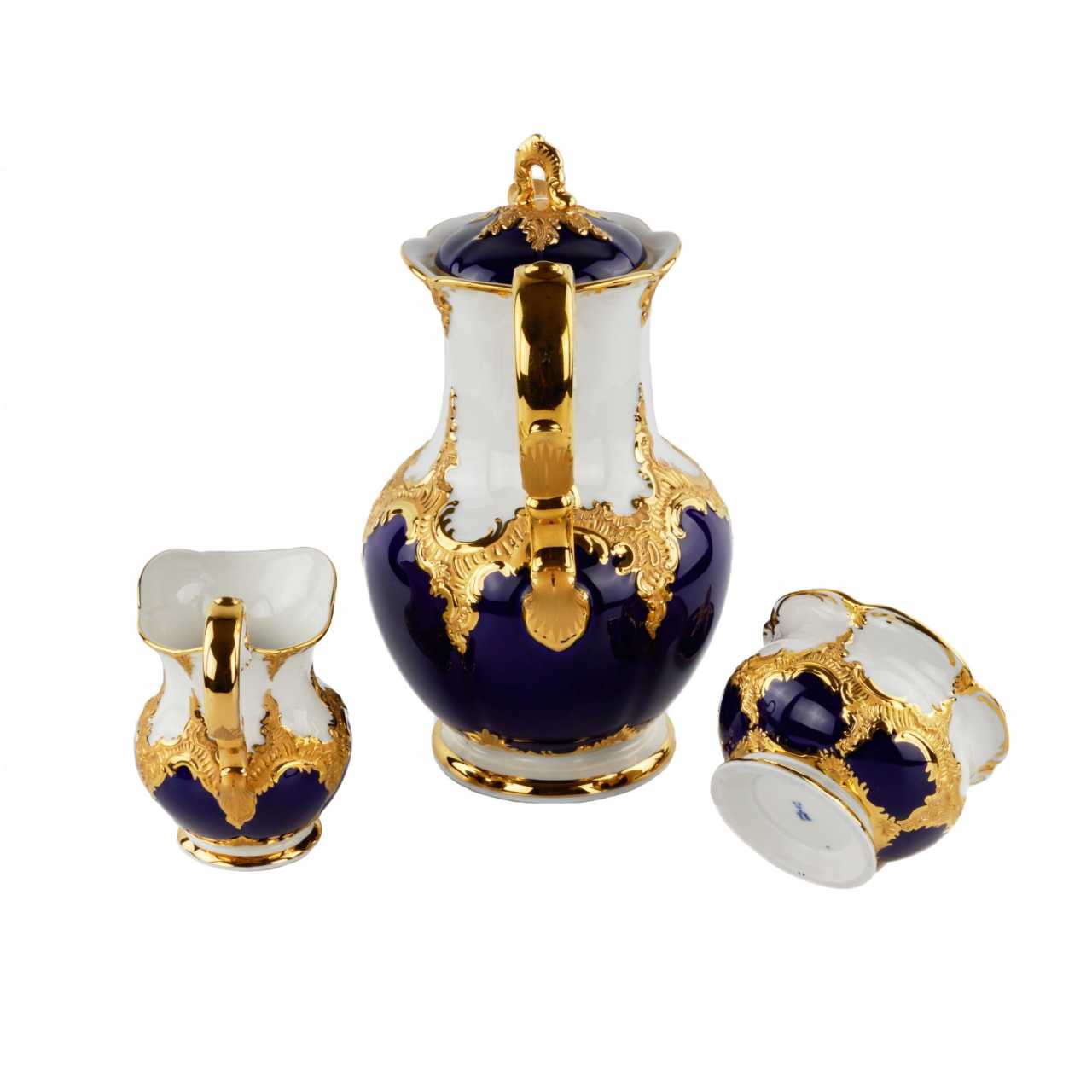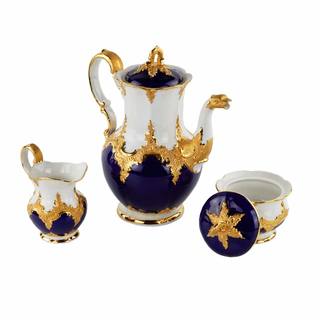 MEISSEN coffee service for six persons, after 1933. Includes: six cups with saucers and dessert plates, coffee pot, sugar bowl and creamer. Effectively decorated with blue cobalt and gold. Coffee pot height: 27cm. Cup height: 8 cm. Saucer diameter: 16 cm. Plate diameter: 20 cm.