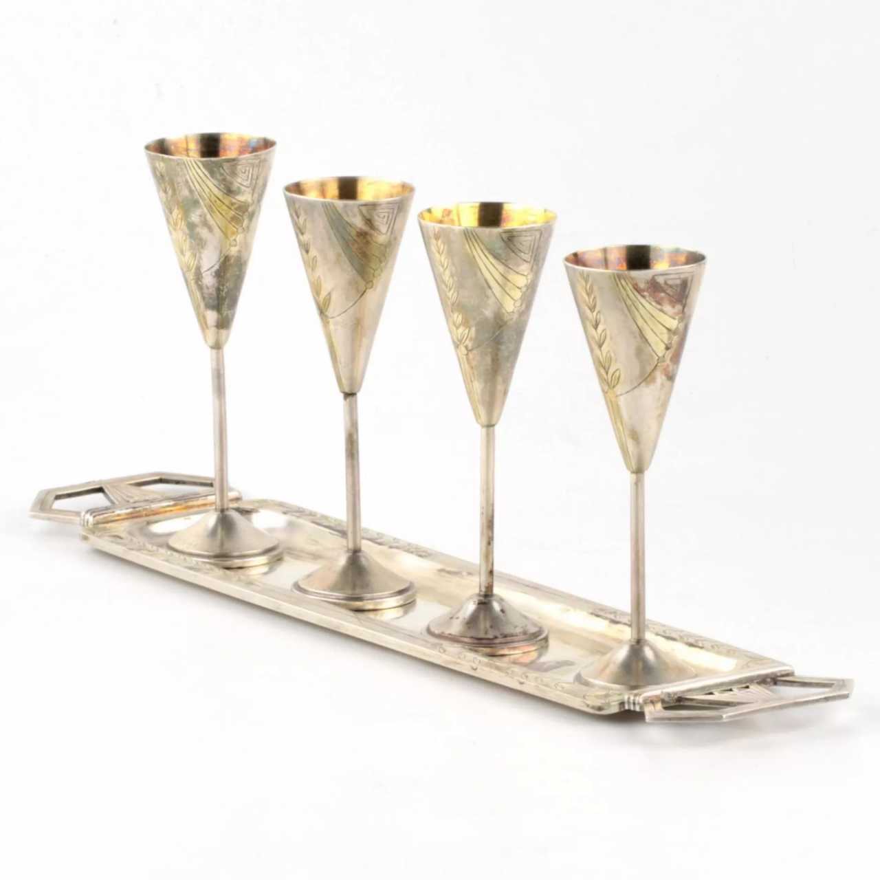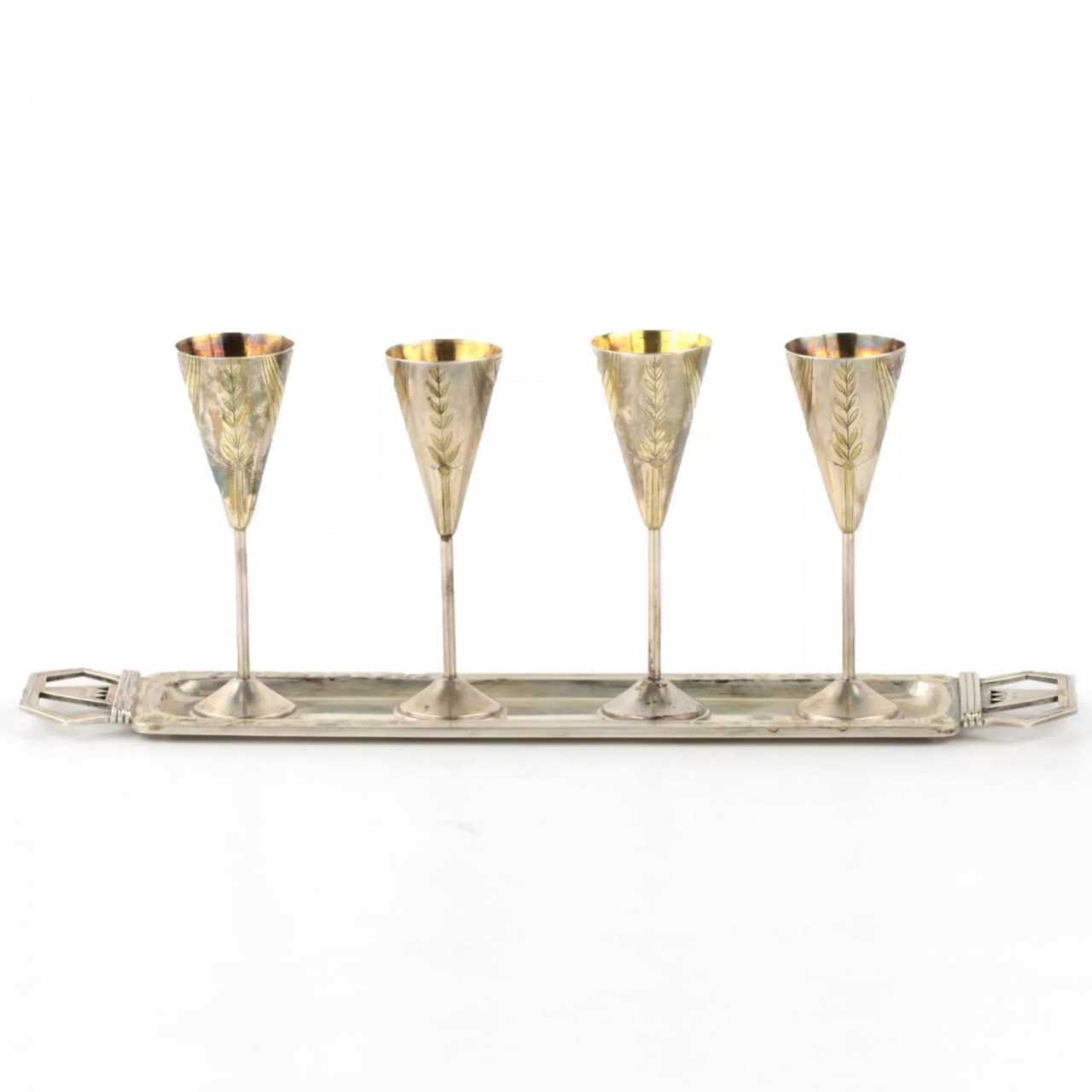 Silver Cognac set in Art Deco Style of 4 glasses with a tray, work of Ivan Khlebnikov. An elongated, rectangular-shaped tray with diamond-shaped handles accepts 4 vertically dominant shot glasses. Their inverted cone, on a high leg, bears a symmetrical ornament in the form of a vertical branch and a stylized theater curtain with meander patterns at the ends. The program combination of silver and gilding favorably emphasizes the ornamental nodes of the composition. Each item has a full stamp: Khlebnikov, Double-headed eagle and Moscow stamp of 84 samples of silver, 1908-1917. Total weight: 264 gr.