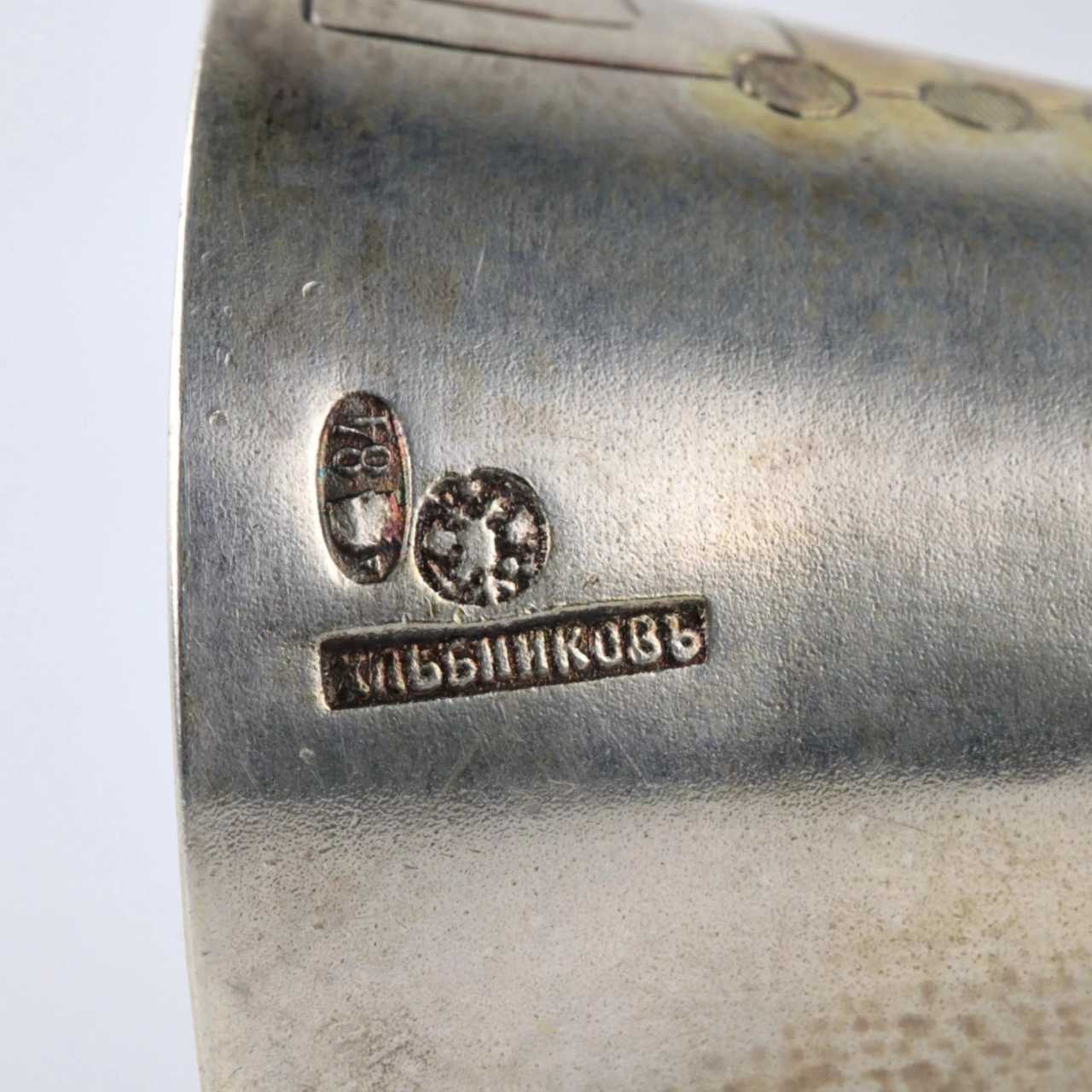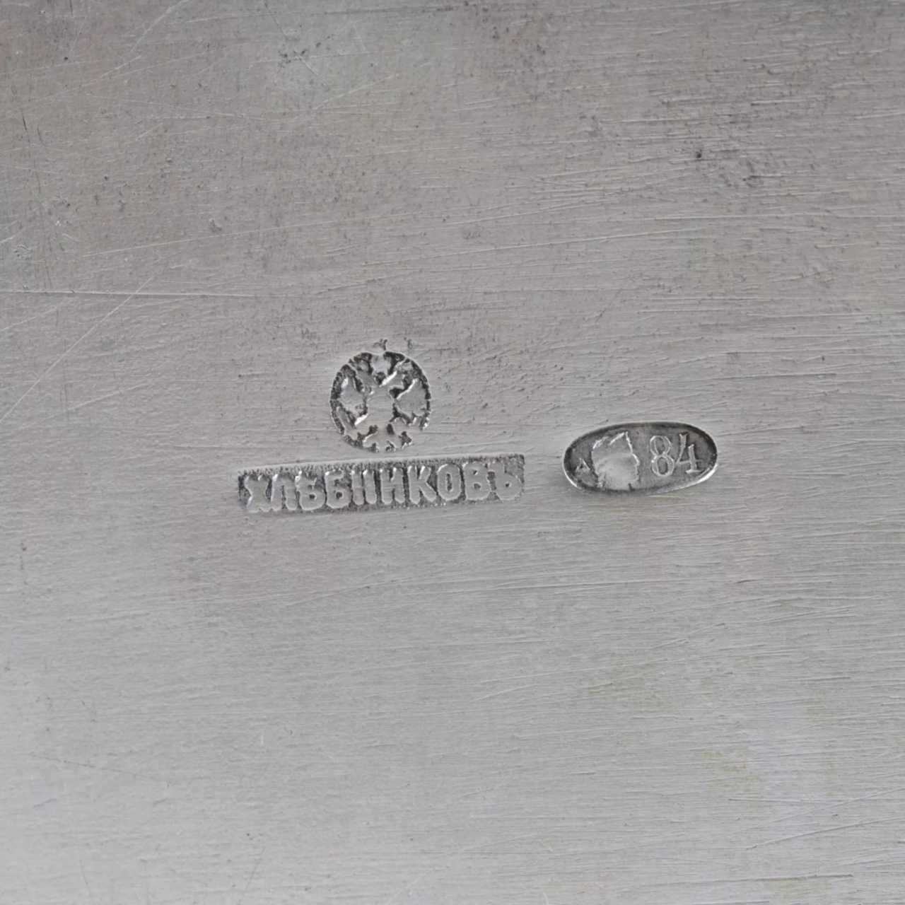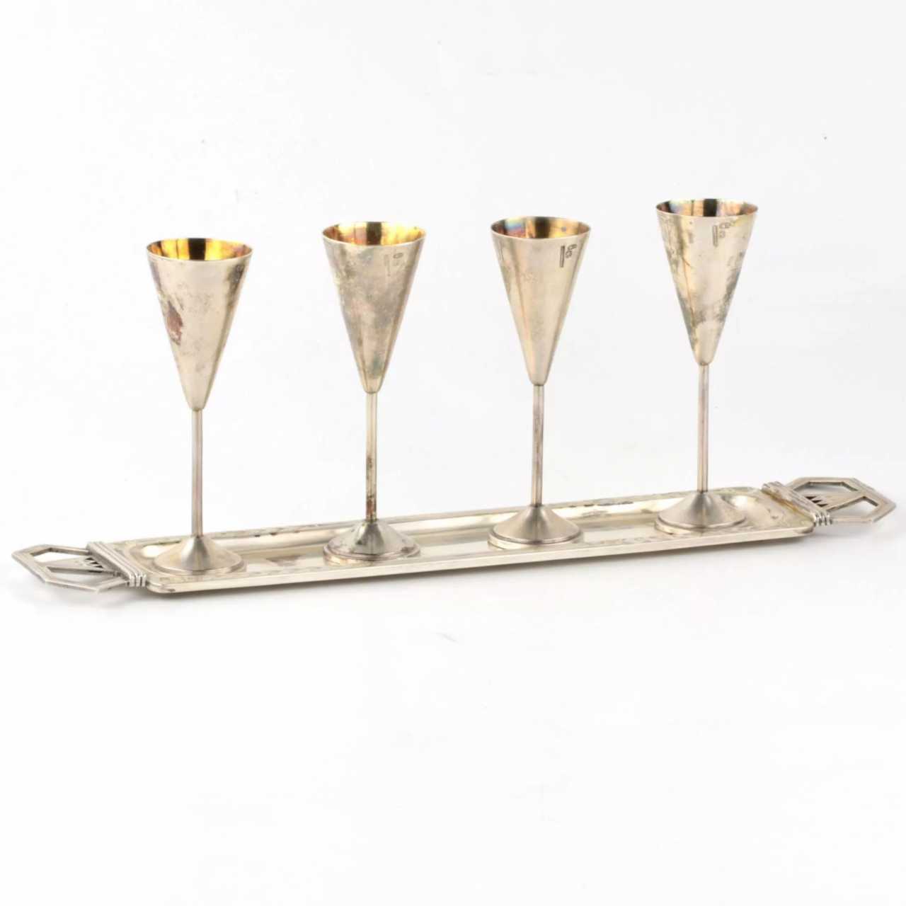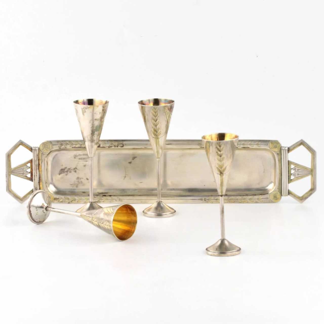 Silver Cognac set in Art Deco Style of 4 glasses with a tray, work of Ivan Khlebnikov. An elongated, rectangular-shaped tray with diamond-shaped handles accepts 4 vertically dominant shot glasses. Their inverted cone, on a high leg, bears a symmetrical ornament in the form of a vertical branch and a stylized theater curtain with meander patterns at the ends. The program combination of silver and gilding favorably emphasizes the ornamental nodes of the composition. Each item has a full stamp: Khlebnikov, Double-headed eagle and Moscow stamp of 84 samples of silver, 1908-1917. Total weight: 264 gr.