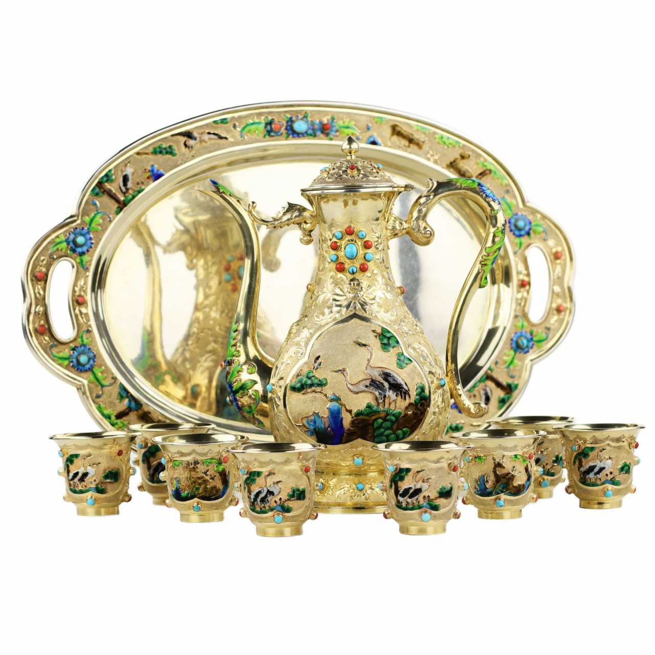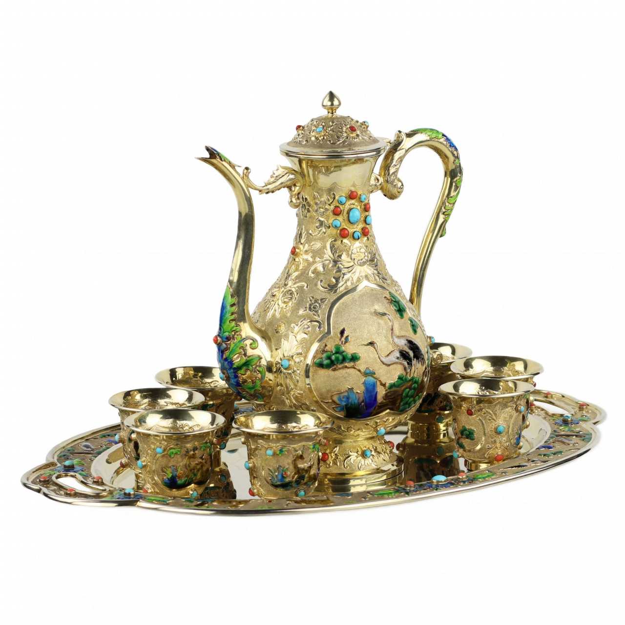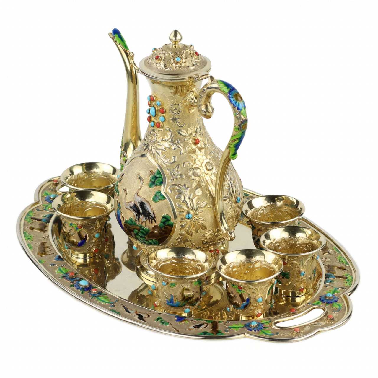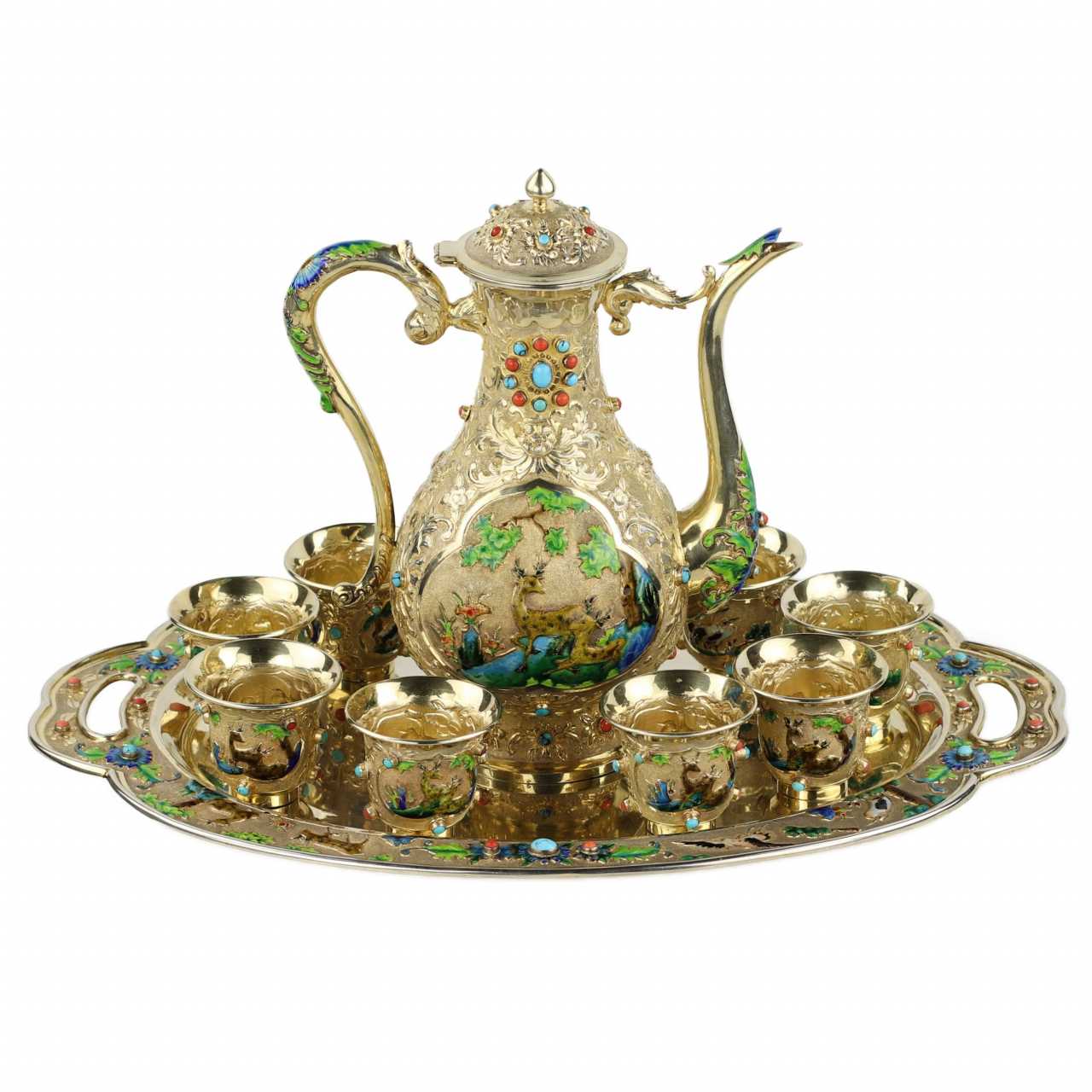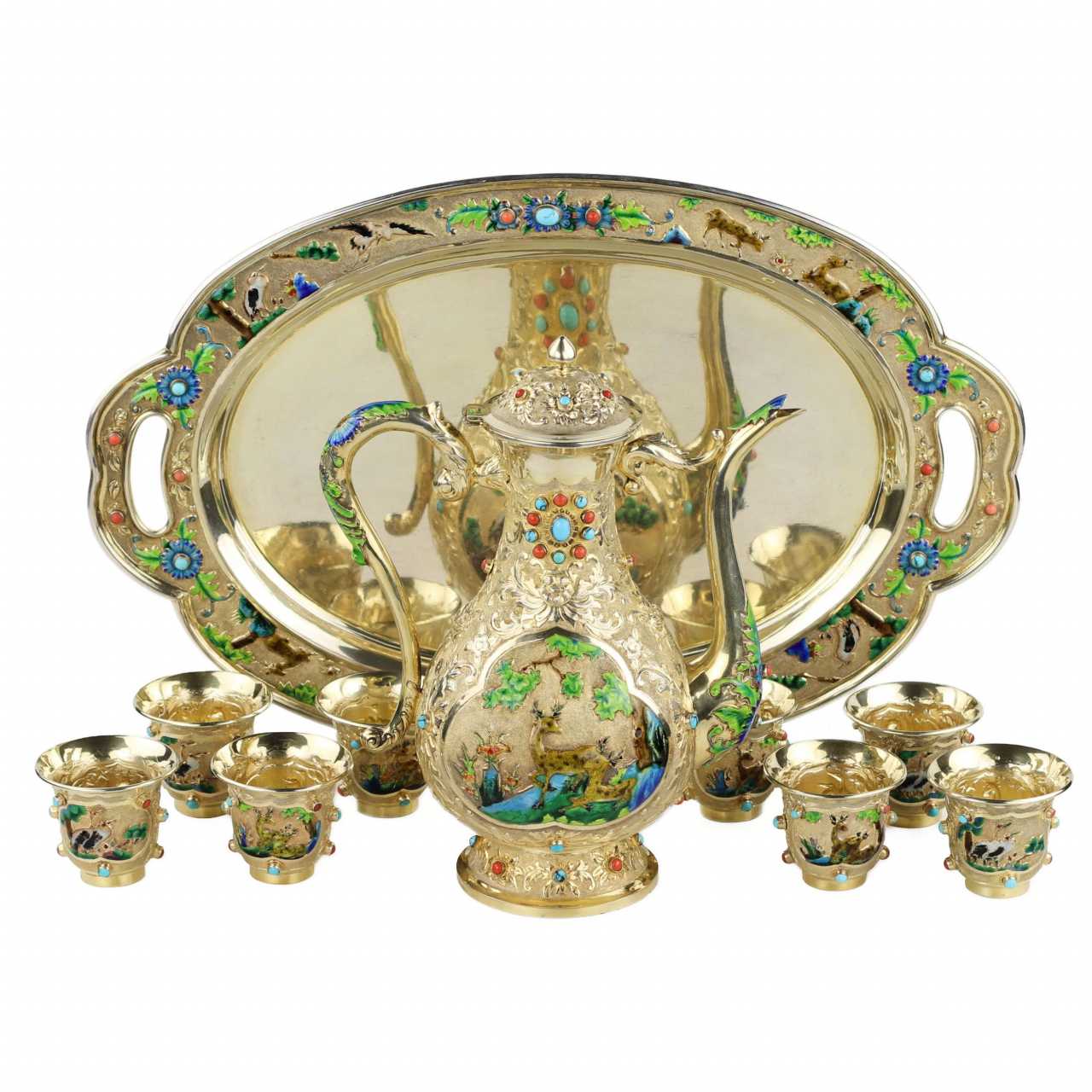 Chinese gilt silver tea set with rich chased and embossed ornament in the form of a plant pattern, decorated with enamel drawings depicting natural scenes with deer and cranes, made in the Chinese national style for the European market. The product is inlaid with natural coral and turquoise cabochons, which gives it a special charm and uniqueness. The set includes a teapot, eight cups and an oval tray. Hallmarks: swan hallmark, SILVER inscription. Dimensions: Teapot - Height 23 x 19 cm, Tray 38.5 x 26 cm, Cups: 4.8 x 5.5 cm. Weight: 1513 grams.