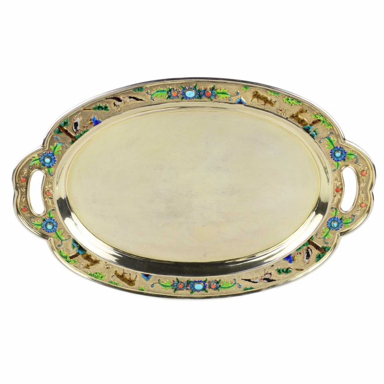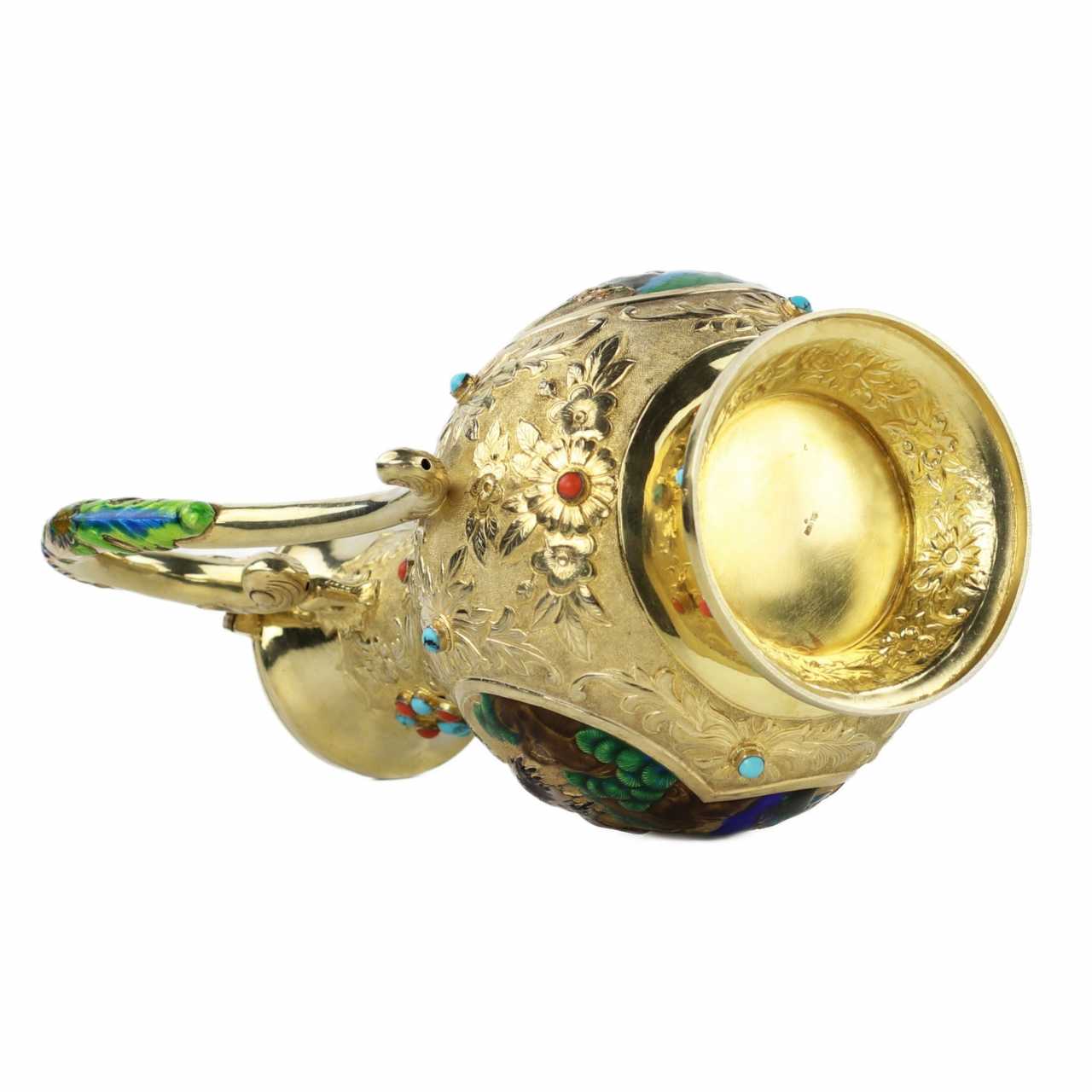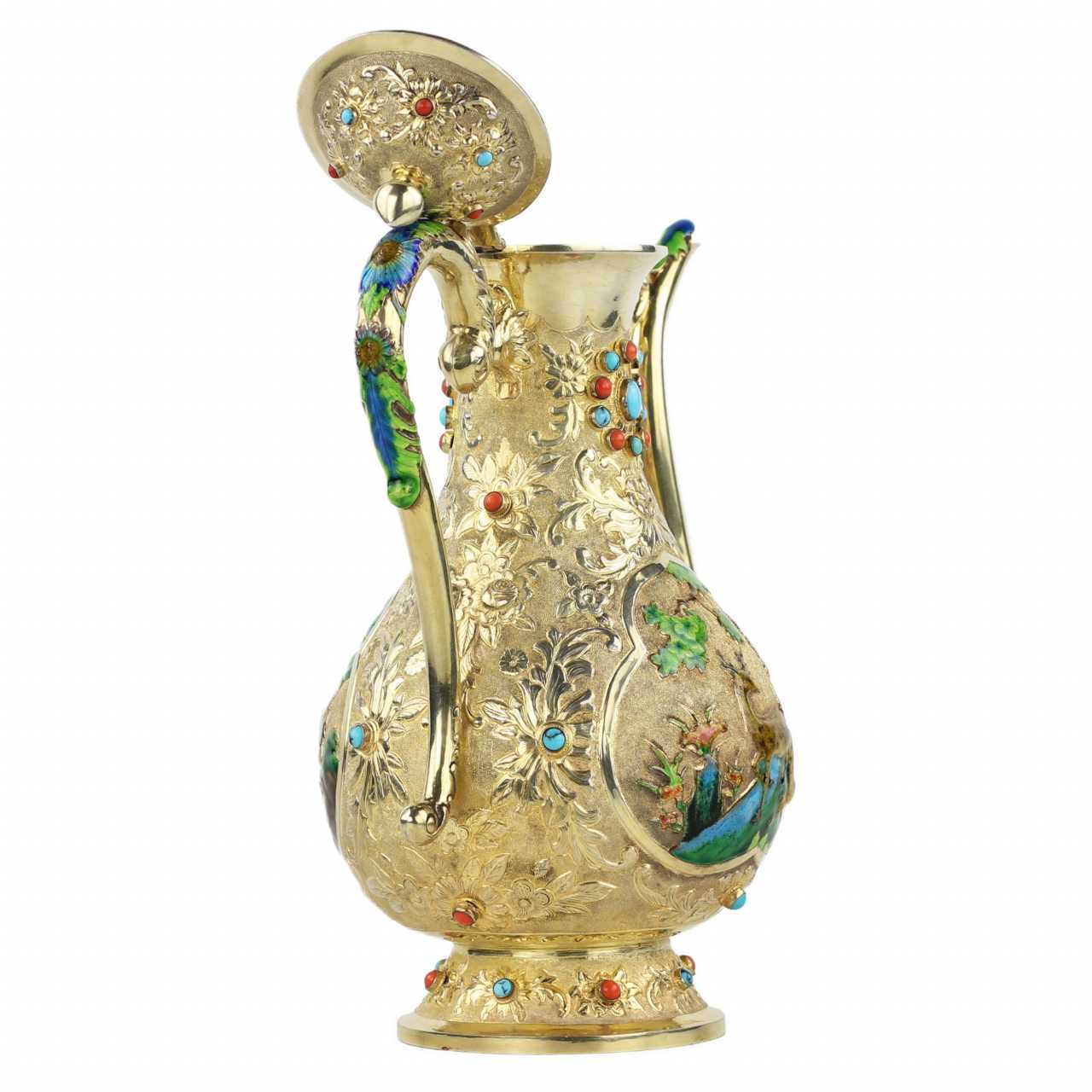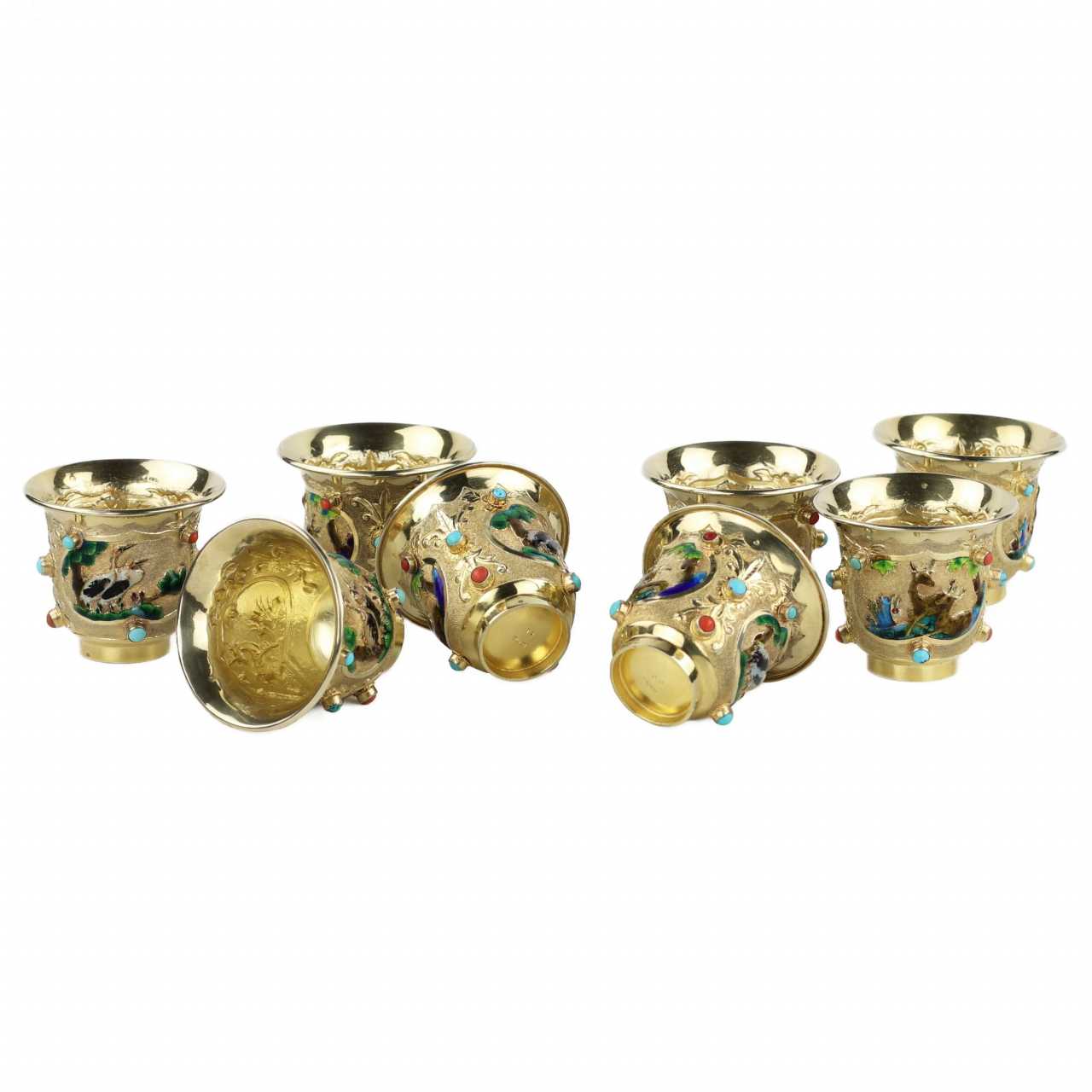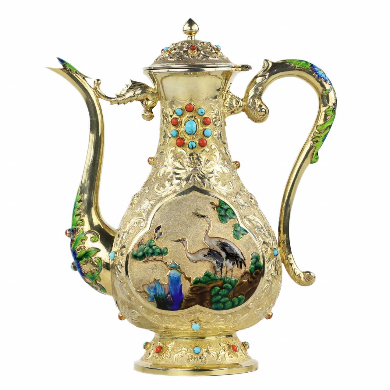 Chinese gilt silver tea set with rich chased and embossed ornament in the form of a plant pattern, decorated with enamel drawings depicting natural scenes with deer and cranes, made in the Chinese national style for the European market. The product is inlaid with natural coral and turquoise cabochons, which gives it a special charm and uniqueness. The set includes a teapot, eight cups and an oval tray. Hallmarks: swan hallmark, SILVER inscription. Dimensions: Teapot - Height 23 x 19 cm, Tray 38.5 x 26 cm, Cups: 4.8 x 5.5 cm. Weight: 1513 grams.