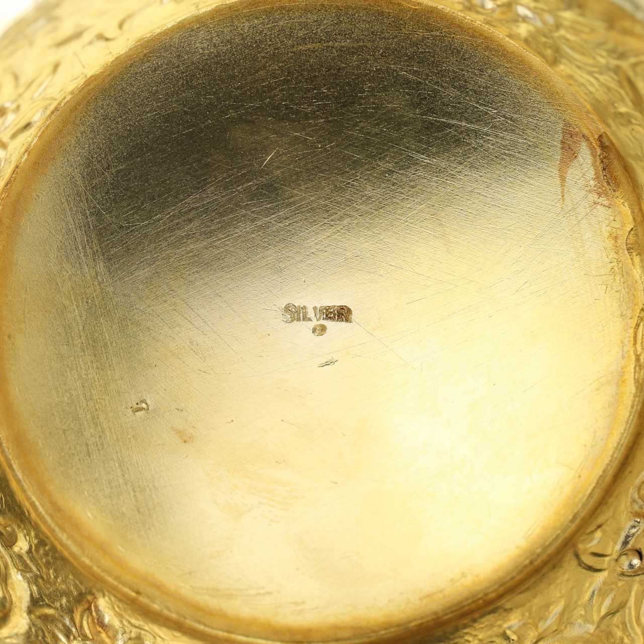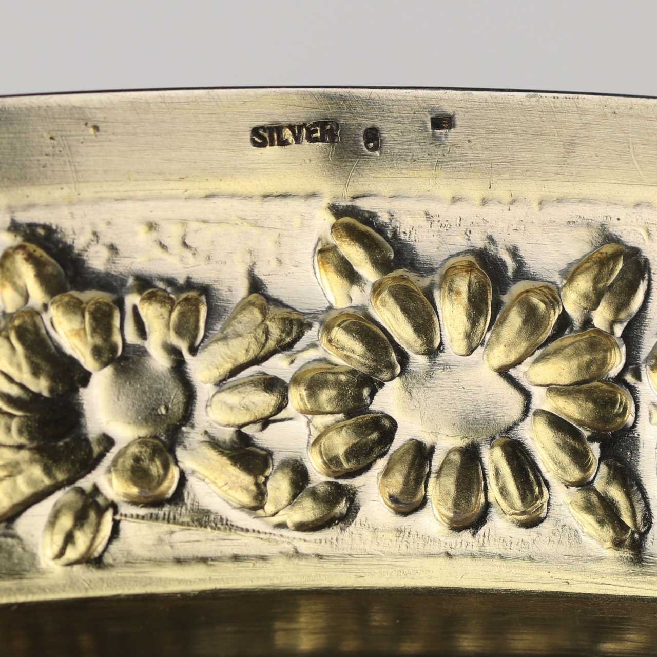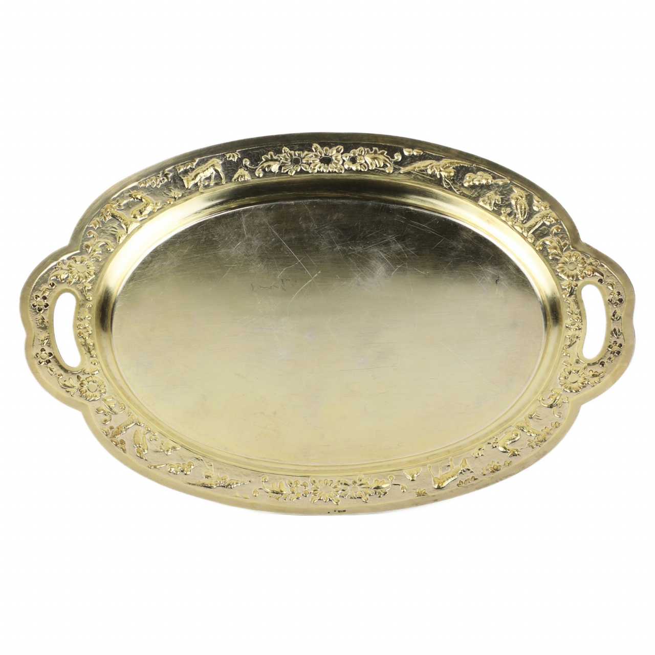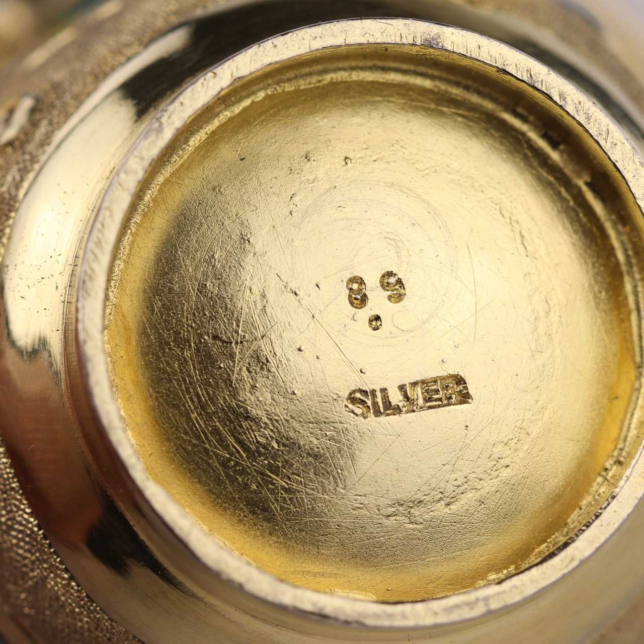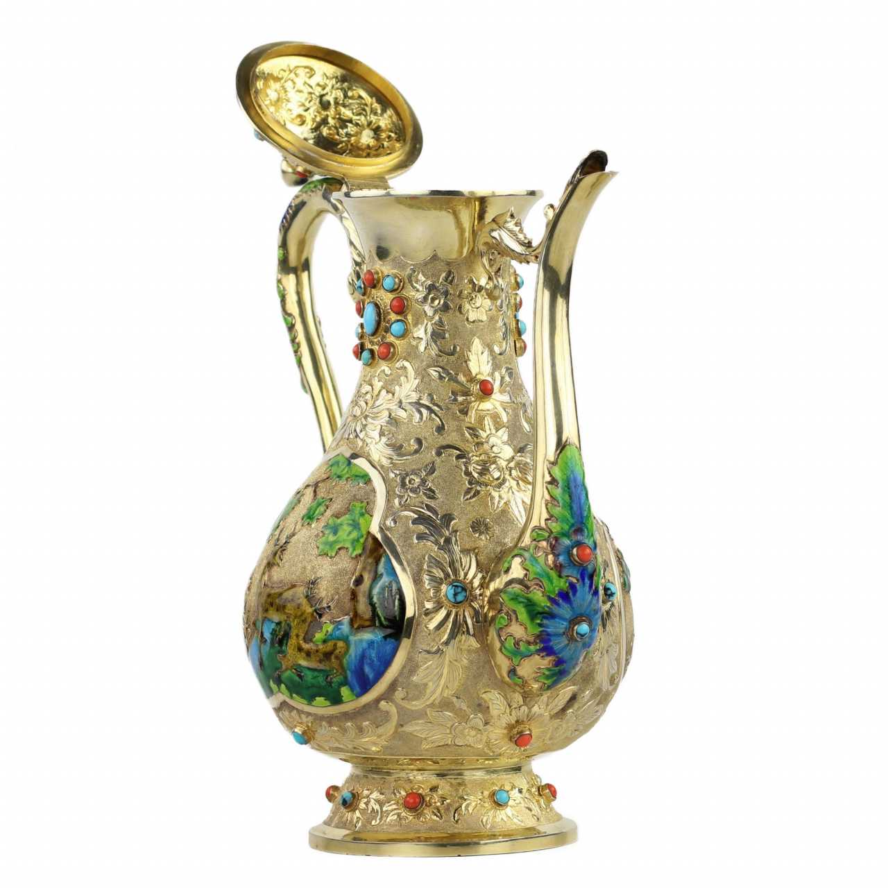 Chinese gilt silver tea set with rich chased and embossed ornament in the form of a plant pattern, decorated with enamel drawings depicting natural scenes with deer and cranes, made in the Chinese national style for the European market. The product is inlaid with natural coral and turquoise cabochons, which gives it a special charm and uniqueness. The set includes a teapot, eight cups and an oval tray. Hallmarks: swan hallmark, SILVER inscription. Dimensions: Teapot - Height 23 x 19 cm, Tray 38.5 x 26 cm, Cups: 4.8 x 5.5 cm. Weight: 1513 grams.