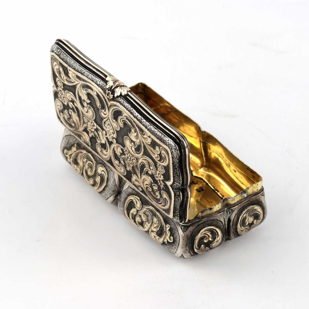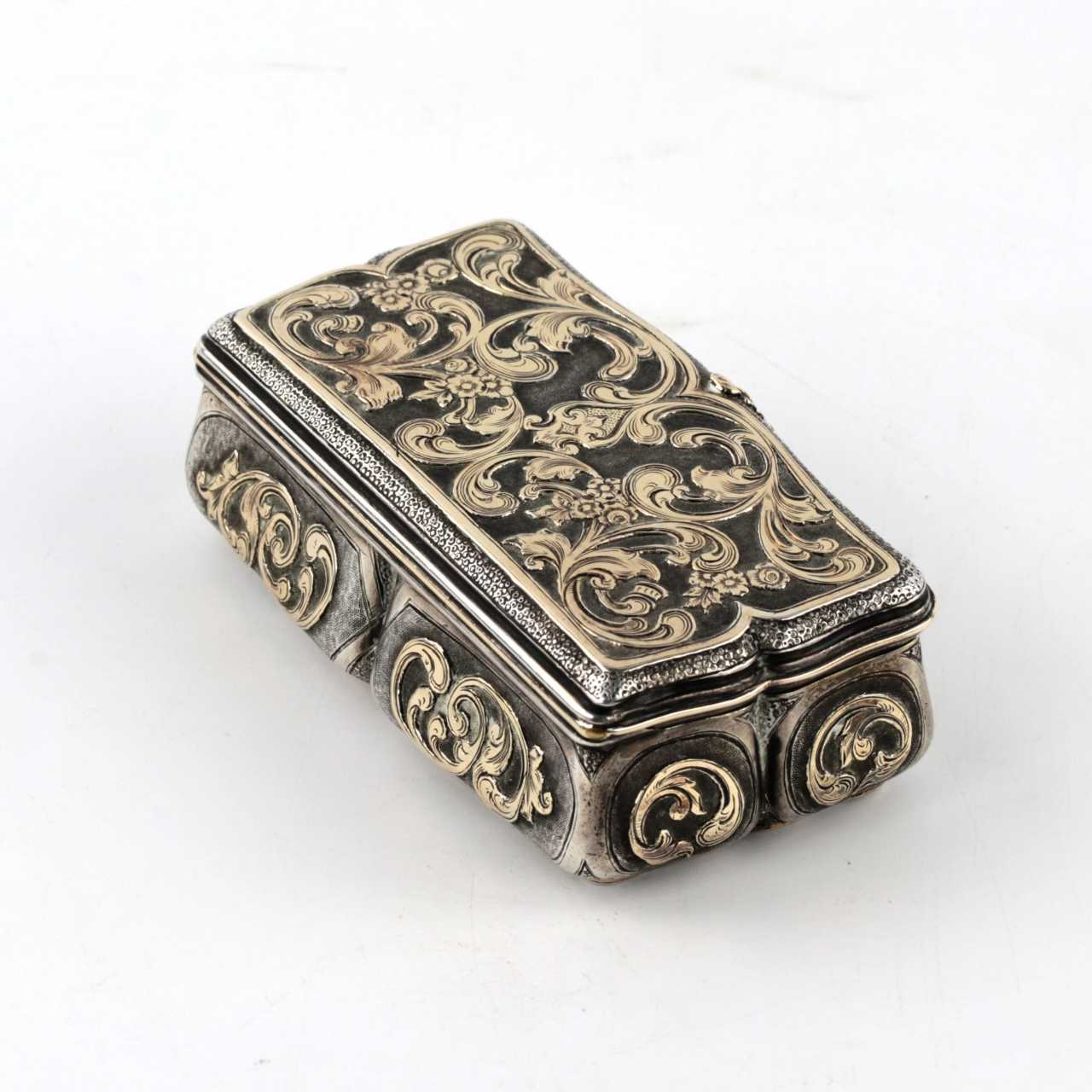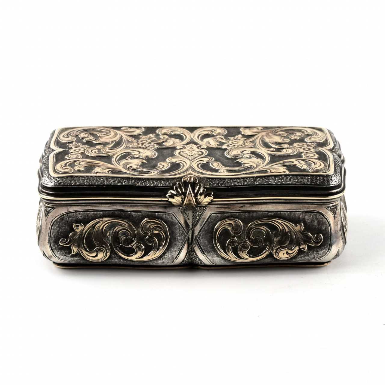 Russian silver snuffbox with gold decor. Mid 19th century. Silver 84 Gilding Neo-baroque Mid-19th century