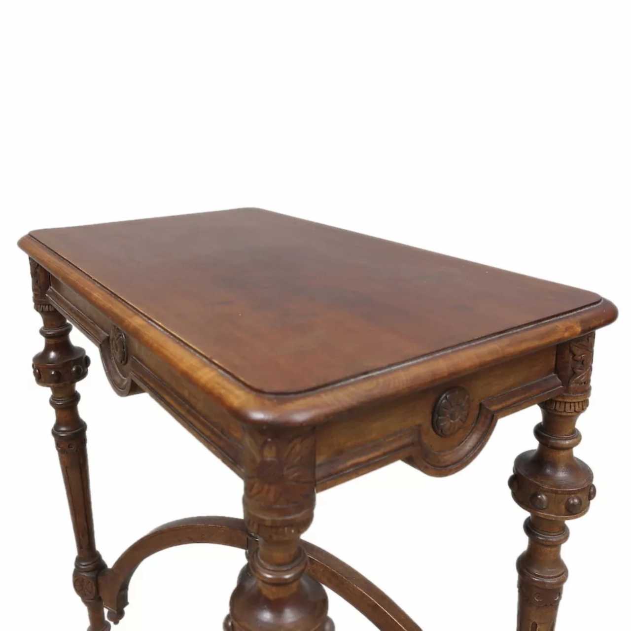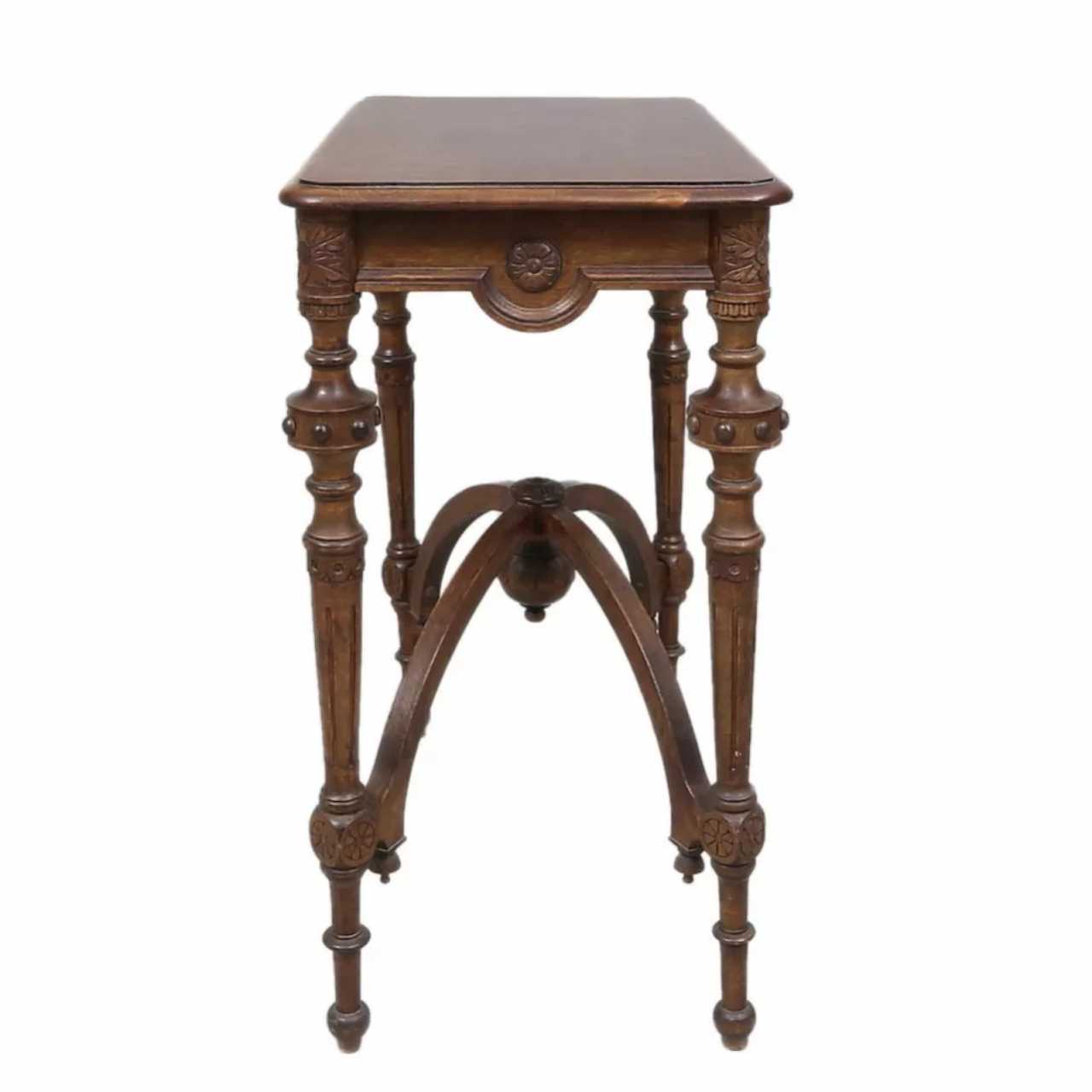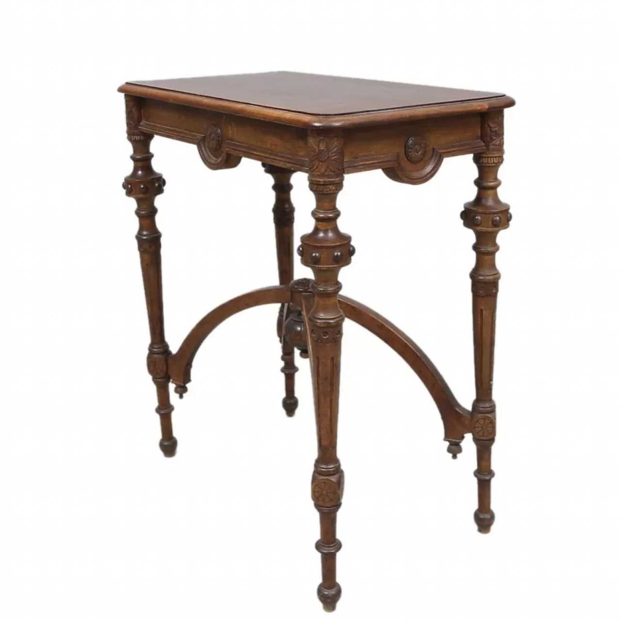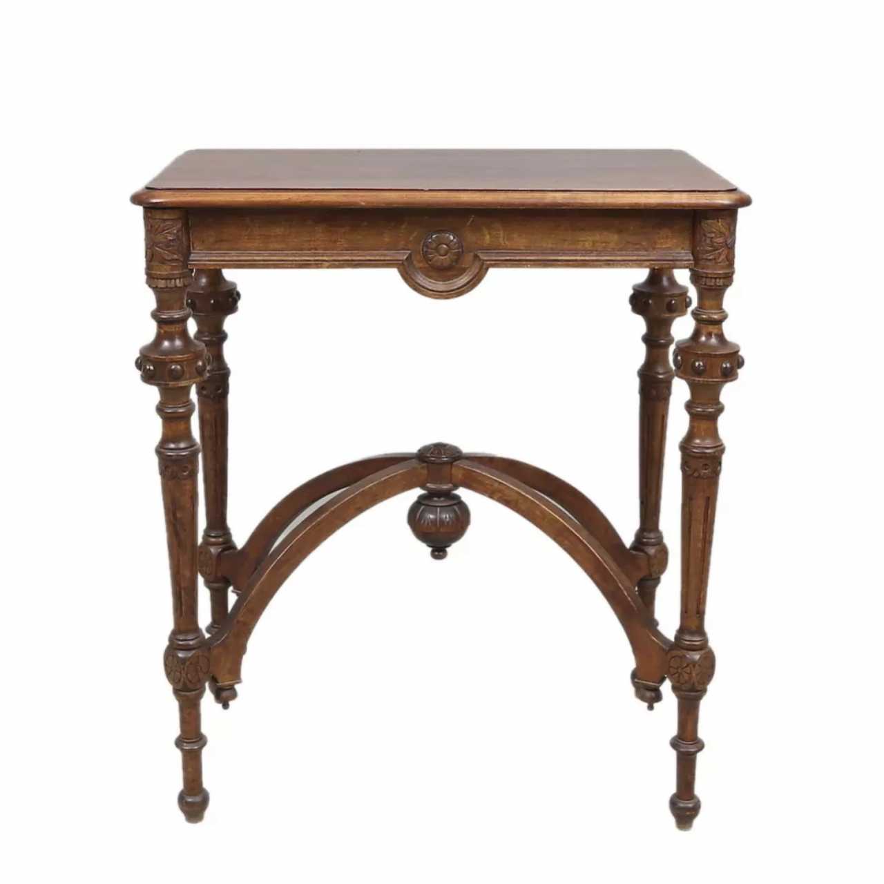 A graceful, if somewhat heavy, coffee table in walnut wood with high curved base arches in the style of Napoleon III. Renaissance features: maces-balusters of arches with a hanging tongue, arched body panels - draw a unique and cozy outline of the table. 75x67x40cm. 1880s.