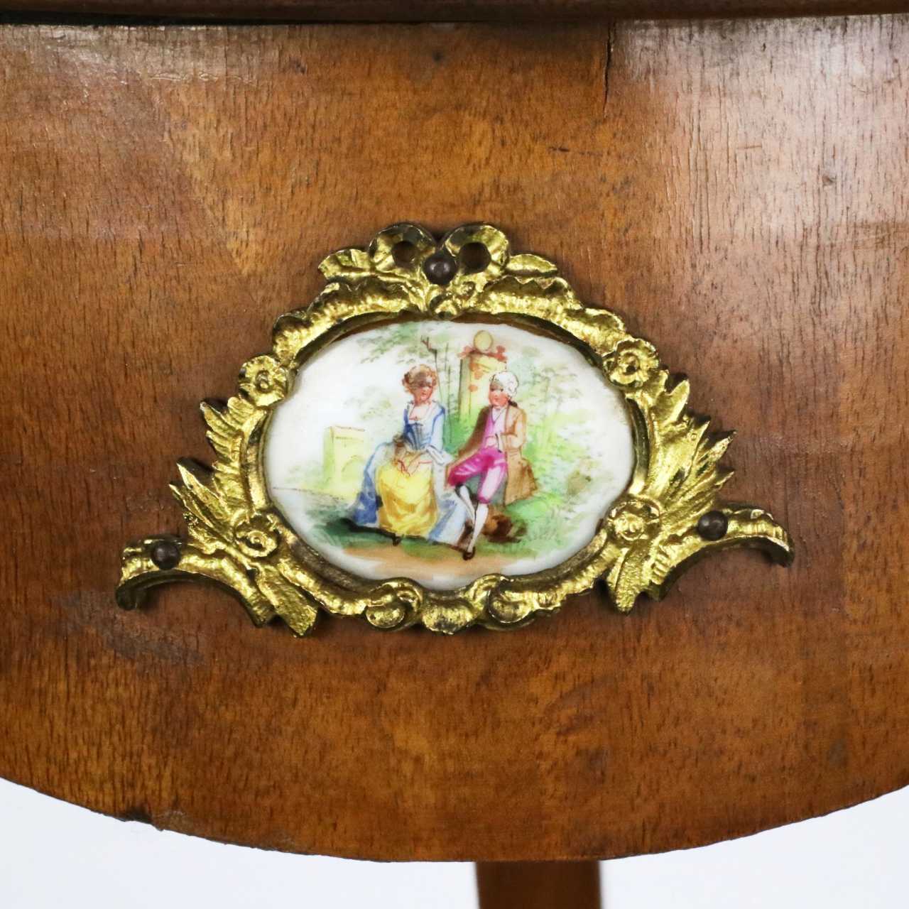 Round, console table with gallant scenes on porcelain medallions and brass-bronze decor in the third rococo style. Early 20th century. Dimensions: 79x30 cm.